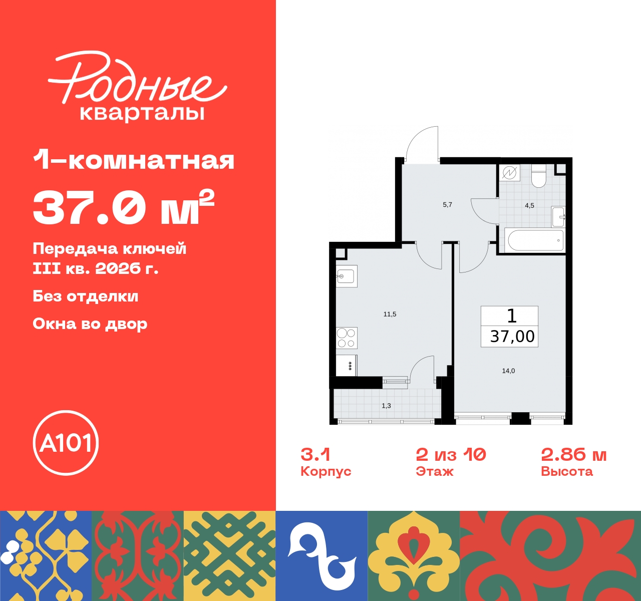 Продается 1-комн. квартира в ЖК "Родные кварталы" на 2 этаже. Квартира без отделки, после получения ключей можно делать ремонт. Общая площадь: 37 кв.м., жилая: 14 кв.м., площадь просторной кухни-столовой: 11.5 кв.м. Все окна выходят на одну сторону. В квартире одна лоджия, один совмещенный санузел. Высота потолков 2.95 м. Дом монолитный, черырехподъездный, высотой 10 этажей. Квартира находится во 2-й секции в корпусе 3.1. На этаже 5 квартир. В подъезде 1 грузовой лифт. Начало строительства - 2 квартал 2024 года. Окончание строительства - 3 квартал 2026 года. Оформление сделки по договору долевого участия. Артикул квартиры по базе застройщика 96К-3.1-47. ПРЕДЛОЖЕНИЯ ОТ ЗАСТРОЙЩИКА В ОКТЯБРЕ 2025: Ипотека от 13,9 % для всех! На весь срок. "Семейная ипотека" вернулась. Ставка от 3,5 % на весь срок! Без удорожания! Выгодное ипотечное комбо: Ипотека от 2200 р./мес. и от 6 % после рождения ребёнка! Ипотека для всех "Держи пять!" - ставка 5 % на 2 года! *более подробную информацию по скидкам и акциям уточняйте в отделе продаж Новый жилой комплекс "Родные кварталы" строится в уютной, экологически благополучной локации на юго-западе столицы. В ближайшем окружении – ухоженные малоэтажные посёлки и живописный Ульяновский лесопарк. Благодаря этому из окон откроются вдохновляющие виды, которые не исчезнут со временем за фасадами многоэтажек. Через весь район пройдёт главный бульвар, который свяжет набережную, жилые кварталы и площади в единое дружелюбное пространство, органично наполненное узнаваемыми элементами культурных традиций разных народов. В жилом комплексе создаются условия для комфортного отдыха и занятий спортом всех жителей. Здесь можно прогуляться и отдохнуть в лесопарке на берегу ручья, позаниматься на тренажёрах под открытым небом и спортивных площадках. Для малышей построят игровые комплексы, развивающие силу, координацию и ловкость. Всего в жилом комплексе будет оборудовано 6 га территории для спокойного отдыха и около 9 га — для активного. Подъезды в домах освещены в любое время суток, входы и вестибюль хорошо просматриваются с улицы. Витражное остекление обеспечивает приток естественного света днём, а вечером зажигаются светильники. В отделке домов используется сочетание вентилируемого фасада с облицовкой из фибробетонной плитки и штукатуркой. Комфортная высота домов соразмерна человеку и в среднем составляет 10 этажей. Все дома обеспечены собственными подземными паркингами. В них размещаются машино-места и кладовые. В паркинг или кладовую можно спуститься на лифте или по лестнице. В комплексе появятся бытовые сервисы, магазины, аптеки и другие торгово-бытовые объекты. В жилом районе «Родные кварталы» будут построены: - образовательный центр: школа на 1300 учеников и детский сад на 250 малышей, - два детских сада на 200 мест каждый (один из них сдаётся в 1-й очереди). В транспортной доступности уже работают: - школа № 41 и детский сад — по Боровскому шоссе, - школа № 2057 и детский сад — на запад от района, в дер. Марушкино. ЖК «Родные кварталы» строится в Новомосковском округе столицы, в 15 минутах на автомобиле от аэропорта «Внуково». Район обеспечен удобными выездами на три крупные современные автотрассы. Здесь уже работает и активно развивается система наземного общественного транспорта, включая междугородние рейсы. Интенсивное развитие локации обеспечивают две дей