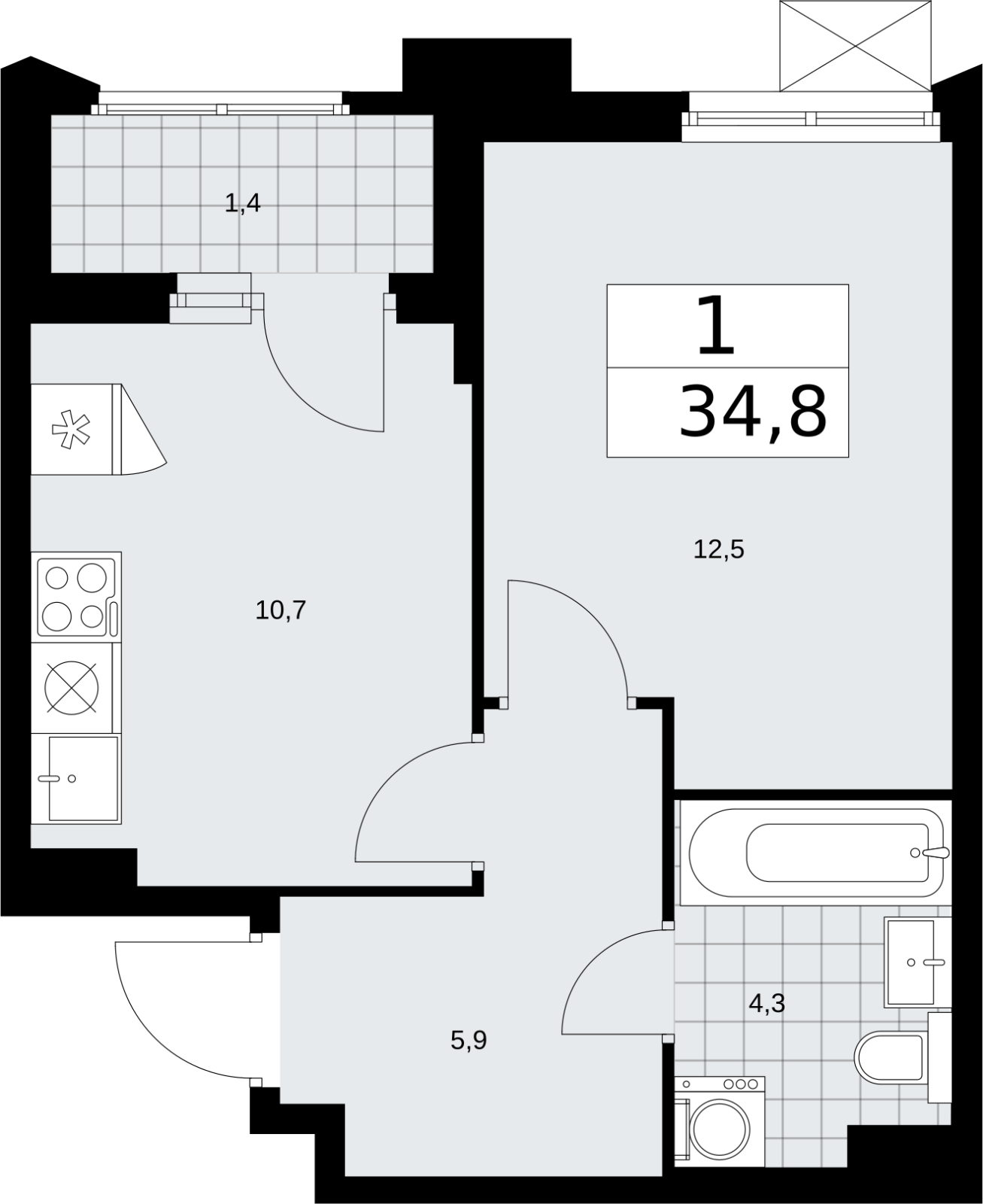- Общая площадь 34.8 м²