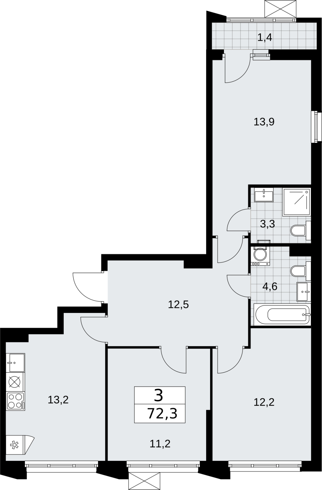 - Общая площадь 72.3 м²