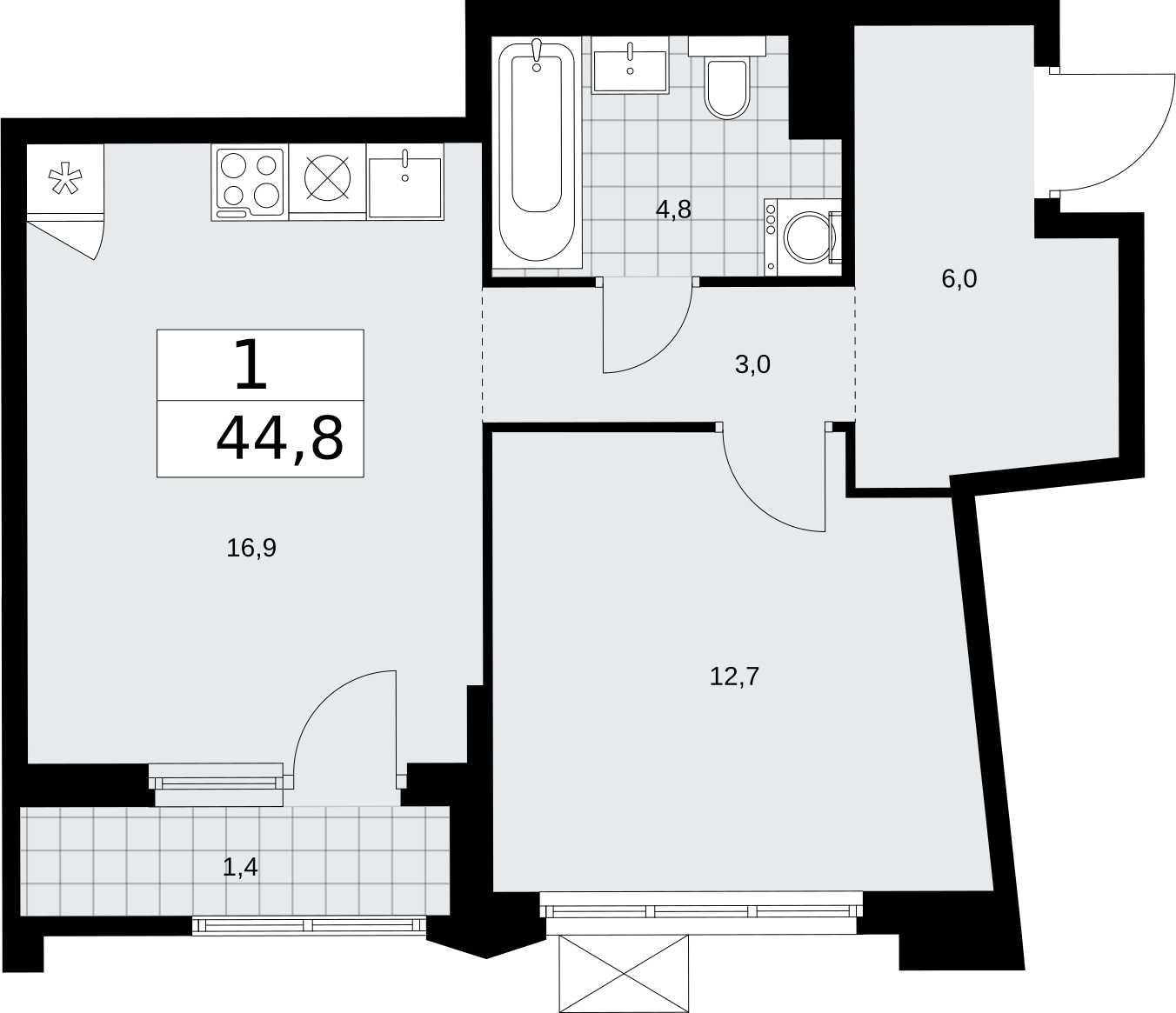 Однокомнатная квартира в ЖК "Деснаречье" на 7 этаже. Квартира без отделки, новый владелец может сделать ремонт по своему проекту. Общая площадь: 44.8 кв.м., жилая: 12.7 кв.м., площадь просторной кухни-столовой: 16.9 кв.м. Угловая квартира, окна oбecпeчивaют paвнoмepнoe ocвeщeниe в тeчeниe дня. В квартире одна лоджия, один совмещенный санузел. Высота потолков 2.95 м. Эта квартира предлагается без отделки. Будут установлены стеклопакеты с повышенной тепло- и шумоизоляцией, в квартиру заведены все коммуникации. Вы сможете в полном объеме реализовать ваши идеи обустройства вашего комфортного дома. Для тех, кто ценит время и не хочет дополнительных трат на ремонт мы предлагаем квартиры с предчистовой и дизайнерской отделкой. Дом монолитный, черырехподъездный, переменной этажности, от 9 до 17 этажей. Квартира находится в 3-й секции высотой 17 этажей в корпусе 7.3. На этаже 5 квартир. В подъезде 1 пассажирский и 1 грузовой лифт. Начало строительства - 2 квартал 2025 года. Окончание строительства - 1 квартал 2028 года. Оформление сделки по договору долевого участия. Артикул квартиры по базе застройщика 88К-7.3-729. ПРЕДЛОЖЕНИЯ ОТ ЗАСТРОЙЩИКА В ОКТЯБРЕ 2025: Ипотека от 13,9 % для всех! На весь срок. "Семейная ипотека" вернулась. Ставка от 3,5 % на весь срок! Без удорожания! Выгодное ипотечное комбо: Ипотека от 2200 р./мес. и от 6 % после рождения ребёнка! Ипотека для всех "Держи пять!" - ставка 5 % на 2 года! *более подробную информацию по скидкам и акциям уточняйте в отделе продаж Масштабный проект "Деснаречье" на юго-западе Москвы, который включает три новых района («квартала»), объединённые общей идеей – воплотить в реальность мечты современных жителей столицы об интересном, комфортном и разноплановом городском пространстве в окружении рек и лесов, словно сошедших с полотен русских живописцев: - «Берег» оценят все, кому близка водная стихия: плеск волн, солнечные блики и прогулки вдоль тихого течения речи. - «Лес» утопает в зелени парков и лесов. Здесь соблюдён идеальный баланс загородного спокойствия и столичного комфорта. - «Парк», самый энергичный и яркий, отличается высокой концентрацией пространств для спорта и творчества. Жилой комплекс "Деснаречье" расположится в 12 км от МКАД по современному Калужскому шоссе. Внешний облик зданий соответствует современному стилю и стандартам, характерным и для других популярных проектов ГК «А101»: сочетание контрастных тонов, большое количество остекления, в котором отражается небо, гармония с природным окружением. Весь город - в вашем районе. Находиться на территории «15-минутного города» значит иметь всё необходимое для полноценной жизни в шаговой доступности. Маршруты в районе «Деснаречье» выстроены так, чтобы добраться до магазинов, парков, школ, салонов услуг и других объектов можно было всего за несколько минут пешком или на велосипеде. Двор закрытый от машин – это тишина, комфорт и безопасность, поэтому все машино-места (включая «семейные» и увеличенные, с возможностью установки роллетных шкафов) находятся в подземном паркинге. В паркинги можно спуститься на лифте из любого подъезда или по лестнице. Рядом с «Деснаречьем» в 2027 году планируется открытие станции метро «Десна», до которой будет удобно добраться пешком или на велосипеде. Дорога на автомобиле до перехватывающих парковок станций «Ольховая» и «Прокшино» займёт около 10 минут. В проц