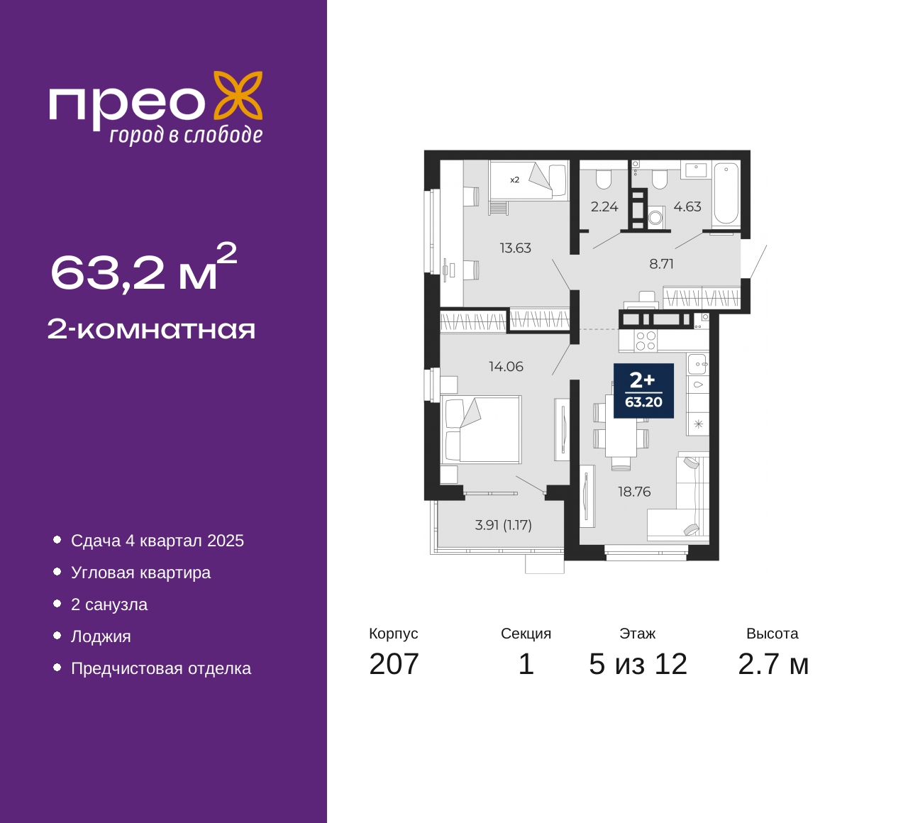 Продается 2-комн. квартира от застройщика с предчистовой отделкой в ЖК "Прео" на 5 этаже. Общая площадь: 63.2 кв.м., жилая: 27.69 кв.м., площадь просторной кухни-столовой: 18.76 кв.м. Угловая квартира, идеально подойдет любителям тишины и панорамных видов. В квартире одна лоджия, один совмещенный и один раздельный санузел. Высота потолков 2.7 м. Дом монолитный, двухподъездный, высотой 22 этажа. Квартира находится в 1-й секции в корпусе 207. На этаже 8 квартир. В подъезде 1 пассажирский и 1 грузовой лифт. Окончание строительства - 4 квартал 2025 года. Оформление сделки по договору долевого участия. Преображенский — один из самых привлекательных районов для жизни! Это полностью самостоятельный жилой район с точки зрения инфраструктуры. Преображенский находится между Московским и Червишевским трактами в квартале улиц Закалужская — Вьюжная — Александра Протозанова. Не нужно ждать, когда появится инфраструктура — переезжайте на всё готовое. Вблизи расположены действующие школа и детский сад. В этом году откроется еще один сад, а в следующем году — школа. По соседству с Преображенским запланировано строительство городского парка «Комарово» площадью 38 гектар. За 10 минут можно доехать на автомобиле до крупных ТРЦ: «Лента», «Кристалл», «Леруа Мерлен», «Метро» и «Ашан». С 2018 года в районе открыт Соседский центр — пространство, созданное для формирования добрососедской среды, совместного досуга, общения и реализации соседских инициатив. Здесь проходят встречи соседей, а также сами жители района организовывают мероприятия. Организатором такого события может стать любой желающий. В квартирах выполнена качественная предчистовая отделка. Гладкие стены с финишным выравниванием по маякам. Ровный потолок для установки натяжного потолка. Установлены пятикамерные окна с двойным стеклопакетом (3 стекла). Дизайнерские холлы с видеонаблюдением, безбарьерным и прозрачным входом – всегда светло и спокойно. На первом этаже есть просторные колясочные, где все жители могут оставлять свои коляски и велосипеды. В Преображенском есть всё, что нужно для активного отдыха и занятий спортом. Мы сделали большое футбольное поле с безопасным покрытием. Также установили хоккейный корт, который оборудован по всем необходимым стандартам. Во дворах можно делать упражнения на специальных площадках с турниками. Весь район мы обустроили велодорожками, которые связаны в единый маршрут. У нас есть сухие фонтаны, бьющие из земли, деревья, веревки, сетки, скалодром, газон, песок и резинка — осталось просто дать своему ребенку право на свободную игру. По-настоящему хорошие дворы — это те, которые дети предпочитают соцсетям и телевизору. Аккредитация в банках: ПАО «Газпромбанк», ПАО Банк «ВТБ», ОАО «Альфа-Банк», ПАО «Банк Уралсиб», «Сбербанк России» и других. (AQID02434713)