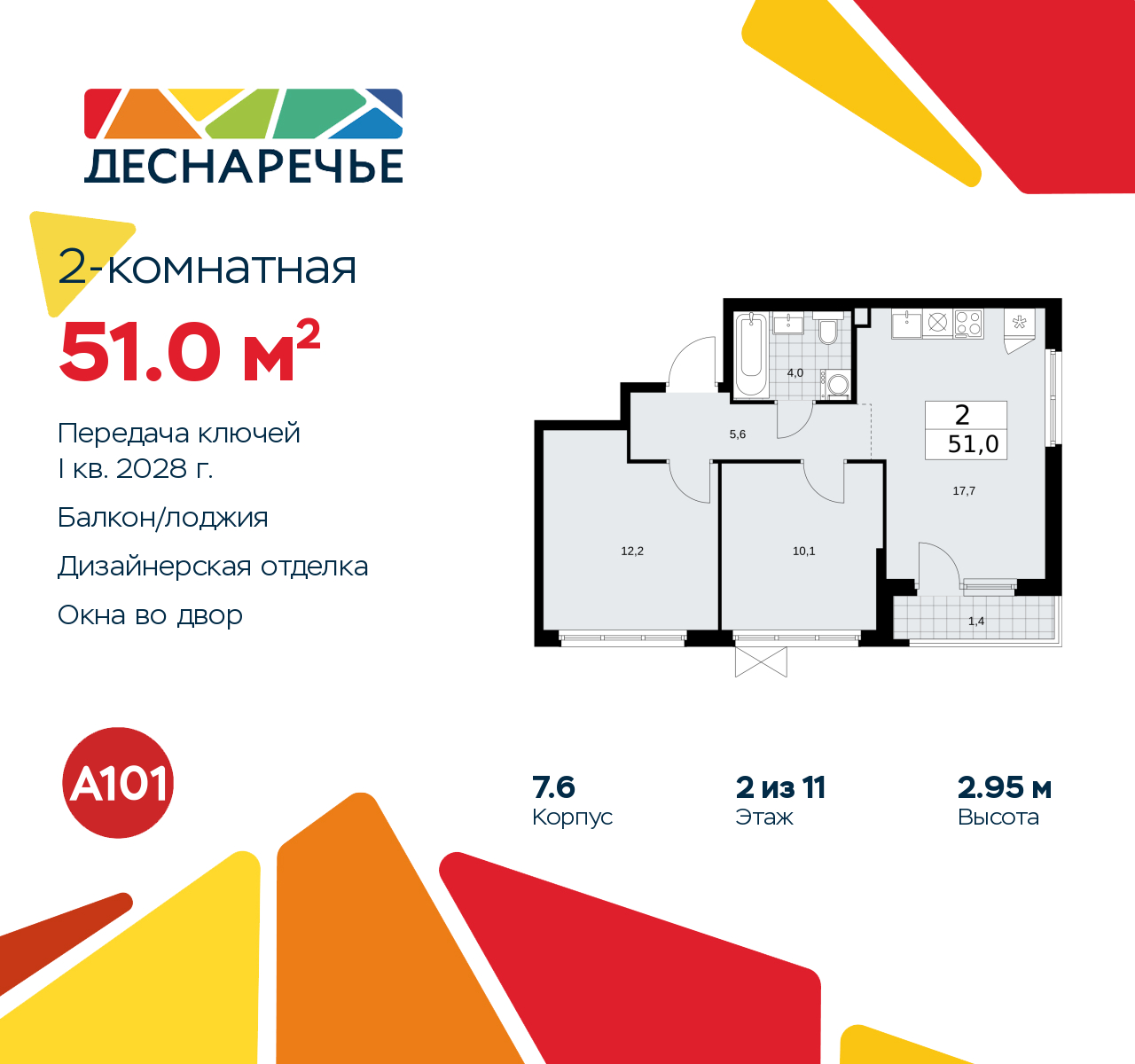 2-комн. квартира с отделкой в ЖК "Деснаречье" на 2 этаже. Общая площадь: 51 кв.м., жилая: 22.3 кв.м., площадь просторной кухни-столовой: 17.7 кв.м. Угловая квартира, идеально подойдет любителям тишины и панорамных видов. В квартире одна лоджия, один совмещенный санузел. Высота потолков 2.95 м. Эта квартира будет сдана с дизайнеркой отделкой "под ключ". Специально для вас мы разработали несколько решений дизайнерской отделки. В отделке используются только современный высококлассные материалы, на все работы предоставляется гарантия. В таком случае вы оплачиваете отделку в сегодняшних ценах, а эту стоимость вы можете разнести в ипотечных платежах. Дом монолитный, двухподъездный, высотой 11 этажей. Квартира находится во 2-й секции в корпусе 7.6. На этаже 5 квартир. В подъезде 1 пассажирский и 1 грузовой лифт. Начало строительства - 2 квартал 2025 года. Окончание строительства - 1 квартал 2028 года. Оформление сделки по договору долевого участия. Артикул квартиры по базе застройщика 88К-7.6-1268. ПРЕДЛОЖЕНИЯ ОТ ЗАСТРОЙЩИКА В ОКТЯБРЕ 2025: Ипотека от 13,9 % для всех! На весь срок. "Семейная ипотека" вернулась. Ставка от 3,5 % на весь срок! Без удорожания! Выгодное ипотечное комбо: Ипотека от 2200 р./мес. и от 6 % после рождения ребёнка! Ипотека для всех "Держи пять!" - ставка 5 % на 2 года! *более подробную информацию по скидкам и акциям уточняйте в отделе продаж Масштабный проект "Деснаречье" на юго-западе Москвы, который включает три новых района («квартала»), объединённые общей идеей – воплотить в реальность мечты современных жителей столицы об интересном, комфортном и разноплановом городском пространстве в окружении рек и лесов, словно сошедших с полотен русских живописцев: - «Берег» оценят все, кому близка водная стихия: плеск волн, солнечные блики и прогулки вдоль тихого течения речи. - «Лес» утопает в зелени парков и лесов. Здесь соблюдён идеальный баланс загородного спокойствия и столичного комфорта. - «Парк», самый энергичный и яркий, отличается высокой концентрацией пространств для спорта и творчества. Жилой комплекс "Деснаречье" расположится в 12 км от МКАД по современному Калужскому шоссе. Внешний облик зданий соответствует современному стилю и стандартам, характерным и для других популярных проектов ГК «А101»: сочетание контрастных тонов, большое количество остекления, в котором отражается небо, гармония с природным окружением. Весь город - в вашем районе. Находиться на территории «15-минутного города» значит иметь всё необходимое для полноценной жизни в шаговой доступности. Маршруты в районе «Деснаречье» выстроены так, чтобы добраться до магазинов, парков, школ, салонов услуг и других объектов можно было всего за несколько минут пешком или на велосипеде. Двор закрытый от машин – это тишина, комфорт и безопасность, поэтому все машино-места (включая «семейные» и увеличенные, с возможностью установки роллетных шкафов) находятся в подземном паркинге. В паркинги можно спуститься на лифте из любого подъезда или по лестнице. Рядом с «Деснаречьем» в 2027 году планируется открытие станции метро «Десна», до которой будет удобно добраться пешком или на велосипеде. Дорога на автомобиле до перехватывающих парковок станций «Ольховая» и «Прокшино» займёт около 10 минут. В процессе реализации проекта будут появляться новые маршруты общественного транспорта по районам. Уже сейчас н