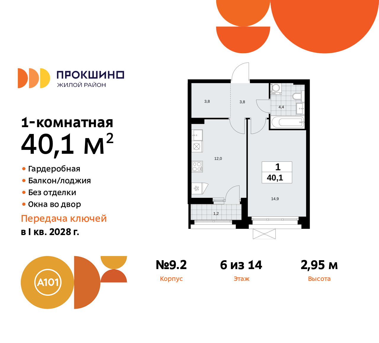 1-комн. квартира от застройщика в ЖК "Прокшино" на 6 этаже. Квартира без отделки, полностью готова к чистовой отделке и дальнейшему ремонту. Общая площадь: 40.1 кв.м., жилая: 14.9 кв.м., площадь просторной кухни-столовой: 12 кв.м. Все окна выходят на одну сторону. В квартире одна лоджия, один совмещенный санузел. Высота потолков 2.95 м. Эта квартира предлагается без отделки. Будут установлены стеклопакеты с повышенной тепло- и шумоизоляцией, в квартиру заведены все коммуникации. Вы сможете в полном объеме реализовать ваши идеи обустройства вашего комфортного дома. Имеется ниша под гардероб. Дом монолитный, черырехподъездный, переменной этажности, от 10 до 14 этажей. Квартира находится в 4-й секции высотой 10 этажей в корпусе 9.2. На этаже 5 квартир. В подъезде 1 пассажирский и 1 грузовой лифт. Начало строительства - 3 квартал 2025 года. Окончание строительства - 4 квартал 2027 года. Оформление сделки по договору долевого участия. Артикул квартиры по базе застройщика 58К-9.2-266. В шаговой доступности от жилого комплекса находятся станции метро (расстояние по прямой): «Филатов луг» (1.4 км), «Прокшино» (1.7 км), также недалеко от этого корпуса находятся станции метро: «Саларьево», «Румянцево», «Теплый стан». ПРЕДЛОЖЕНИЯ ОТ ЗАСТРОЙЩИКА В ОКТЯБРЕ 2025: Ипотека от 13,9 % для всех! На весь срок. "Семейная ипотека" вернулась. Ставка от 3,5 % на весь срок! Без удорожания! Выгодное ипотечное комбо: Ипотека от 2200 р./мес. и от 6 % после рождения ребёнка! Ипотека для всех "Держи пять!" - ставка 5 % на 2 года! *более подробную информацию по скидкам и акциям уточняйте в отделе продаж ЖК «Прокшино» расположен в 7,6 км от МКАД в Новой Москве. В 8 минутах пешком находится станция метро "Прокшино" быстрой и комфортной красной линии метро. Высокую транспортную доступность обеспечивают и два крупных шоссе, до которых легко доехать за 5 минут по новой скоростной автотрассе Солнцево – Бутово – Варшавское шоссе. Жилой комплекс "Прокшино" входит в кластер Прокшино. В районе появятся дома комфорт и бизнес-класса с подземным паркингом, закрытыми благоустроенными дворами без машин, местами для активного и созерцательного отдыха, магазинами, бытовыми сервисами и другими коммерческими объектами. Рядом пруд с собственной набережной и городской парк «Хованская дубрава». Для маленьких жителей построят детские сады, образовательный комплекс. (AQID02508584)