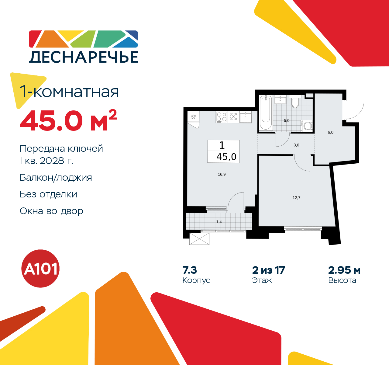 Просторная 1-комн. квартира в ЖК "Деснаречье" на 2 этаже. Квартира без отделки, после получения ключей можно делать ремонт. Общая площадь: 45 кв.м., жилая: 12.7 кв.м., площадь просторной кухни-столовой: 16.9 кв.м. Угловая квартира, окна oбecпeчивaют paвнoмepнoe ocвeщeниe в тeчeниe дня. В квартире одна лоджия, один совмещенный санузел. Высота потолков 2.95 м. Эта квартира предлагается без отделки. Будут установлены стеклопакеты с повышенной тепло- и шумоизоляцией, в квартиру заведены все коммуникации. Вы сможете в полном объеме реализовать ваши идеи обустройства вашего комфортного дома. Для тех, кто ценит время и не хочет дополнительных трат на ремонт мы предлагаем квартиры с предчистовой и дизайнерской отделкой. Дом монолитный, черырехподъездный, переменной этажности, от 9 до 17 этажей. Квартира находится в 3-й секции высотой 17 этажей в корпусе 7.3. На этаже 5 квартир. В подъезде 1 пассажирский и 1 грузовой лифт. Начало строительства - 2 квартал 2025 года. Окончание строительства - 1 квартал 2028 года. Оформление сделки по договору долевого участия. Артикул квартиры по базе застройщика 88К-7.3-699. ПРЕДЛОЖЕНИЯ ОТ ЗАСТРОЙЩИКА В ОКТЯБРЕ 2025: Ипотека от 13,9 % для всех! На весь срок. "Семейная ипотека" вернулась. Ставка от 3,5 % на весь срок! Без удорожания! Выгодное ипотечное комбо: Ипотека от 2200 р./мес. и от 6 % после рождения ребёнка! Ипотека для всех "Держи пять!" - ставка 5 % на 2 года! *более подробную информацию по скидкам и акциям уточняйте в отделе продаж Масштабный проект "Деснаречье" на юго-западе Москвы, который включает три новых района («квартала»), объединённые общей идеей – воплотить в реальность мечты современных жителей столицы об интересном, комфортном и разноплановом городском пространстве в окружении рек и лесов, словно сошедших с полотен русских живописцев: - «Берег» оценят все, кому близка водная стихия: плеск волн, солнечные блики и прогулки вдоль тихого течения речи. - «Лес» утопает в зелени парков и лесов. Здесь соблюдён идеальный баланс загородного спокойствия и столичного комфорта. - «Парк», самый энергичный и яркий, отличается высокой концентрацией пространств для спорта и творчества. Жилой комплекс "Деснаречье" расположится в 12 км от МКАД по современному Калужскому шоссе. Внешний облик зданий соответствует современному стилю и стандартам, характерным и для других популярных проектов ГК «А101»: сочетание контрастных тонов, большое количество остекления, в котором отражается небо, гармония с природным окружением. Весь город - в вашем районе. Находиться на территории «15-минутного города» значит иметь всё необходимое для полноценной жизни в шаговой доступности. Маршруты в районе «Деснаречье» выстроены так, чтобы добраться до магазинов, парков, школ, салонов услуг и других объектов можно было всего за несколько минут пешком или на велосипеде. Двор закрытый от машин – это тишина, комфорт и безопасность, поэтому все машино-места (включая «семейные» и увеличенные, с возможностью установки роллетных шкафов) находятся в подземном паркинге. В паркинги можно спуститься на лифте из любого подъезда или по лестнице. Рядом с «Деснаречьем» в 2027 году планируется открытие станции метро «Десна», до которой будет удобно добраться пешком или на велосипеде. Дорога на автомобиле до перехватывающих парковок станций «Ольховая» и «Прокшино» займёт около 10 минут. В процессе реал