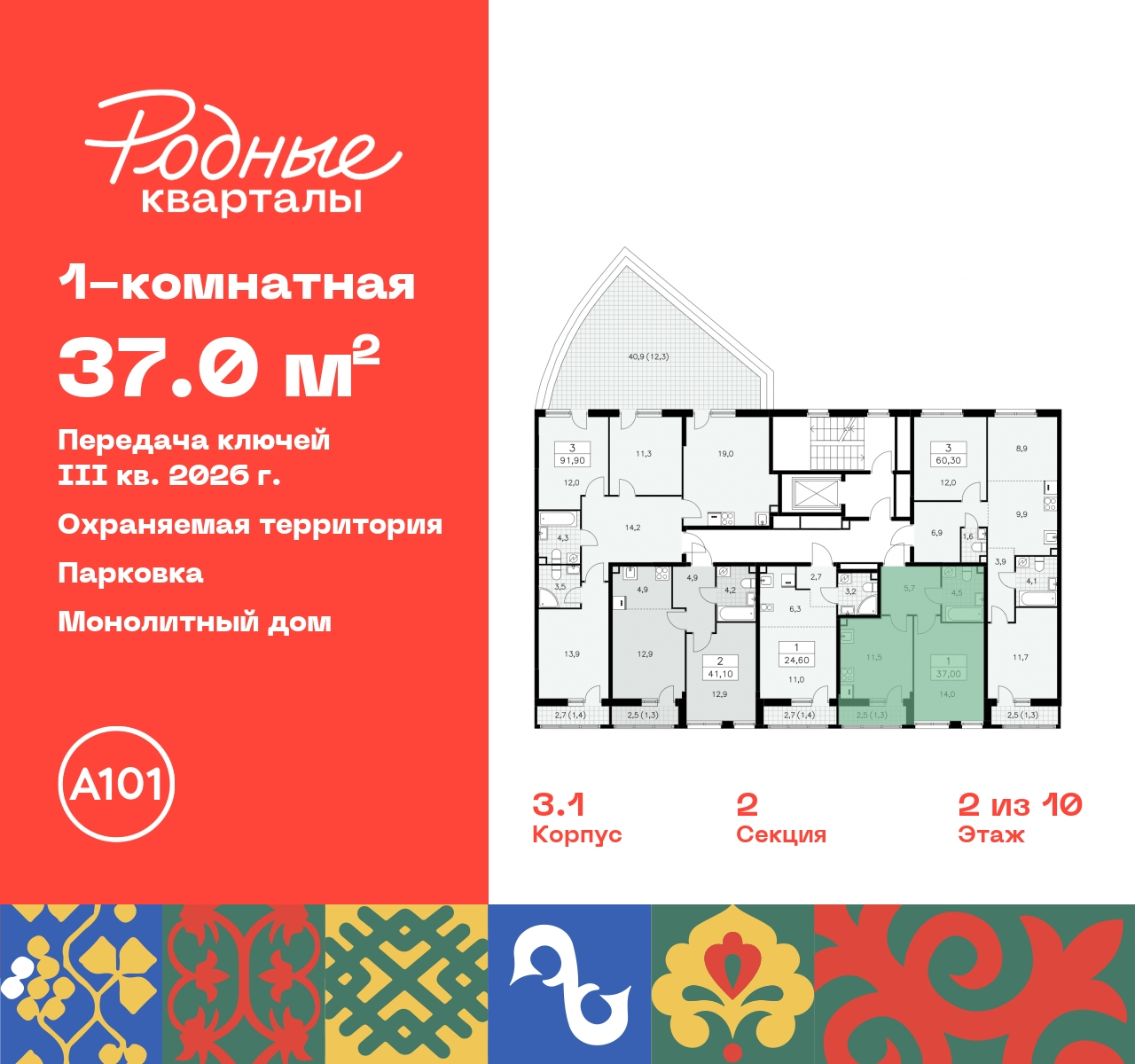1-комн. квартира от застройщика в ЖК "Родные кварталы" на 2 этаже. Квартира без отделки, после получения ключей можно делать ремонт. Общая площадь: 37 кв.м., жилая: 14 кв.м., площадь просторной кухни-столовой: 11.5 кв.м. Все окна выходят на одну сторону. В квартире одна лоджия, один совмещенный санузел. Высота потолков 2.95 м. Дом монолитный, черырехподъездный, высотой 10 этажей. Квартира находится во 2-й секции в корпусе 3.1. На этаже 5 квартир. В подъезде 1 грузовой лифт. Начало строительства - 2 квартал 2024 года. Окончание строительства - 3 квартал 2026 года. Оформление сделки по договору долевого участия. Артикул квартиры по базе застройщика 96К-3.1-47. ПРЕДЛОЖЕНИЯ ОТ ЗАСТРОЙЩИКА В ОКТЯБРЕ 2025: Ипотека от 13,9 % для всех! На весь срок. "Семейная ипотека" вернулась. Ставка от 3,5 % на весь срок! Без удорожания! Выгодное ипотечное комбо: Ипотека от 2200 р./мес. и от 6 % после рождения ребёнка! Ипотека для всех "Держи пять!" - ставка 5 % на 2 года! *более подробную информацию по скидкам и акциям уточняйте в отделе продаж Новый жилой комплекс "Родные кварталы" строится в уютной, экологически благополучной локации на юго-западе столицы. В ближайшем окружении – ухоженные малоэтажные посёлки и живописный Ульяновский лесопарк. Благодаря этому из окон откроются вдохновляющие виды, которые не исчезнут со временем за фасадами многоэтажек. Через весь район пройдёт главный бульвар, который свяжет набережную, жилые кварталы и площади в единое дружелюбное пространство, органично наполненное узнаваемыми элементами культурных традиций разных народов. В жилом комплексе создаются условия для комфортного отдыха и занятий спортом всех жителей. Здесь можно прогуляться и отдохнуть в лесопарке на берегу ручья, позаниматься на тренажёрах под открытым небом и спортивных площадках. Для малышей построят игровые комплексы, развивающие силу, координацию и ловкость. Всего в жилом комплексе будет оборудовано 6 га территории для спокойного отдыха и около 9 га — для активного. Подъезды в домах освещены в любое время суток, входы и вестибюль хорошо просматриваются с улицы. Витражное остекление обеспечивает приток естественного света днём, а вечером зажигаются светильники. В отделке домов используется сочетание вентилируемого фасада с облицовкой из фибробетонной плитки и штукатуркой. Комфортная высота домов соразмерна человеку и в среднем составляет 10 этажей. Все дома обеспечены собственными подземными паркингами. В них размещаются машино-места и кладовые. В паркинг или кладовую можно спуститься на лифте или по лестнице. В комплексе появятся бытовые сервисы, магазины, аптеки и другие торгово-бытовые объекты. В жилом районе «Родные кварталы» будут построены: - образовательный центр: школа на 1300 учеников и детский сад на 250 малышей, - два детских сада на 200 мест каждый (один из них сдаётся в 1-й очереди). В транспортной доступности уже работают: - школа № 41 и детский сад — по Боровскому шоссе, - школа № 2057 и детский сад — на запад от района, в дер. Марушкино. ЖК «Родные кварталы» строится в Новомосковском округе столицы, в 15 минутах на автомобиле от аэропорта «Внуково». Район обеспечен удобными выездами на три крупные современные автотрассы. Здесь уже работает и активно развивается система наземного общественного транспорта, включая междугородние рейсы. Интенсивное развитие локации обеспечивают дв