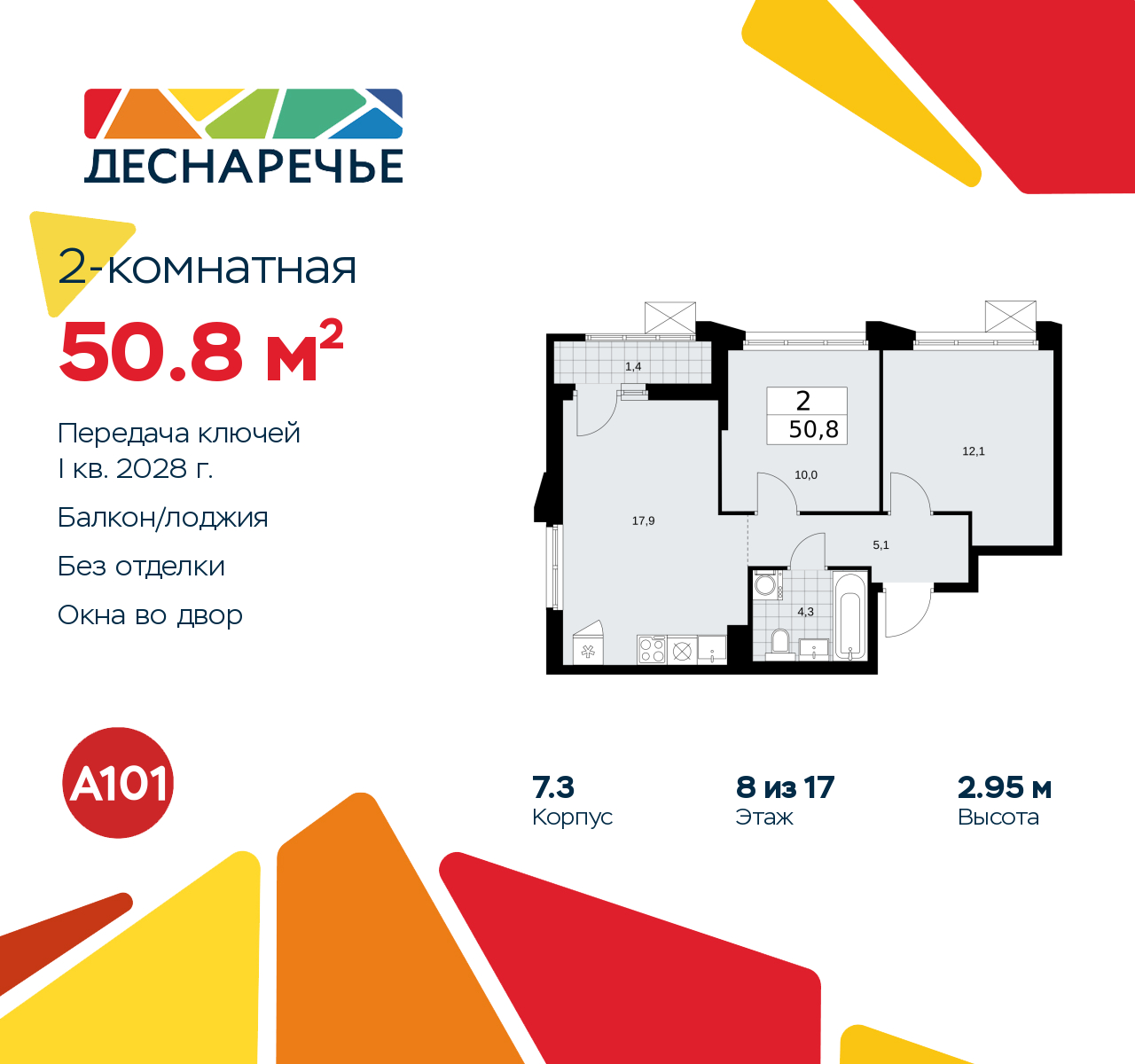 Двухкомнатная квартира от застройщика в ЖК "Деснаречье" на 8 этаже. Квартира без отделки, полностью готова к чистовой отделке и дальнейшему ремонту. Общая площадь: 50.8 кв.м., жилая: 22.1 кв.м., площадь просторной кухни-столовой: 17.9 кв.м. Квартира угловая, очень светлая, естественная вентиляция при открытии окон. В квартире одна лоджия, один совмещенный санузел. Высота потолков 2.95 м. Эта квартира предлагается без отделки. Будут установлены стеклопакеты с повышенной тепло- и шумоизоляцией, в квартиру заведены все коммуникации. Вы сможете в полном объеме реализовать ваши идеи обустройства вашего комфортного дома. Для тех, кто ценит время и не хочет дополнительных трат на ремонт мы предлагаем квартиры с предчистовой и дизайнерской отделкой. Дом монолитный, черырехподъездный, переменной этажности, от 9 до 17 этажей. Квартира находится в 1-й секции высотой 15 этажей в корпусе 7.3. На этаже 5 квартир. В подъезде 1 пассажирский и 1 грузовой лифт. Начало строительства - 2 квартал 2025 года. Окончание строительства - 1 квартал 2028 года. Оформление сделки по договору долевого участия. Артикул квартиры по базе застройщика 88К-7.3-623. ПРЕДЛОЖЕНИЯ ОТ ЗАСТРОЙЩИКА В ОКТЯБРЕ 2025: Ипотека от 13,9 % для всех! На весь срок. "Семейная ипотека" вернулась. Ставка от 3,5 % на весь срок! Без удорожания! Выгодное ипотечное комбо: Ипотека от 2200 р./мес. и от 6 % после рождения ребёнка! Ипотека для всех "Держи пять!" - ставка 5 % на 2 года! *более подробную информацию по скидкам и акциям уточняйте в отделе продаж Масштабный проект "Деснаречье" на юго-западе Москвы, который включает три новых района («квартала»), объединённые общей идеей – воплотить в реальность мечты современных жителей столицы об интересном, комфортном и разноплановом городском пространстве в окружении рек и лесов, словно сошедших с полотен русских живописцев: - «Берег» оценят все, кому близка водная стихия: плеск волн, солнечные блики и прогулки вдоль тихого течения речи. - «Лес» утопает в зелени парков и лесов. Здесь соблюдён идеальный баланс загородного спокойствия и столичного комфорта. - «Парк», самый энергичный и яркий, отличается высокой концентрацией пространств для спорта и творчества. Жилой комплекс "Деснаречье" расположится в 12 км от МКАД по современному Калужскому шоссе. Внешний облик зданий соответствует современному стилю и стандартам, характерным и для других популярных проектов ГК «А101»: сочетание контрастных тонов, большое количество остекления, в котором отражается небо, гармония с природным окружением. Весь город - в вашем районе. Находиться на территории «15-минутного города» значит иметь всё необходимое для полноценной жизни в шаговой доступности. Маршруты в районе «Деснаречье» выстроены так, чтобы добраться до магазинов, парков, школ, салонов услуг и других объектов можно было всего за несколько минут пешком или на велосипеде. Двор закрытый от машин – это тишина, комфорт и безопасность, поэтому все машино-места (включая «семейные» и увеличенные, с возможностью установки роллетных шкафов) находятся в подземном паркинге. В паркинги можно спуститься на лифте из любого подъезда или по лестнице. Рядом с «Деснаречьем» в 2027 году планируется открытие станции метро «Десна», до которой будет удобно добраться пешком или на велосипеде. Дорога на автомобиле до перехватывающих парковок станций «Ольховая» и «Прок