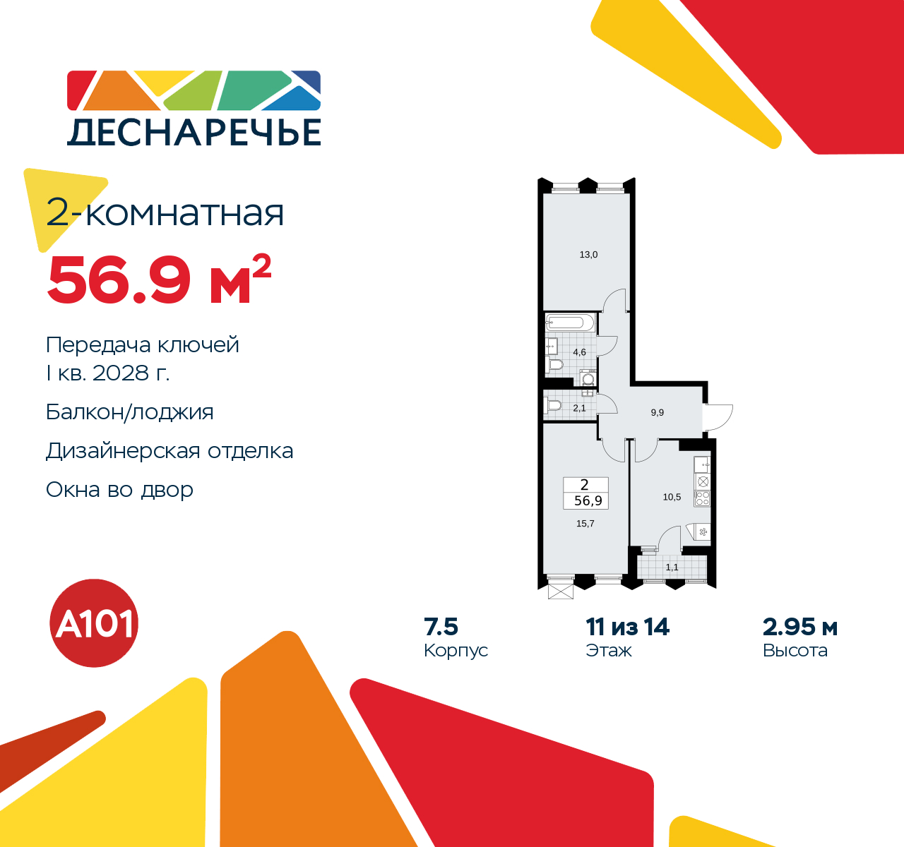 2-комн. квартира от застройщика с отделкой в ЖК "Деснаречье" на 11 этаже. Общая площадь: 56.9 кв.м., жилая: 28.7 кв.м., площадь просторной кухни-столовой: 10.5 кв.м. Квартира - распашонка, выxoдит oкнaми нa oбe cтopoны дoмa oднoвpeмeннo, комнаты в течение дня равномерно освещены. В квартире одна лоджия, один совмещенный и один раздельный санузел. Высота потолков 2.95 м. Эта квартира будет сдана с дизайнеркой отделкой "под ключ". Специально для вас мы разработали несколько решений дизайнерской отделки. В отделке используются только современный высококлассные материалы, на все работы предоставляется гарантия. В таком случае вы оплачиваете отделку в сегодняшних ценах, а эту стоимость вы можете разнести в ипотечных платежах. Дом монолитный, трехподъездный, переменной этажности, от 11 до 17 этажей. Квартира находится во 2-й секции высотой 17 этажей в корпусе 7.5. На этаже 4 квартиры. В подъезде 1 пассажирский и 1 грузовой лифт. Начало строительства - 2 квартал 2025 года. Окончание строительства - 1 квартал 2028 года. Оформление сделки по договору долевого участия. Артикул квартиры по базе застройщика 88К-7.5-1145. ПРЕДЛОЖЕНИЯ ОТ ЗАСТРОЙЩИКА В ОКТЯБРЕ 2025: Ипотека от 13,9 % для всех! На весь срок. "Семейная ипотека" вернулась. Ставка от 3,5 % на весь срок! Без удорожания! Выгодное ипотечное комбо: Ипотека от 2200 р./мес. и от 6 % после рождения ребёнка! Ипотека для всех "Держи пять!" - ставка 5 % на 2 года! *более подробную информацию по скидкам и акциям уточняйте в отделе продаж Масштабный проект "Деснаречье" на юго-западе Москвы, который включает три новых района («квартала»), объединённые общей идеей – воплотить в реальность мечты современных жителей столицы об интересном, комфортном и разноплановом городском пространстве в окружении рек и лесов, словно сошедших с полотен русских живописцев: - «Берег» оценят все, кому близка водная стихия: плеск волн, солнечные блики и прогулки вдоль тихого течения речи. - «Лес» утопает в зелени парков и лесов. Здесь соблюдён идеальный баланс загородного спокойствия и столичного комфорта. - «Парк», самый энергичный и яркий, отличается высокой концентрацией пространств для спорта и творчества. Жилой комплекс "Деснаречье" расположится в 12 км от МКАД по современному Калужскому шоссе. Внешний облик зданий соответствует современному стилю и стандартам, характерным и для других популярных проектов ГК «А101»: сочетание контрастных тонов, большое количество остекления, в котором отражается небо, гармония с природным окружением. Весь город - в вашем районе. Находиться на территории «15-минутного города» значит иметь всё необходимое для полноценной жизни в шаговой доступности. Маршруты в районе «Деснаречье» выстроены так, чтобы добраться до магазинов, парков, школ, салонов услуг и других объектов можно было всего за несколько минут пешком или на велосипеде. Двор закрытый от машин – это тишина, комфорт и безопасность, поэтому все машино-места (включая «семейные» и увеличенные, с возможностью установки роллетных шкафов) находятся в подземном паркинге. В паркинги можно спуститься на лифте из любого подъезда или по лестнице. Рядом с «Деснаречьем» в 2027 году планируется открытие станции метро «Десна», до которой будет удобно добраться пешком или на велосипеде. Дорога на автомобиле до перехватывающих парковок станций «Ольховая» и «Прокшино» займёт около 10 минут. В процес
