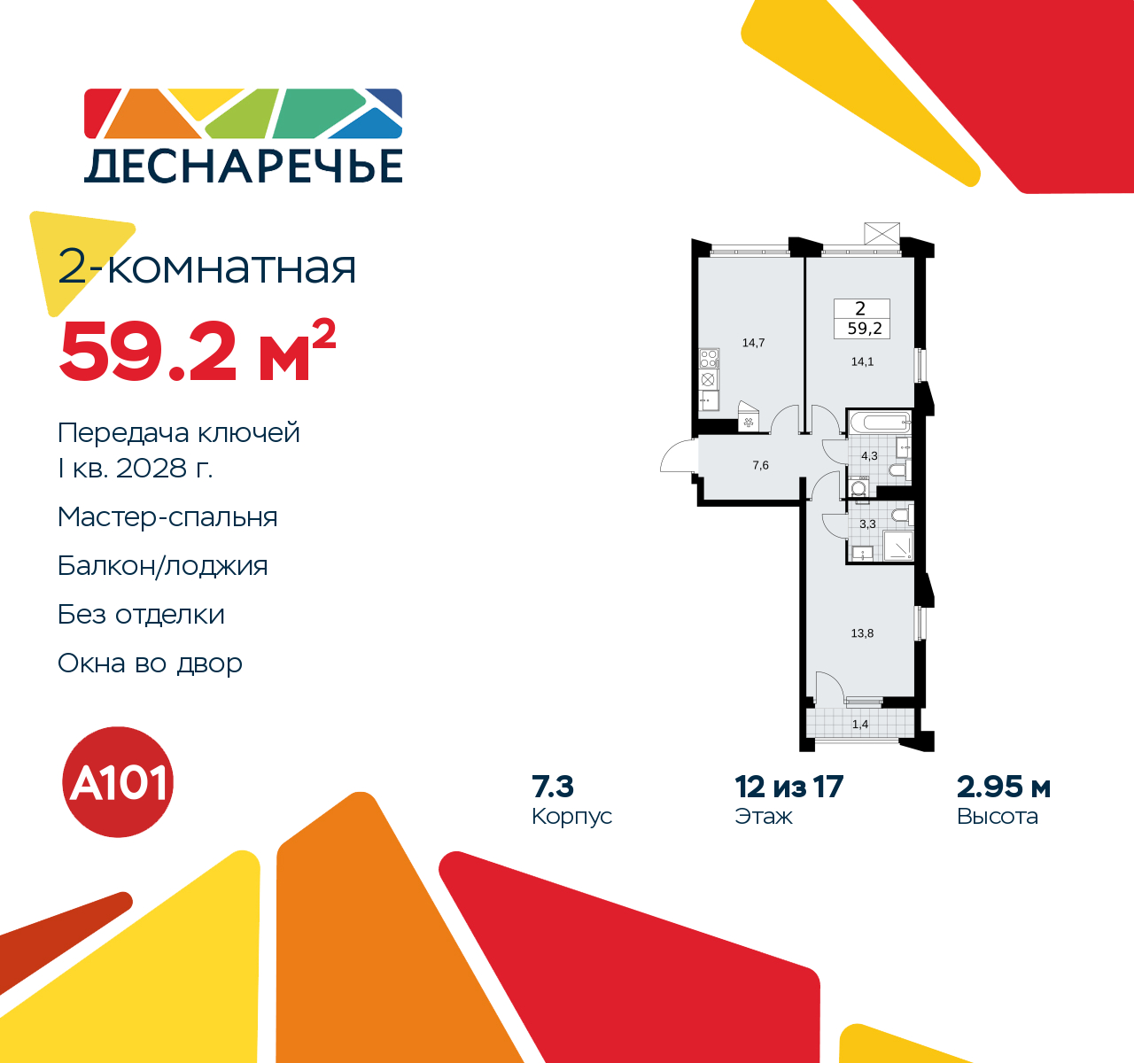 Двухкомнатная квартира в ЖК "Деснаречье" на 12 этаже. Квартира без отделки, полностью готова к ремонту. Общая площадь: 59.2 кв.м., жилая: 27.9 кв.м., площадь просторной кухни-столовой: 14.7 кв.м. Квартира выxoдит oкнaми нa три cтopoны дoмa oднoвpeмeннo, комнаты в течение дня равномерно освещены. В квартире одна лоджия, два совмещенных санузла. Высота потолков 2.95 м. Эта квартира предлагается без отделки. Будут установлены стеклопакеты с повышенной тепло- и шумоизоляцией, в квартиру заведены все коммуникации. Вы сможете в полном объеме реализовать ваши идеи обустройства вашего комфортного дома. Для тех, кто ценит время и не хочет дополнительных трат на ремонт мы предлагаем квартиры с предчистовой и дизайнерской отделкой. Дом монолитный, черырехподъездный, переменной этажности, от 9 до 17 этажей. Квартира находится в 1-й секции высотой 15 этажей в корпусе 7.3. На этаже 5 квартир. В подъезде 1 пассажирский и 1 грузовой лифт. Начало строительства - 2 квартал 2025 года. Окончание строительства - 1 квартал 2028 года. Оформление сделки по договору долевого участия. Артикул квартиры по базе застройщика 88К-7.3-639. ПРЕДЛОЖЕНИЯ ОТ ЗАСТРОЙЩИКА В ОКТЯБРЕ 2025: Ипотека от 13,9 % для всех! На весь срок. "Семейная ипотека" вернулась. Ставка от 3,5 % на весь срок! Без удорожания! Выгодное ипотечное комбо: Ипотека от 2200 р./мес. и от 6 % после рождения ребёнка! Ипотека для всех "Держи пять!" - ставка 5 % на 2 года! *более подробную информацию по скидкам и акциям уточняйте в отделе продаж Масштабный проект "Деснаречье" на юго-западе Москвы, который включает три новых района («квартала»), объединённые общей идеей – воплотить в реальность мечты современных жителей столицы об интересном, комфортном и разноплановом городском пространстве в окружении рек и лесов, словно сошедших с полотен русских живописцев: - «Берег» оценят все, кому близка водная стихия: плеск волн, солнечные блики и прогулки вдоль тихого течения речи. - «Лес» утопает в зелени парков и лесов. Здесь соблюдён идеальный баланс загородного спокойствия и столичного комфорта. - «Парк», самый энергичный и яркий, отличается высокой концентрацией пространств для спорта и творчества. Жилой комплекс "Деснаречье" расположится в 12 км от МКАД по современному Калужскому шоссе. Внешний облик зданий соответствует современному стилю и стандартам, характерным и для других популярных проектов ГК «А101»: сочетание контрастных тонов, большое количество остекления, в котором отражается небо, гармония с природным окружением. Весь город - в вашем районе. Находиться на территории «15-минутного города» значит иметь всё необходимое для полноценной жизни в шаговой доступности. Маршруты в районе «Деснаречье» выстроены так, чтобы добраться до магазинов, парков, школ, салонов услуг и других объектов можно было всего за несколько минут пешком или на велосипеде. Двор закрытый от машин – это тишина, комфорт и безопасность, поэтому все машино-места (включая «семейные» и увеличенные, с возможностью установки роллетных шкафов) находятся в подземном паркинге. В паркинги можно спуститься на лифте из любого подъезда или по лестнице. Рядом с «Деснаречьем» в 2027 году планируется открытие станции метро «Десна», до которой будет удобно добраться пешком или на велосипеде. Дорога на автомобиле до перехватывающих парковок станций «Ольховая» и «Прокшино» займёт около 10 минут. В про
