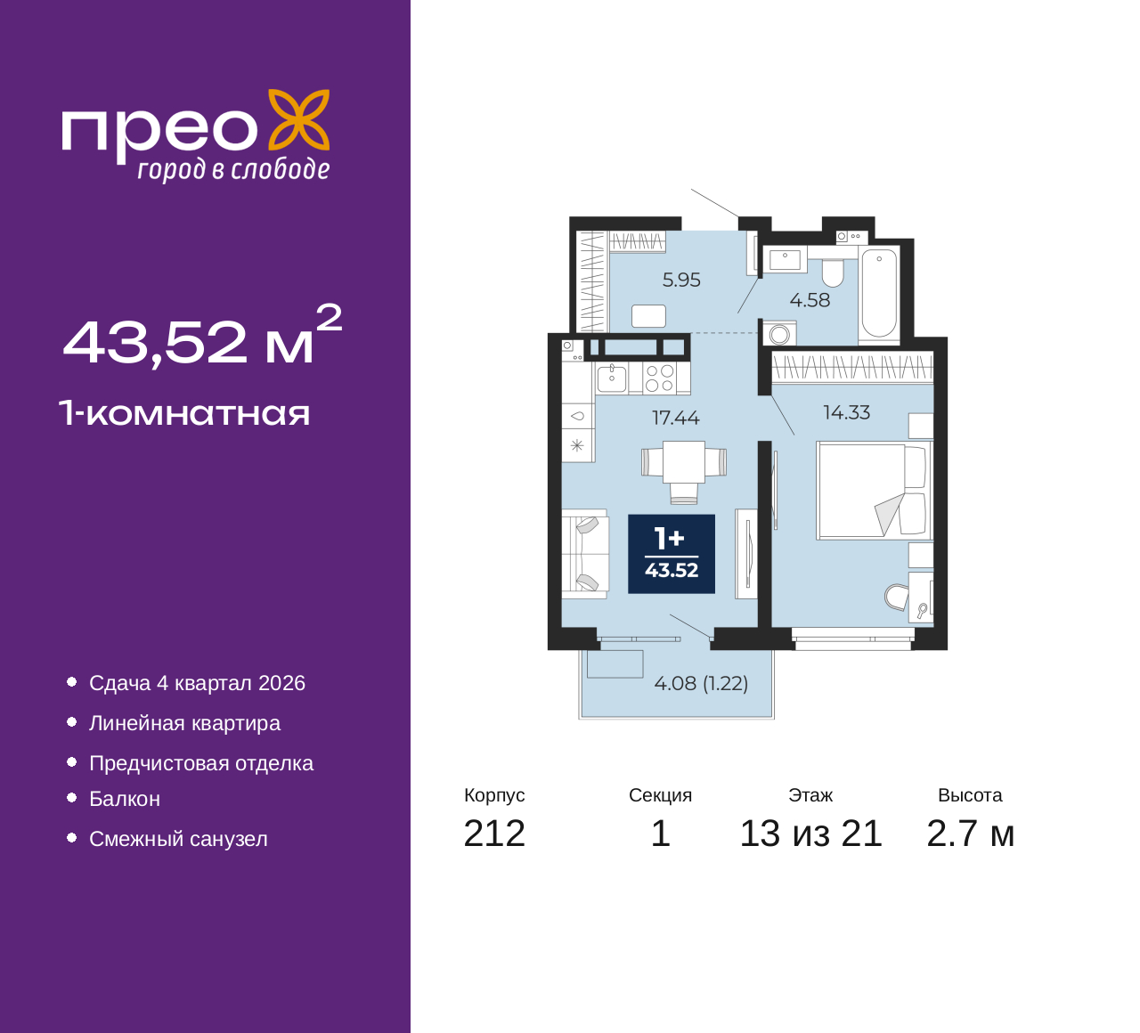 Однокомнатная квартира с предчистовой отделкой в ЖК "Прео" на 13 этаже. Общая площадь: 43.52 кв.м., жилая: 14.33 кв.м., площадь просторной кухни-столовой: 17.44 кв.м. Все окна выходят на одну сторону. В квартире один балкон, один совмещенный санузел. Высота потолков 2.7 м. Квартира находится в корпусе 212. Дом монолитный, одноподъездный, высотой 21 этаж. На этаже 8 квартир. В подъезде 2 пассажирских и 1 грузовой лифт. Окончание строительства - 4 квартал 2026 года. Оформление сделки по договору долевого участия. Преображенский — один из самых привлекательных районов для жизни! Это полностью самостоятельный жилой район с точки зрения инфраструктуры. Преображенский находится между Московским и Червишевским трактами в квартале улиц Закалужская — Вьюжная — Александра Протозанова. Не нужно ждать, когда появится инфраструктура — переезжайте на всё готовое. Вблизи расположены действующие школа и детский сад. В этом году откроется еще один сад, а в следующем году — школа. По соседству с Преображенским запланировано строительство городского парка «Комарово» площадью 38 гектар. За 10 минут можно доехать на автомобиле до крупных ТРЦ: «Лента», «Кристалл», «Леруа Мерлен», «Метро» и «Ашан». С 2018 года в районе открыт Соседский центр — пространство, созданное для формирования добрососедской среды, совместного досуга, общения и реализации соседских инициатив. Здесь проходят встречи соседей, а также сами жители района организовывают мероприятия. Организатором такого события может стать любой желающий. В квартирах выполнена качественная предчистовая отделка. Гладкие стены с финишным выравниванием по маякам. Ровный потолок для установки натяжного потолка. Установлены пятикамерные окна с двойным стеклопакетом (3 стекла). Дизайнерские холлы с видеонаблюдением, безбарьерным и прозрачным входом – всегда светло и спокойно. На первом этаже есть просторные колясочные, где все жители могут оставлять свои коляски и велосипеды. В Преображенском есть всё, что нужно для активного отдыха и занятий спортом. Мы сделали большое футбольное поле с безопасным покрытием. Также установили хоккейный корт, который оборудован по всем необходимым стандартам. Во дворах можно делать упражнения на специальных площадках с турниками. Весь район мы обустроили велодорожками, которые связаны в единый маршрут. У нас есть сухие фонтаны, бьющие из земли, деревья, веревки, сетки, скалодром, газон, песок и резинка — осталось просто дать своему ребенку право на свободную игру. По-настоящему хорошие дворы — это те, которые дети предпочитают соцсетям и телевизору. Аккредитация в банках: ПАО «Банк Уралсиб», «Сбербанк России», ПАО «Газпромбанк», ПАО Банк «ВТБ», ОАО «Альфа-Банк» и других. (AQID02514878)