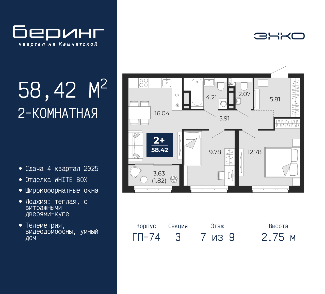 2-комн. квартира в ЖК "Беринг" на 7 этаже. Квартира без отделки, после получения ключей можно делать ремонт. Общая площадь: 58.42 кв.м., жилая: 22.56 кв.м., площадь просторной кухни-столовой: 16.04 кв.м. Комнаты изолированные, все окна выходят на одну сторону. В квартире одна лоджия, один совмещенный и один раздельный санузел. Высота потолков 2.75 м. Дом монолитный, многоподъездный, переменной этажности, от 9 до 21 этажей. Квартира находится в 3-й секции высотой 9 этажей в корпусе ГП-74. На этаже 7 квартир. В подъезде 1 грузовой лифт. Окончание строительства - 4 квартал 2025 года. Оформление сделки по договору долевого участия. Подобно знаменитому исследователю, мы чувствуем себя первооткрывателями этой локации. Хотим показать новую суть места, сформировать для вас жизненный опыт, которого ещё не было. Беринг — район зелёного цвета. Беринг — район, который откроется вам с другой стороны. Впечатлит новым уровнем комфорта и качеством жизни. Беринг — открытие на карте города. Первый квартал расположен в районе Тура, в границах улиц: Камчатская – Западносибирская – Энтузиастов. Вокруг уже есть всё для того, чтобы ежедневная рутина была лишь частью жизни и не доставляла дискомфорта. Школы и детские сады, магазины и аптеки, поликлиника, места для семейного отдыха, пеших и велопрогулок, и даже рыбалки. Масштабное озеленение дворов — визитная карточка ЭНКО и ваш оазис спокойствия, чтобы отвлечься от повседневности. Раскидистые деревья, кустарники, травы и цветы — осталось остановиться, вдохнуть и расслабиться, глядя на эту природную красоту. Стилистика подъездов продолжает концепцию Беринга, вдохновлённого Камчаткой: сдержанный, но при этом впечатляющий дизайн соседствует с удобством и функциональностью. (AQID02439034)