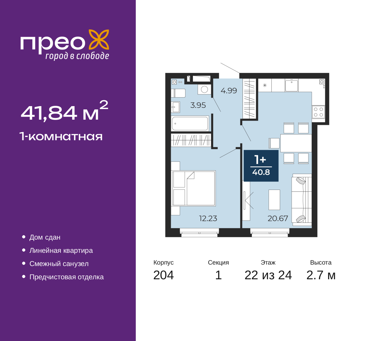 1-комн. квартира от застройщика с предчистовой отделкой в ЖК "Прео" на 22 этаже. Общая площадь: 41.84 кв.м., жилая: 12.23 кв.м., площадь просторной кухни-столовой: 20.67 кв.м. Все окна выходят на одну сторону. В квартире один совмещенный санузел. Высота потолков 2.7 м. Квартира находится в корпусе 204. Дом монолитный, одноподъездный, высотой 24 этажа. На этаже 14 квартир. В подъезде 2 грузовых лифта. На сегодняшний день строительство окончено, дом сдан в 4 квартале 2024 года. Оформление сделки по договору купли-продажи. Преображенский — один из самых привлекательных районов для жизни! Это полностью самостоятельный жилой район с точки зрения инфраструктуры. Преображенский находится между Московским и Червишевским трактами в квартале улиц Закалужская — Вьюжная — Александра Протозанова. Не нужно ждать, когда появится инфраструктура — переезжайте на всё готовое. Вблизи расположены действующие школа и детский сад. В этом году откроется еще один сад, а в следующем году — школа. По соседству с Преображенским запланировано строительство городского парка «Комарово» площадью 38 гектар. За 10 минут можно доехать на автомобиле до крупных ТРЦ: «Лента», «Кристалл», «Леруа Мерлен», «Метро» и «Ашан». С 2018 года в районе открыт Соседский центр — пространство, созданное для формирования добрососедской среды, совместного досуга, общения и реализации соседских инициатив. Здесь проходят встречи соседей, а также сами жители района организовывают мероприятия. Организатором такого события может стать любой желающий. В квартирах выполнена качественная предчистовая отделка. Гладкие стены с финишным выравниванием по маякам. Ровный потолок для установки натяжного потолка. Установлены пятикамерные окна с двойным стеклопакетом (3 стекла). Дизайнерские холлы с видеонаблюдением, безбарьерным и прозрачным входом – всегда светло и спокойно. На первом этаже есть просторные колясочные, где все жители могут оставлять свои коляски и велосипеды. В Преображенском есть всё, что нужно для активного отдыха и занятий спортом. Мы сделали большое футбольное поле с безопасным покрытием. Также установили хоккейный корт, который оборудован по всем необходимым стандартам. Во дворах можно делать упражнения на специальных площадках с турниками. Весь район мы обустроили велодорожками, которые связаны в единый маршрут. У нас есть сухие фонтаны, бьющие из земли, деревья, веревки, сетки, скалодром, газон, песок и резинка — осталось просто дать своему ребенку право на свободную игру. По-настоящему хорошие дворы — это те, которые дети предпочитают соцсетям и телевизору. Аккредитация в банках: ПАО Банк «ВТБ», «Сбербанк России», ОАО «Альфа-Банк», ПАО «Банк Уралсиб», ПАО «Газпромбанк» и других. (AQID02439630)