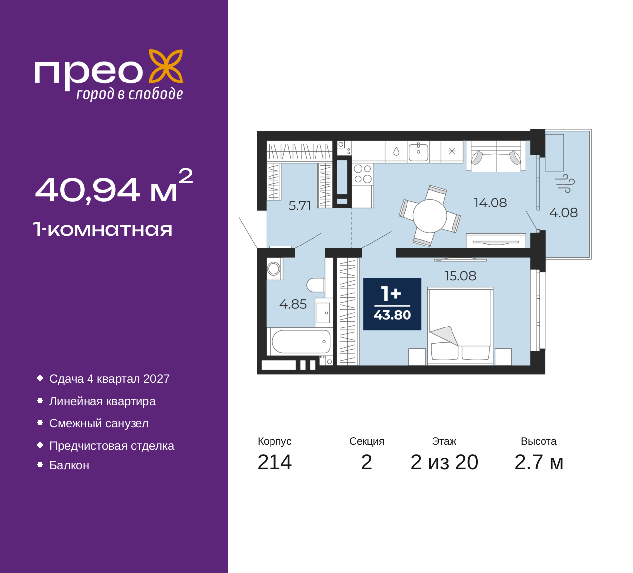 Однокомнатная квартира от застройщика с предчистовой отделкой в ЖК "Прео" на 2 этаже. Общая площадь: 40.94 кв.м., жилая: 15.08 кв.м., площадь просторной кухни-столовой: 14.08 кв.м. Все окна выходят на одну сторону. В квартире один балкон, один совмещенный санузел. Высота потолков 2.7 м. Дом монолитный, двухподъездный, переменной этажности, от 12 до 20 этажей. Квартира находится во 2-й секции высотой 20 этажей в корпусе 214. На этаже 8 квартир. В подъезде 1 пассажирский и 1 грузовой лифт. Окончание строительства - 4 квартал 2027 года. Оформление сделки по договору долевого участия. Преображенский — один из самых привлекательных районов для жизни! Это полностью самостоятельный жилой район с точки зрения инфраструктуры. Преображенский находится между Московским и Червишевским трактами в квартале улиц Закалужская — Вьюжная — Александра Протозанова. Не нужно ждать, когда появится инфраструктура — переезжайте на всё готовое. Вблизи расположены действующие школа и детский сад. В этом году откроется еще один сад, а в следующем году — школа. По соседству с Преображенским запланировано строительство городского парка «Комарово» площадью 38 гектар. За 10 минут можно доехать на автомобиле до крупных ТРЦ: «Лента», «Кристалл», «Леруа Мерлен», «Метро» и «Ашан». С 2018 года в районе открыт Соседский центр — пространство, созданное для формирования добрососедской среды, совместного досуга, общения и реализации соседских инициатив. Здесь проходят встречи соседей, а также сами жители района организовывают мероприятия. Организатором такого события может стать любой желающий. В квартирах выполнена качественная предчистовая отделка. Гладкие стены с финишным выравниванием по маякам. Ровный потолок для установки натяжного потолка. Установлены пятикамерные окна с двойным стеклопакетом (3 стекла). Дизайнерские холлы с видеонаблюдением, безбарьерным и прозрачным входом – всегда светло и спокойно. На первом этаже есть просторные колясочные, где все жители могут оставлять свои коляски и велосипеды. В Преображенском есть всё, что нужно для активного отдыха и занятий спортом. Мы сделали большое футбольное поле с безопасным покрытием. Также установили хоккейный корт, который оборудован по всем необходимым стандартам. Во дворах можно делать упражнения на специальных площадках с турниками. Весь район мы обустроили велодорожками, которые связаны в единый маршрут. У нас есть сухие фонтаны, бьющие из земли, деревья, веревки, сетки, скалодром, газон, песок и резинка — осталось просто дать своему ребенку право на свободную игру. По-настоящему хорошие дворы — это те, которые дети предпочитают соцсетям и телевизору. Аккредитация в банках: ОАО «Альфа-Банк», ПАО Банк «ВТБ», «Сбербанк России», ПАО «Газпромбанк», ПАО «Банк Уралсиб» и других. (AQID02525471)