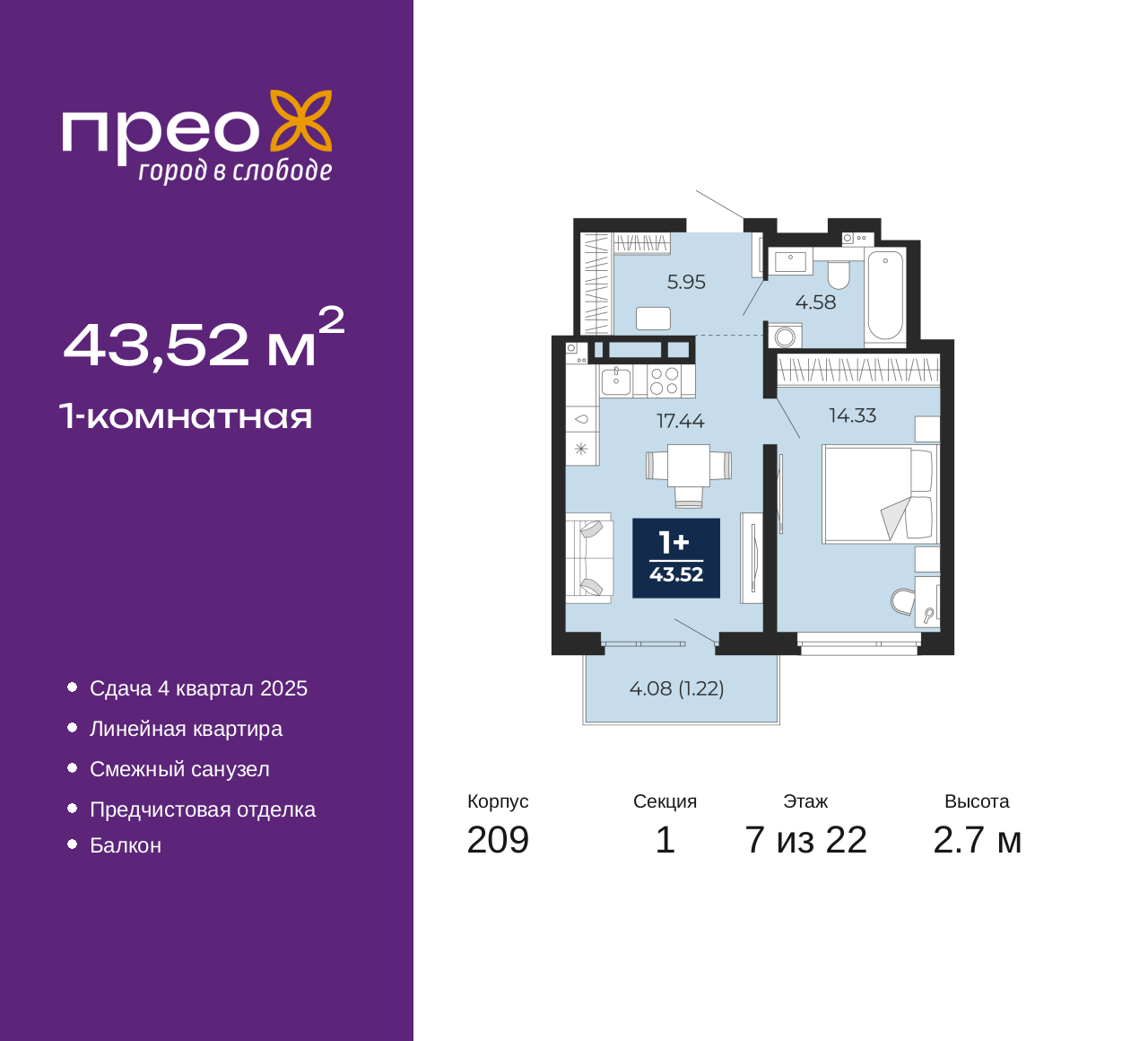 1-комн. квартира от застройщика с предчистовой отделкой в ЖК "Прео" на 7 этаже. Общая площадь: 43.52 кв.м., жилая: 14.33 кв.м., площадь просторной кухни-столовой: 17.44 кв.м. Все окна выходят на одну сторону. В квартире один балкон, один совмещенный санузел. Высота потолков 2.7 м. Квартира находится в корпусе 209. Дом монолитный, одноподъездный, высотой 22 этажа. На этаже 8 квартир. В подъезде 1 пассажирский и 1 грузовой лифт. Окончание строительства - 4 квартал 2025 года. Оформление сделки по договору долевого участия. Преображенский — один из самых привлекательных районов для жизни! Это полностью самостоятельный жилой район с точки зрения инфраструктуры. Преображенский находится между Московским и Червишевским трактами в квартале улиц Закалужская — Вьюжная — Александра Протозанова. Не нужно ждать, когда появится инфраструктура — переезжайте на всё готовое. Вблизи расположены действующие школа и детский сад. В этом году откроется еще один сад, а в следующем году — школа. По соседству с Преображенским запланировано строительство городского парка «Комарово» площадью 38 гектар. За 10 минут можно доехать на автомобиле до крупных ТРЦ: «Лента», «Кристалл», «Леруа Мерлен», «Метро» и «Ашан». С 2018 года в районе открыт Соседский центр — пространство, созданное для формирования добрососедской среды, совместного досуга, общения и реализации соседских инициатив. Здесь проходят встречи соседей, а также сами жители района организовывают мероприятия. Организатором такого события может стать любой желающий. В квартирах выполнена качественная предчистовая отделка. Гладкие стены с финишным выравниванием по маякам. Ровный потолок для установки натяжного потолка. Установлены пятикамерные окна с двойным стеклопакетом (3 стекла). Дизайнерские холлы с видеонаблюдением, безбарьерным и прозрачным входом – всегда светло и спокойно. На первом этаже есть просторные колясочные, где все жители могут оставлять свои коляски и велосипеды. В Преображенском есть всё, что нужно для активного отдыха и занятий спортом. Мы сделали большое футбольное поле с безопасным покрытием. Также установили хоккейный корт, который оборудован по всем необходимым стандартам. Во дворах можно делать упражнения на специальных площадках с турниками. Весь район мы обустроили велодорожками, которые связаны в единый маршрут. У нас есть сухие фонтаны, бьющие из земли, деревья, веревки, сетки, скалодром, газон, песок и резинка — осталось просто дать своему ребенку право на свободную игру. По-настоящему хорошие дворы — это те, которые дети предпочитают соцсетям и телевизору. Аккредитация в банках: ОАО «Альфа-Банк», ПАО «Газпромбанк», ПАО Банк «ВТБ», ПАО «Банк Уралсиб», «Сбербанк России» и других. (AQID02434689)