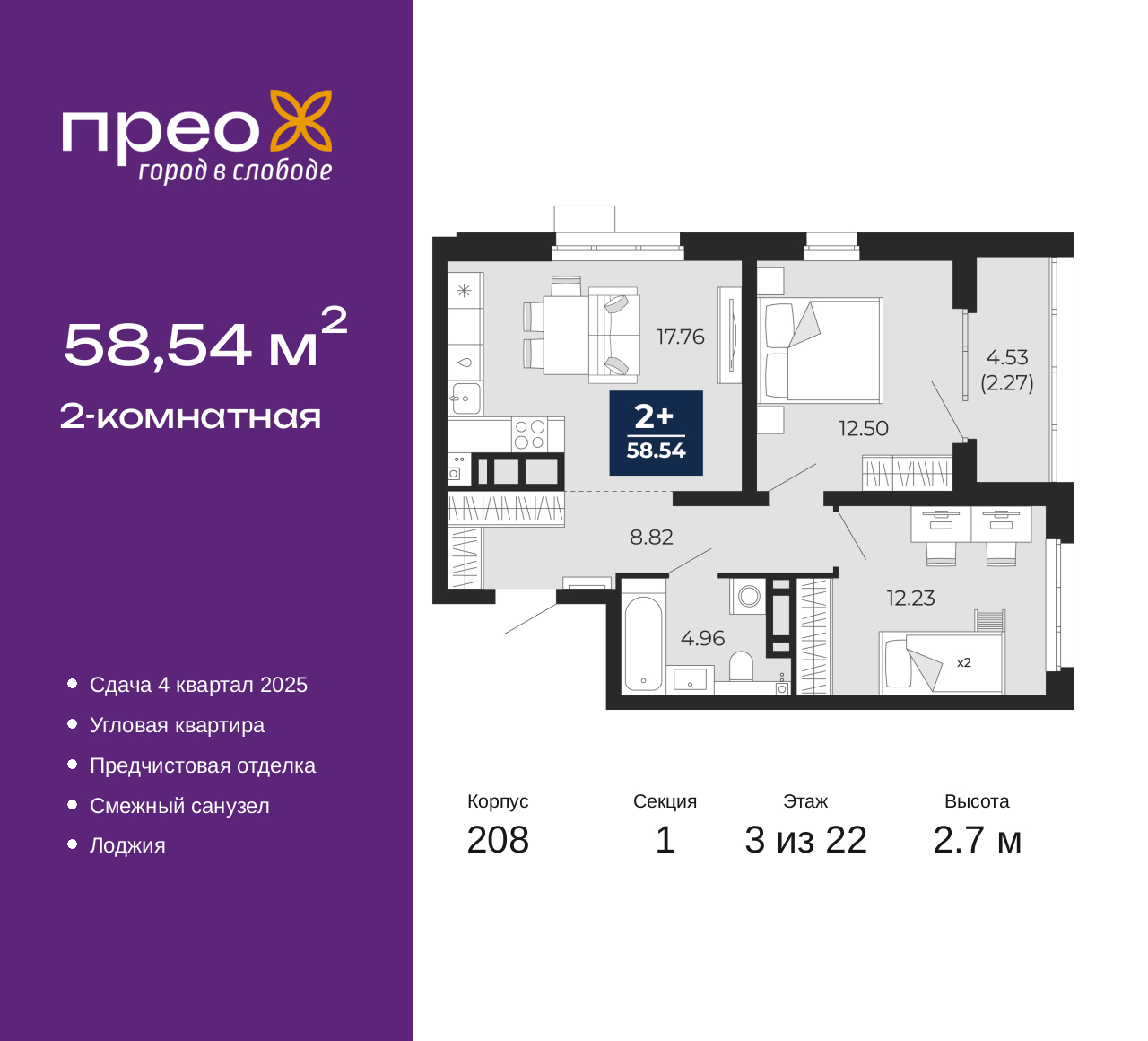 Продается двухкомнатная квартира от застройщика с предчистовой отделкой в ЖК "Прео" на 3 этаже. Общая площадь: 58.54 кв.м., жилая: 24.73 кв.м., площадь просторной кухни-столовой: 17.76 кв.м. Угловая квартира, идеально подойдет любителям тишины и панорамных видов. В квартире одна лоджия, один совмещенный санузел. Высота потолков 2.7 м. Дом монолитный, трехподъездный, переменной этажности, от 14 до 22 этажей. Квартира находится в 1-й секции высотой 22 этажа в корпусе 208. На этаже 8 квартир. В подъезде 1 пассажирский и 1 грузовой лифт. Окончание строительства - 4 квартал 2025 года. Оформление сделки по договору долевого участия. Преображенский — один из самых привлекательных районов для жизни! Это полностью самостоятельный жилой район с точки зрения инфраструктуры. Преображенский находится между Московским и Червишевским трактами в квартале улиц Закалужская — Вьюжная — Александра Протозанова. Не нужно ждать, когда появится инфраструктура — переезжайте на всё готовое. Вблизи расположены действующие школа и детский сад. В этом году откроется еще один сад, а в следующем году — школа. По соседству с Преображенским запланировано строительство городского парка «Комарово» площадью 38 гектар. За 10 минут можно доехать на автомобиле до крупных ТРЦ: «Лента», «Кристалл», «Леруа Мерлен», «Метро» и «Ашан». С 2018 года в районе открыт Соседский центр — пространство, созданное для формирования добрососедской среды, совместного досуга, общения и реализации соседских инициатив. Здесь проходят встречи соседей, а также сами жители района организовывают мероприятия. Организатором такого события может стать любой желающий. В квартирах выполнена качественная предчистовая отделка. Гладкие стены с финишным выравниванием по маякам. Ровный потолок для установки натяжного потолка. Установлены пятикамерные окна с двойным стеклопакетом (3 стекла). Дизайнерские холлы с видеонаблюдением, безбарьерным и прозрачным входом – всегда светло и спокойно. На первом этаже есть просторные колясочные, где все жители могут оставлять свои коляски и велосипеды. В Преображенском есть всё, что нужно для активного отдыха и занятий спортом. Мы сделали большое футбольное поле с безопасным покрытием. Также установили хоккейный корт, который оборудован по всем необходимым стандартам. Во дворах можно делать упражнения на специальных площадках с турниками. Весь район мы обустроили велодорожками, которые связаны в единый маршрут. У нас есть сухие фонтаны, бьющие из земли, деревья, веревки, сетки, скалодром, газон, песок и резинка — осталось просто дать своему ребенку право на свободную игру. По-настоящему хорошие дворы — это те, которые дети предпочитают соцсетям и телевизору. Аккредитация в банках: «Сбербанк России», ОАО «Альфа-Банк», ПАО «Газпромбанк», ПАО «Банк Уралсиб», ПАО Банк «ВТБ» и других. (AQID02483766)