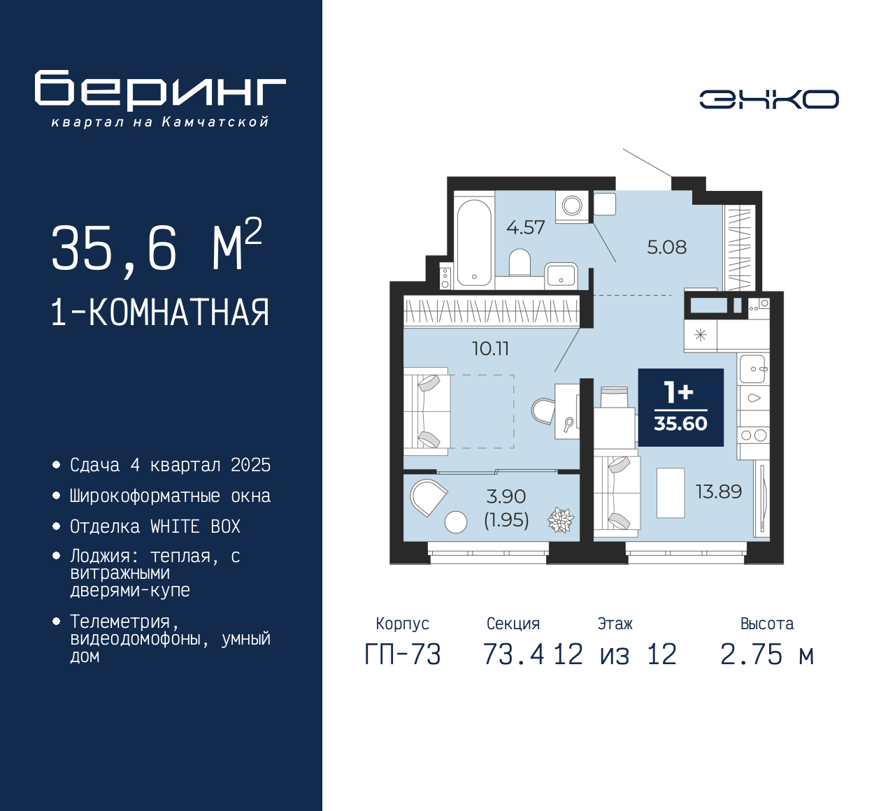 1-комн. квартира в ЖК "Беринг" на 12 этаже. Квартира без отделки, новый собственник может сделать ремонт по индивидуальному проекту. Общая площадь: 35.6 кв.м., жилая: 10.11 кв.м., площадь просторной кухни-столовой: 13.89 кв.м. Все окна выходят на одну сторону. В квартире одна лоджия, один совмещенный санузел. Высота потолков 2.75 м. Дом монолитный, многоподъездный, переменной этажности, от 9 до 22 этажей. Квартира находится в 73.4-й секции высотой 12 этажей в корпусе ГП-73. На этаже 8 квартир. В подъезде 1 пассажирский и 1 грузовой лифт. Окончание строительства - 4 квартал 2025 года. Оформление сделки по договору долевого участия. Подобно знаменитому исследователю, мы чувствуем себя первооткрывателями этой локации. Хотим показать новую суть места, сформировать для вас жизненный опыт, которого ещё не было. Беринг — район зелёного цвета. Беринг — район, который откроется вам с другой стороны. Впечатлит новым уровнем комфорта и качеством жизни. Беринг — открытие на карте города. Первый квартал расположен в районе Тура, в границах улиц: Камчатская – Западносибирская – Энтузиастов. Вокруг уже есть всё для того, чтобы ежедневная рутина была лишь частью жизни и не доставляла дискомфорта. Школы и детские сады, магазины и аптеки, поликлиника, места для семейного отдыха, пеших и велопрогулок, и даже рыбалки. Масштабное озеленение дворов — визитная карточка ЭНКО и ваш оазис спокойствия, чтобы отвлечься от повседневности. Раскидистые деревья, кустарники, травы и цветы — осталось остановиться, вдохнуть и расслабиться, глядя на эту природную красоту. Стилистика подъездов продолжает концепцию Беринга, вдохновлённого Камчаткой: сдержанный, но при этом впечатляющий дизайн соседствует с удобством и функциональностью. (AQID02497857)