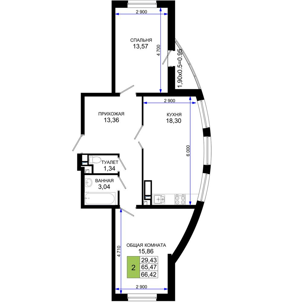 - Общая площадь 66.42 м²