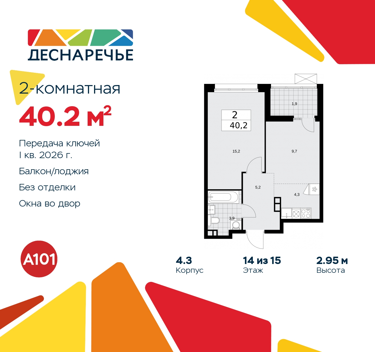 Продается двухкомнатная квартира с европланировкой в ЖК "Деснаречье" на 14 этаже. Квартира без отделки, полностью готова к ремонту. Общая площадь: 40.2 кв.м., жилая: 24.9 кв.м., суммарная площадь гостиной-столовой с кухонной зоной: 14 кв.м. Европейская планировка, зона гостиной комнаты объединена с кухней. Комнаты изолированные, все окна выходят на одну сторону. В квартире одна лоджия, один совмещенный санузел. Высота потолков 2.95 м. Эта квартира предлагается без отделки. Будут установлены стеклопакеты с повышенной тепло- и шумоизоляцией, в квартиру заведены все коммуникации. Вы сможете в полном объеме реализовать ваши идеи обустройства вашего комфортного дома. Для тех, кто ценит время и не хочет дополнительных трат на ремонт мы предлагаем квартиры с предчистовой и дизайнерской отделкой. Квартира находится в корпусе 4.3. Дом монолитный, одноподъездный, высотой 15 этажей. На этаже 10 квартир. В подъезде 1 пассажирский и 1 грузовой лифт. Начало строительства - 3 квартал 2023 года. Окончание строительства - 1 квартал 2026 года. Оформление сделки по договору долевого участия. Артикул квартиры по базе застройщика 88К-4.3-703. ПРЕДЛОЖЕНИЯ ОТ ЗАСТРОЙЩИКА В ОКТЯБРЕ 2025: Ипотека от 13,9 % для всех! На весь срок. "Семейная ипотека" вернулась. Ставка от 3,5 % на весь срок! Без удорожания! Выгодное ипотечное комбо: Ипотека от 2200 р./мес. и от 6 % после рождения ребёнка! Ипотека для всех "Держи пять!" - ставка 5 % на 2 года! *более подробную информацию по скидкам и акциям уточняйте в отделе продаж Масштабный проект "Деснаречье" на юго-западе Москвы, который включает три новых района («квартала»), объединённые общей идеей – воплотить в реальность мечты современных жителей столицы об интересном, комфортном и разноплановом городском пространстве в окружении рек и лесов, словно сошедших с полотен русских живописцев: - «Берег» оценят все, кому близка водная стихия: плеск волн, солнечные блики и прогулки вдоль тихого течения речи. - «Лес» утопает в зелени парков и лесов. Здесь соблюдён идеальный баланс загородного спокойствия и столичного комфорта. - «Парк», самый энергичный и яркий, отличается высокой концентрацией пространств для спорта и творчества. Жилой комплекс "Деснаречье" расположится в 12 км от МКАД по современному Калужскому шоссе. Внешний облик зданий соответствует современному стилю и стандартам, характерным и для других популярных проектов ГК «А101»: сочетание контрастных тонов, большое количество остекления, в котором отражается небо, гармония с природным окружением. Весь город - в вашем районе. Находиться на территории «15-минутного города» значит иметь всё необходимое для полноценной жизни в шаговой доступности. Маршруты в районе «Деснаречье» выстроены так, чтобы добраться до магазинов, парков, школ, салонов услуг и других объектов можно было всего за несколько минут пешком или на велосипеде. Двор закрытый от машин – это тишина, комфорт и безопасность, поэтому все машино-места (включая «семейные» и увеличенные, с возможностью установки роллетных шкафов) находятся в подземном паркинге. В паркинги можно спуститься на лифте из любого подъезда или по лестнице. Рядом с «Деснаречьем» в 2027 году планируется открытие станции метро «Десна», до которой будет удобно добраться пешком или на велосипеде. Дорога на автомобиле до перехватывающих парковок станций «Ольховая» и «Прокшин