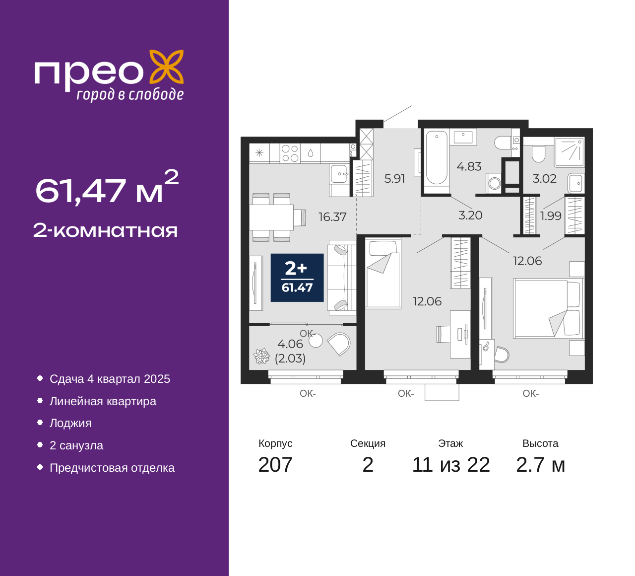 Двухкомнатная квартира от застройщика с предчистовой отделкой в ЖК "Прео" на 11 этаже. Общая площадь: 61.47 кв.м., жилая: 24.12 кв.м., площадь просторной кухни-столовой: 16.37 кв.м. Комнаты изолированные, все окна выходят на одну сторону. В квартире одна лоджия, два совмещенных санузла. Высота потолков 2.7 м. Дом монолитный, двухподъездный, высотой 22 этажа. Квартира находится во 2-й секции в корпусе 207. На этаже 8 квартир. В подъезде 1 пассажирский и 1 грузовой лифт. Окончание строительства - 4 квартал 2025 года. Оформление сделки по договору долевого участия. Преображенский — один из самых привлекательных районов для жизни! Это полностью самостоятельный жилой район с точки зрения инфраструктуры. Преображенский находится между Московским и Червишевским трактами в квартале улиц Закалужская — Вьюжная — Александра Протозанова. Не нужно ждать, когда появится инфраструктура — переезжайте на всё готовое. Вблизи расположены действующие школа и детский сад. В этом году откроется еще один сад, а в следующем году — школа. По соседству с Преображенским запланировано строительство городского парка «Комарово» площадью 38 гектар. За 10 минут можно доехать на автомобиле до крупных ТРЦ: «Лента», «Кристалл», «Леруа Мерлен», «Метро» и «Ашан». С 2018 года в районе открыт Соседский центр — пространство, созданное для формирования добрососедской среды, совместного досуга, общения и реализации соседских инициатив. Здесь проходят встречи соседей, а также сами жители района организовывают мероприятия. Организатором такого события может стать любой желающий. В квартирах выполнена качественная предчистовая отделка. Гладкие стены с финишным выравниванием по маякам. Ровный потолок для установки натяжного потолка. Установлены пятикамерные окна с двойным стеклопакетом (3 стекла). Дизайнерские холлы с видеонаблюдением, безбарьерным и прозрачным входом – всегда светло и спокойно. На первом этаже есть просторные колясочные, где все жители могут оставлять свои коляски и велосипеды. В Преображенском есть всё, что нужно для активного отдыха и занятий спортом. Мы сделали большое футбольное поле с безопасным покрытием. Также установили хоккейный корт, который оборудован по всем необходимым стандартам. Во дворах можно делать упражнения на специальных площадках с турниками. Весь район мы обустроили велодорожками, которые связаны в единый маршрут. У нас есть сухие фонтаны, бьющие из земли, деревья, веревки, сетки, скалодром, газон, песок и резинка — осталось просто дать своему ребенку право на свободную игру. По-настоящему хорошие дворы — это те, которые дети предпочитают соцсетям и телевизору. Аккредитация в банках: ОАО «Альфа-Банк», ПАО «Банк Уралсиб», «Сбербанк России», ПАО «Газпромбанк», ПАО Банк «ВТБ» и других. (AQID02488157)