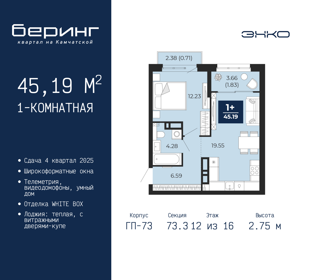 1-комн. квартира в ЖК "Беринг" на 12 этаже. Квартира без отделки, новый собственник может сделать ремонт по своему проекту. Общая площадь: 45.19 кв.м., жилая: 12.23 кв.м., площадь просторной кухни-столовой: 19.55 кв.м. Все окна выходят на одну сторону. В квартире один балкон и одна лоджия, один совмещенный санузел. Высота потолков 2.75 м. Дом монолитный, многоподъездный, переменной этажности, от 9 до 22 этажей. Квартира находится в 73.3-й секции высотой 16 этажей в корпусе ГП-73. На этаже 8 квартир. В подъезде 1 пассажирский и 1 грузовой лифт. Окончание строительства - 4 квартал 2025 года. Оформление сделки по договору долевого участия. Подобно знаменитому исследователю, мы чувствуем себя первооткрывателями этой локации. Хотим показать новую суть места, сформировать для вас жизненный опыт, которого ещё не было. Беринг — район зелёного цвета. Беринг — район, который откроется вам с другой стороны. Впечатлит новым уровнем комфорта и качеством жизни. Беринг — открытие на карте города. Первый квартал расположен в районе Тура, в границах улиц: Камчатская – Западносибирская – Энтузиастов. Вокруг уже есть всё для того, чтобы ежедневная рутина была лишь частью жизни и не доставляла дискомфорта. Школы и детские сады, магазины и аптеки, поликлиника, места для семейного отдыха, пеших и велопрогулок, и даже рыбалки. Масштабное озеленение дворов — визитная карточка ЭНКО и ваш оазис спокойствия, чтобы отвлечься от повседневности. Раскидистые деревья, кустарники, травы и цветы — осталось остановиться, вдохнуть и расслабиться, глядя на эту природную красоту. Стилистика подъездов продолжает концепцию Беринга, вдохновлённого Камчаткой: сдержанный, но при этом впечатляющий дизайн соседствует с удобством и функциональностью. (AQID02432102)