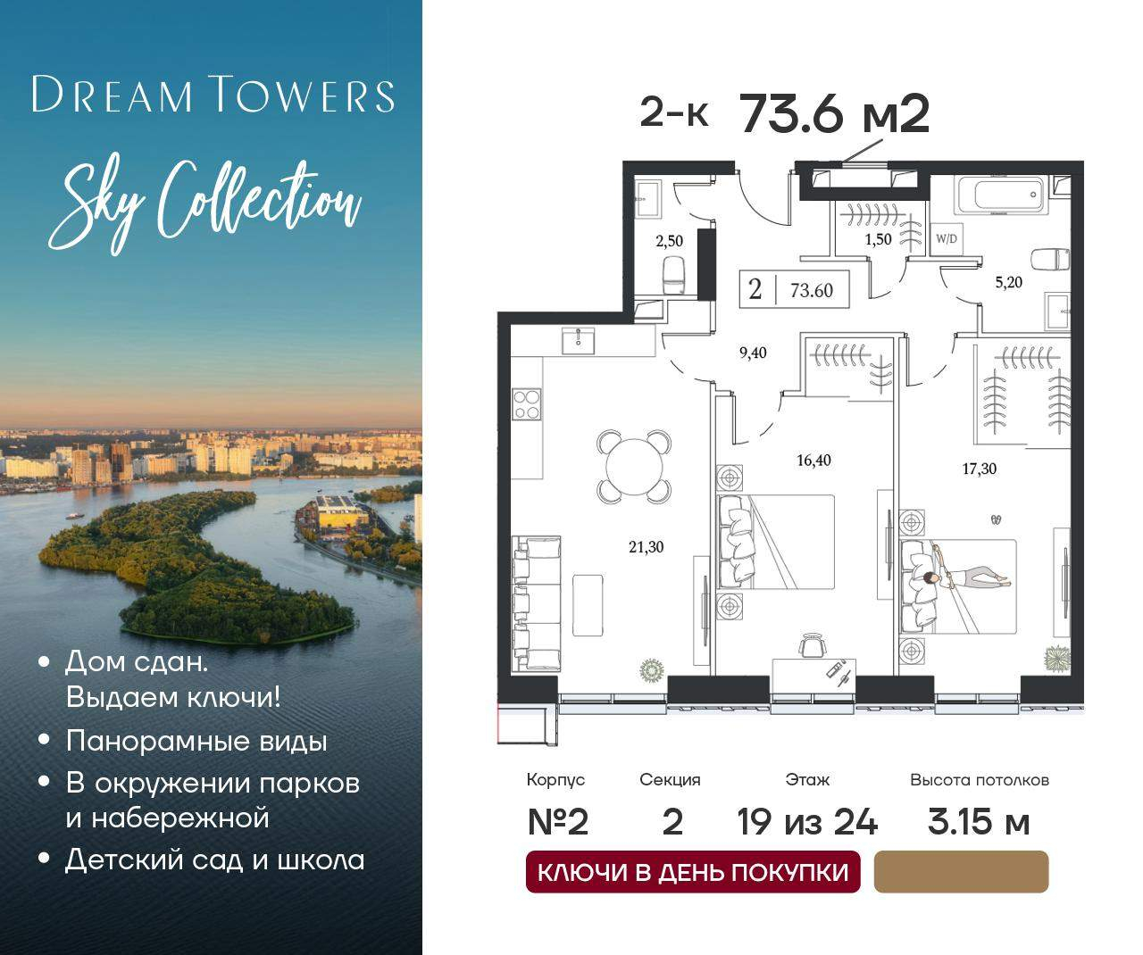 Рассрочка 0% от застройщика. Первоначальный взнос от 20%. Ключи в день покупки. ЖК Dream Towers проект премиум-класса в окружении парков и набережной, с полностью готовой инфраструктурой для комфортной жизни и отдыха. Продаётся 2-квартира на 19 этаже 24-этажного дома (2 корпус) . Общая площадь: 73.6 кв.м. Высота потолков от 3.15 м. Город-курорт на 100 Га в шаге от вашего дома: - пляжный комлекс Dream Beach Club; - парк аттракционов Остров Мечты; - 44 Га ландшафтных парков; - пешеходная набережная; - яхт-клуб; - Южный речной вокзал; - вейк-парк и многое другое. В Dream Towers предусмотрено все для комфортной жизни с семьей: - дизайнерские лобби с общественной гостиной, колясочной и лапомойками; - охраняемый благоустроенной двор только для жителей; - собственный десткий сад и школа прямо во дворе; - красивая архитектура зданий в стиле Ар-деко; - облицовка фасадов из натурального камня с архитектурной подсветкой; - широкоформатное остекление окон в пол для лучших видовых характеристик на парки и пойму Москвы-реки; - подземный паркинг; - клубный формат проживания; - эргономичные планировки от 40 до 162 м2; - высокие потолки от 3,15 до 4,1 м; - квартиры с террасами; - вся необходимая инфраструктура на первых этажах домов, а также в торговой части тематического парка "Остров Мечты" (рестораны, кафе, супермаркет, магазины, салон красоты, йога-студия и многое другое) . Центр рядом: 15 минут до Садового кольца на авто, 20 минут до Сити или Кремля. В 5 минутах прогулочным шагом - станция метро "Технопарк". [#7411741#]