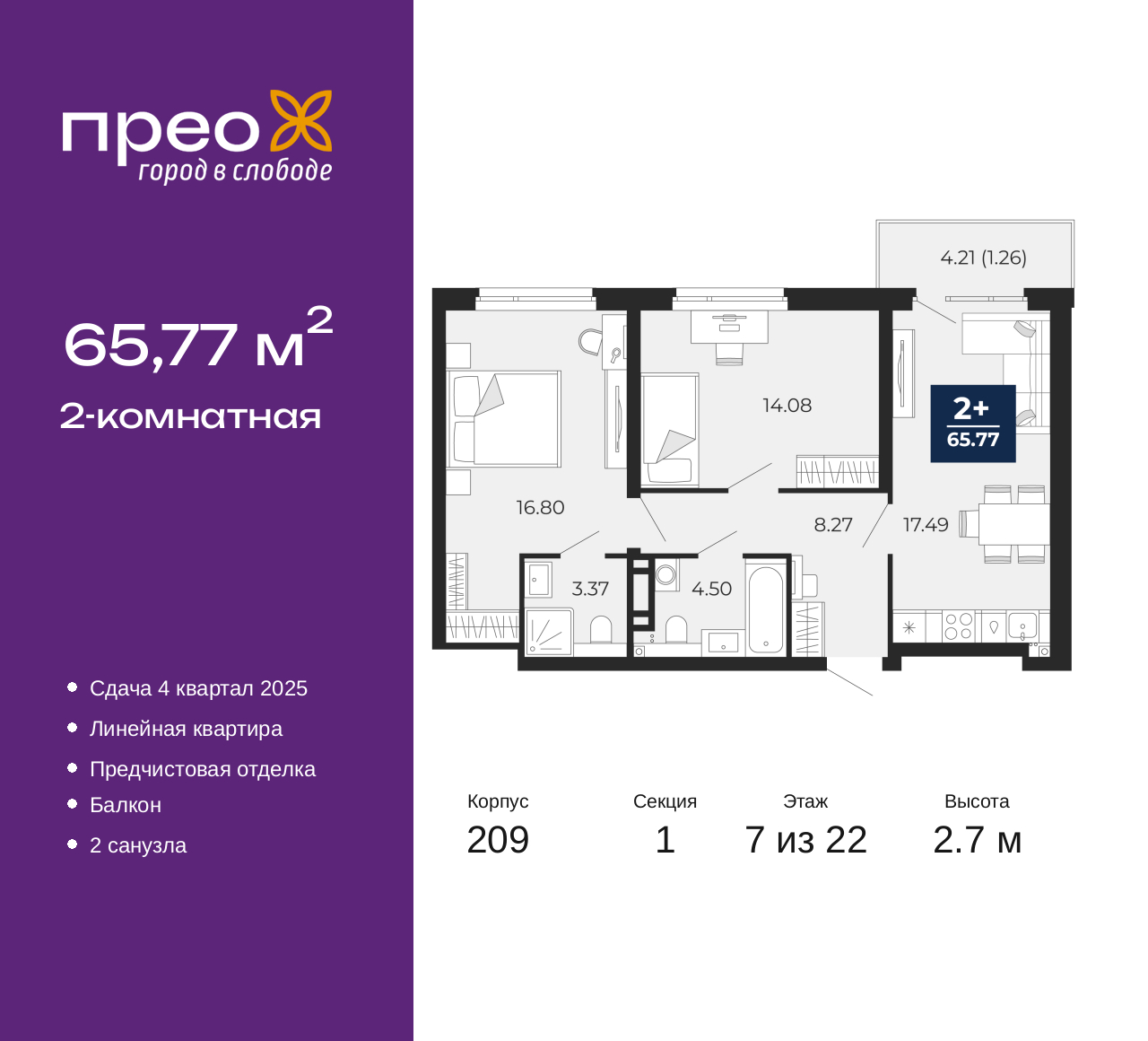 Продается двухкомнатная квартира с предчистовой отделкой в ЖК "Прео" на 7 этаже. Общая площадь: 65.77 кв.м., жилая: 30.88 кв.м., площадь просторной кухни-столовой: 17.49 кв.м. Комнаты изолированные, все окна выходят на одну сторону. В квартире один балкон, два совмещенных санузла. Высота потолков 2.7 м. Квартира находится в корпусе 209. Дом монолитный, одноподъездный, высотой 22 этажа. На этаже 8 квартир. В подъезде 1 пассажирский и 1 грузовой лифт. Окончание строительства - 4 квартал 2025 года. Оформление сделки по договору долевого участия. Преображенский — один из самых привлекательных районов для жизни! Это полностью самостоятельный жилой район с точки зрения инфраструктуры. Преображенский находится между Московским и Червишевским трактами в квартале улиц Закалужская — Вьюжная — Александра Протозанова. Не нужно ждать, когда появится инфраструктура — переезжайте на всё готовое. Вблизи расположены действующие школа и детский сад. В этом году откроется еще один сад, а в следующем году — школа. По соседству с Преображенским запланировано строительство городского парка «Комарово» площадью 38 гектар. За 10 минут можно доехать на автомобиле до крупных ТРЦ: «Лента», «Кристалл», «Леруа Мерлен», «Метро» и «Ашан». С 2018 года в районе открыт Соседский центр — пространство, созданное для формирования добрососедской среды, совместного досуга, общения и реализации соседских инициатив. Здесь проходят встречи соседей, а также сами жители района организовывают мероприятия. Организатором такого события может стать любой желающий. В квартирах выполнена качественная предчистовая отделка. Гладкие стены с финишным выравниванием по маякам. Ровный потолок для установки натяжного потолка. Установлены пятикамерные окна с двойным стеклопакетом (3 стекла). Дизайнерские холлы с видеонаблюдением, безбарьерным и прозрачным входом – всегда светло и спокойно. На первом этаже есть просторные колясочные, где все жители могут оставлять свои коляски и велосипеды. В Преображенском есть всё, что нужно для активного отдыха и занятий спортом. Мы сделали большое футбольное поле с безопасным покрытием. Также установили хоккейный корт, который оборудован по всем необходимым стандартам. Во дворах можно делать упражнения на специальных площадках с турниками. Весь район мы обустроили велодорожками, которые связаны в единый маршрут. У нас есть сухие фонтаны, бьющие из земли, деревья, веревки, сетки, скалодром, газон, песок и резинка — осталось просто дать своему ребенку право на свободную игру. По-настоящему хорошие дворы — это те, которые дети предпочитают соцсетям и телевизору. Аккредитация в банках: «Сбербанк России», ОАО «Альфа-Банк», ПАО Банк «ВТБ», ПАО «Газпромбанк», ПАО «Банк Уралсиб» и других. (AQID02434722)
