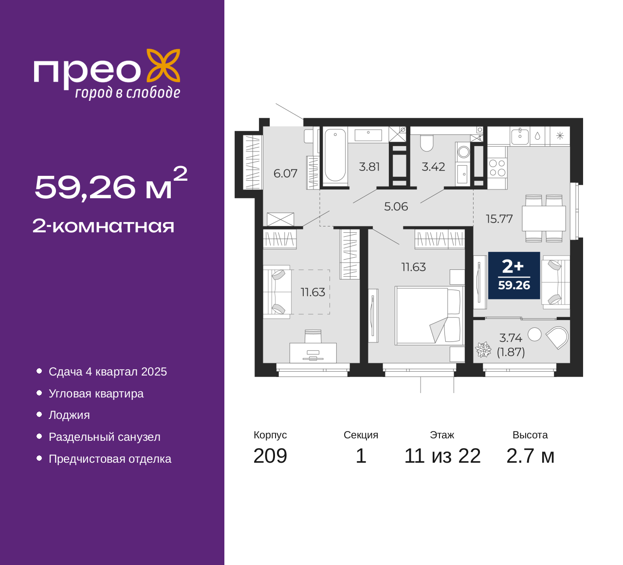- Общая площадь 59.26 м²