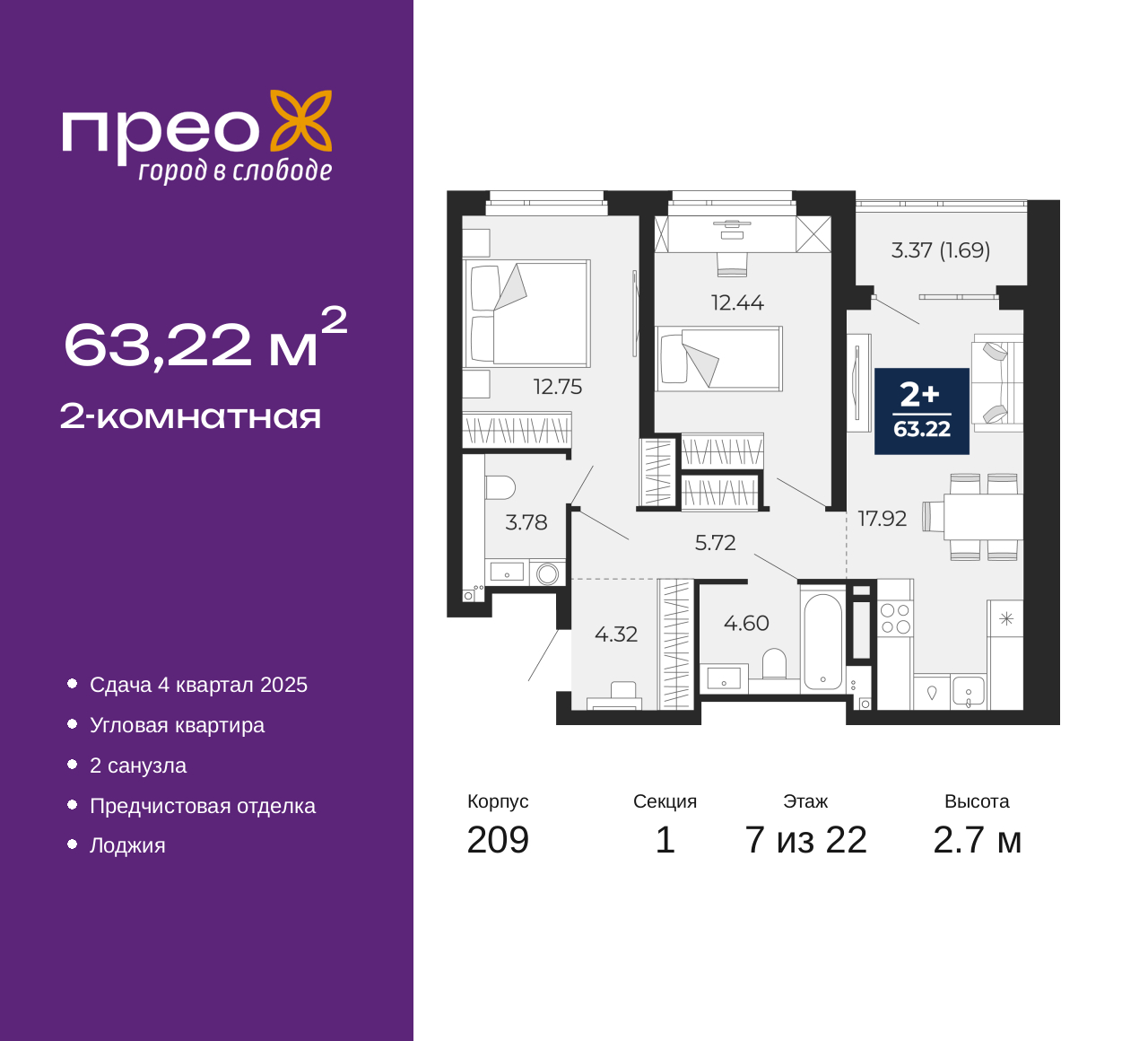 Просторная 2-комн. квартира с предчистовой отделкой в ЖК "Прео" на 7 этаже. Общая площадь: 63.22 кв.м., жилая: 25.19 кв.м., площадь просторной кухни-столовой: 17.92 кв.м. Квартира угловая, окна oбecпeчивaют paвнoмepнoe ocвeщeниe в тeчeниe дня. В квартире одна лоджия, один совмещенный и один раздельный санузел. Высота потолков 2.7 м. Квартира находится в корпусе 209. Дом монолитный, одноподъездный, высотой 22 этажа. На этаже 8 квартир. В подъезде 1 пассажирский и 1 грузовой лифт. Окончание строительства - 4 квартал 2025 года. Оформление сделки по договору долевого участия. Преображенский — один из самых привлекательных районов для жизни! Это полностью самостоятельный жилой район с точки зрения инфраструктуры. Преображенский находится между Московским и Червишевским трактами в квартале улиц Закалужская — Вьюжная — Александра Протозанова. Не нужно ждать, когда появится инфраструктура — переезжайте на всё готовое. Вблизи расположены действующие школа и детский сад. В этом году откроется еще один сад, а в следующем году — школа. По соседству с Преображенским запланировано строительство городского парка «Комарово» площадью 38 гектар. За 10 минут можно доехать на автомобиле до крупных ТРЦ: «Лента», «Кристалл», «Леруа Мерлен», «Метро» и «Ашан». С 2018 года в районе открыт Соседский центр — пространство, созданное для формирования добрососедской среды, совместного досуга, общения и реализации соседских инициатив. Здесь проходят встречи соседей, а также сами жители района организовывают мероприятия. Организатором такого события может стать любой желающий. В квартирах выполнена качественная предчистовая отделка. Гладкие стены с финишным выравниванием по маякам. Ровный потолок для установки натяжного потолка. Установлены пятикамерные окна с двойным стеклопакетом (3 стекла). Дизайнерские холлы с видеонаблюдением, безбарьерным и прозрачным входом – всегда светло и спокойно. На первом этаже есть просторные колясочные, где все жители могут оставлять свои коляски и велосипеды. В Преображенском есть всё, что нужно для активного отдыха и занятий спортом. Мы сделали большое футбольное поле с безопасным покрытием. Также установили хоккейный корт, который оборудован по всем необходимым стандартам. Во дворах можно делать упражнения на специальных площадках с турниками. Весь район мы обустроили велодорожками, которые связаны в единый маршрут. У нас есть сухие фонтаны, бьющие из земли, деревья, веревки, сетки, скалодром, газон, песок и резинка — осталось просто дать своему ребенку право на свободную игру. По-настоящему хорошие дворы — это те, которые дети предпочитают соцсетям и телевизору. Аккредитация в банках: ПАО «Банк Уралсиб», ОАО «Альфа-Банк», «Сбербанк России», ПАО Банк «ВТБ», ПАО «Газпромбанк» и других. (AQID02434717)