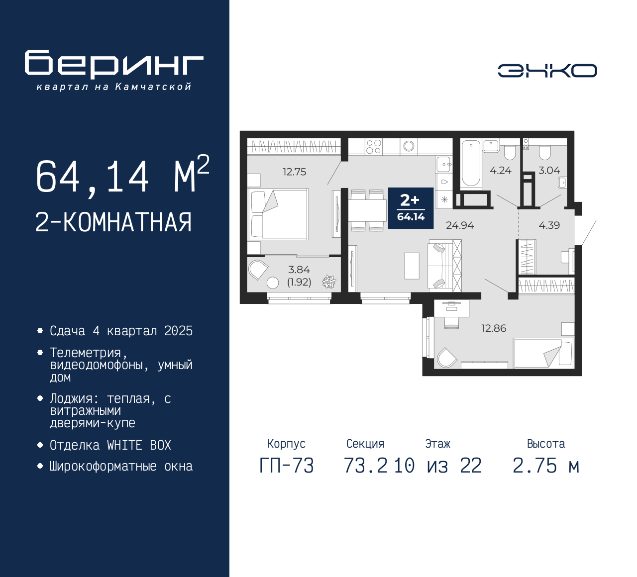Продается двухкомнатная квартира от застройщика в ЖК "Беринг" на 10 этаже. Квартира без отделки, новый собственник может сделать ремонт по индивидуальному проекту. Общая площадь: 64.14 кв.м., жилая: 25.61 кв.м., площадь просторной кухни-столовой: 24.94 кв.м. Угловая квартира, окна oбecпeчивaют paвнoмepнoe ocвeщeниe в тeчeниe дня. В квартире одна лоджия, один совмещенный и один раздельный санузел. Высота потолков 2.75 м. Дом монолитный, многоподъездный, переменной этажности, от 9 до 22 этажей. Квартира находится в 73.2-й секции высотой 22 этажа в корпусе ГП-73. На этаже 7 квартир. В подъезде 1 пассажирский и 1 грузовой лифт. Окончание строительства - 4 квартал 2025 года. Оформление сделки по договору долевого участия. Подобно знаменитому исследователю, мы чувствуем себя первооткрывателями этой локации. Хотим показать новую суть места, сформировать для вас жизненный опыт, которого ещё не было. Беринг — район зелёного цвета. Беринг — район, который откроется вам с другой стороны. Впечатлит новым уровнем комфорта и качеством жизни. Беринг — открытие на карте города. Первый квартал расположен в районе Тура, в границах улиц: Камчатская – Западносибирская – Энтузиастов. Вокруг уже есть всё для того, чтобы ежедневная рутина была лишь частью жизни и не доставляла дискомфорта. Школы и детские сады, магазины и аптеки, поликлиника, места для семейного отдыха, пеших и велопрогулок, и даже рыбалки. Масштабное озеленение дворов — визитная карточка ЭНКО и ваш оазис спокойствия, чтобы отвлечься от повседневности. Раскидистые деревья, кустарники, травы и цветы — осталось остановиться, вдохнуть и расслабиться, глядя на эту природную красоту. Стилистика подъездов продолжает концепцию Беринга, вдохновлённого Камчаткой: сдержанный, но при этом впечатляющий дизайн соседствует с удобством и функциональностью. (AQID02439036)