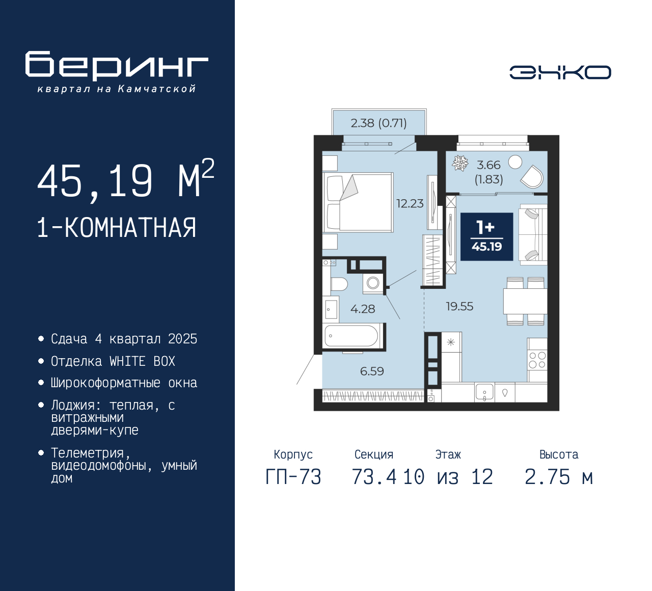 Просторная 1-комн. квартира в ЖК "Беринг" на 10 этаже. Квартира без отделки, после получения ключей можно делать ремонт. Общая площадь: 45.19 кв.м., жилая: 12.23 кв.м., площадь просторной кухни-столовой: 19.55 кв.м. Все окна выходят на одну сторону. В квартире один балкон и одна лоджия, один совмещенный санузел. Высота потолков 2.75 м. Дом монолитный, многоподъездный, переменной этажности, от 9 до 22 этажей. Квартира находится в 73.4-й секции высотой 12 этажей в корпусе ГП-73. На этаже 8 квартир. В подъезде 1 пассажирский и 1 грузовой лифт. Окончание строительства - 4 квартал 2025 года. Оформление сделки по договору долевого участия. Подобно знаменитому исследователю, мы чувствуем себя первооткрывателями этой локации. Хотим показать новую суть места, сформировать для вас жизненный опыт, которого ещё не было. Беринг — район зелёного цвета. Беринг — район, который откроется вам с другой стороны. Впечатлит новым уровнем комфорта и качеством жизни. Беринг — открытие на карте города. Первый квартал расположен в районе Тура, в границах улиц: Камчатская – Западносибирская – Энтузиастов. Вокруг уже есть всё для того, чтобы ежедневная рутина была лишь частью жизни и не доставляла дискомфорта. Школы и детские сады, магазины и аптеки, поликлиника, места для семейного отдыха, пеших и велопрогулок, и даже рыбалки. Масштабное озеленение дворов — визитная карточка ЭНКО и ваш оазис спокойствия, чтобы отвлечься от повседневности. Раскидистые деревья, кустарники, травы и цветы — осталось остановиться, вдохнуть и расслабиться, глядя на эту природную красоту. Стилистика подъездов продолжает концепцию Беринга, вдохновлённого Камчаткой: сдержанный, но при этом впечатляющий дизайн соседствует с удобством и функциональностью. (AQID02488044)