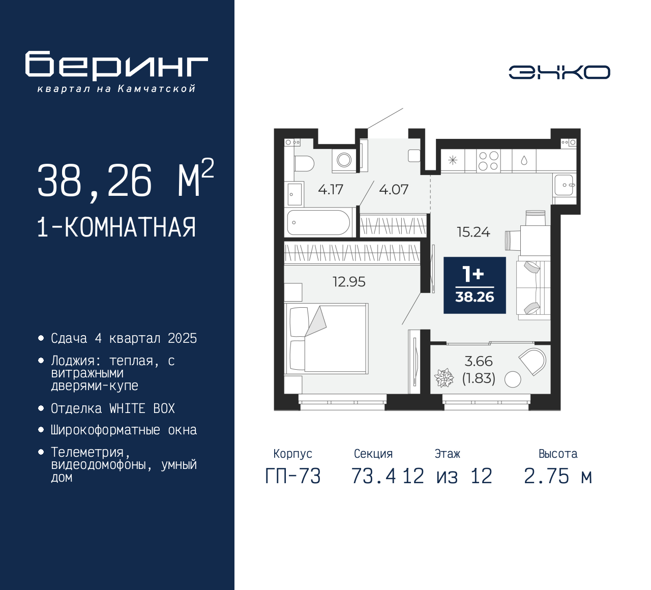 Продается 1-комн. квартира от застройщика в ЖК "Беринг" на 12 этаже. Квартира без отделки, после оформления собственности можно делать ремонт. Общая площадь: 38.26 кв.м., жилая: 12.95 кв.м., площадь просторной кухни-столовой: 15.48 кв.м. Все окна выходят на одну сторону. В квартире одна лоджия, один совмещенный санузел. Высота потолков 2.75 м. Дом монолитный, многоподъездный, переменной этажности, от 9 до 22 этажей. Квартира находится в 73.4-й секции высотой 12 этажей в корпусе ГП-73. На этаже 8 квартир. В подъезде 1 пассажирский и 1 грузовой лифт. Окончание строительства - 4 квартал 2025 года. Оформление сделки по договору долевого участия. Подобно знаменитому исследователю, мы чувствуем себя первооткрывателями этой локации. Хотим показать новую суть места, сформировать для вас жизненный опыт, которого ещё не было. Беринг — район зелёного цвета. Беринг — район, который откроется вам с другой стороны. Впечатлит новым уровнем комфорта и качеством жизни. Беринг — открытие на карте города. Первый квартал расположен в районе Тура, в границах улиц: Камчатская – Западносибирская – Энтузиастов. Вокруг уже есть всё для того, чтобы ежедневная рутина была лишь частью жизни и не доставляла дискомфорта. Школы и детские сады, магазины и аптеки, поликлиника, места для семейного отдыха, пеших и велопрогулок, и даже рыбалки. Масштабное озеленение дворов — визитная карточка ЭНКО и ваш оазис спокойствия, чтобы отвлечься от повседневности. Раскидистые деревья, кустарники, травы и цветы — осталось остановиться, вдохнуть и расслабиться, глядя на эту природную красоту. Стилистика подъездов продолжает концепцию Беринга, вдохновлённого Камчаткой: сдержанный, но при этом впечатляющий дизайн соседствует с удобством и функциональностью. (AQID02497858)