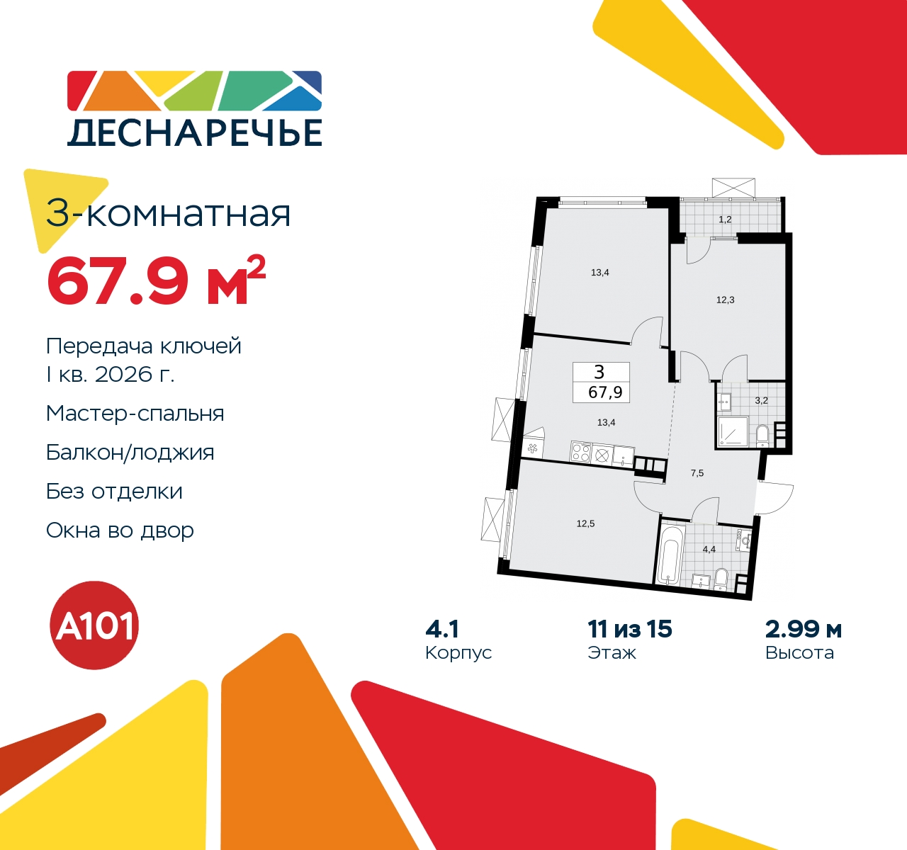 3-комн. квартира в ЖК "Деснаречье" на 11 этаже. Квартира без отделки, после оформления собственности можно делать ремонт. Общая площадь: 67.9 кв.м., жилая: 38.2 кв.м., площадь просторной кухни-столовой: 13.4 кв.м. Квартира угловая, идеально подойдет любителям тишины и панорамных видов. В квартире одна лоджия, два совмещенных санузла. Высота потолков 2.99 м. Эта квартира предлагается без отделки. Будут установлены стеклопакеты с повышенной тепло- и шумоизоляцией, в квартиру заведены все коммуникации. Вы сможете в полном объеме реализовать ваши идеи обустройства вашего комфортного дома. Для тех, кто ценит время и не хочет дополнительных трат на ремонт мы предлагаем квартиры с предчистовой и дизайнерской отделкой. Дом монолитный, трехподъездный, высотой 15 этажей. Квартира находится во 2-й секции в корпусе 4.1. На этаже 7 квартир. В подъезде 1 пассажирский и 1 грузовой лифт. Начало строительства - 3 квартал 2023 года. Окончание строительства - 1 квартал 2026 года. Оформление сделки по договору долевого участия. Артикул квартиры по базе застройщика 88К-4.1-150. ПРЕДЛОЖЕНИЯ ОТ ЗАСТРОЙЩИКА В ОКТЯБРЕ 2025: Ипотека от 13,9 % для всех! На весь срок. "Семейная ипотека" вернулась. Ставка от 3,5 % на весь срок! Без удорожания! Выгодное ипотечное комбо: Ипотека от 2200 р./мес. и от 6 % после рождения ребёнка! Ипотека для всех "Держи пять!" - ставка 5 % на 2 года! *более подробную информацию по скидкам и акциям уточняйте в отделе продаж Масштабный проект "Деснаречье" на юго-западе Москвы, который включает три новых района («квартала»), объединённые общей идеей – воплотить в реальность мечты современных жителей столицы об интересном, комфортном и разноплановом городском пространстве в окружении рек и лесов, словно сошедших с полотен русских живописцев: - «Берег» оценят все, кому близка водная стихия: плеск волн, солнечные блики и прогулки вдоль тихого течения речи. - «Лес» утопает в зелени парков и лесов. Здесь соблюдён идеальный баланс загородного спокойствия и столичного комфорта. - «Парк», самый энергичный и яркий, отличается высокой концентрацией пространств для спорта и творчества. Жилой комплекс "Деснаречье" расположится в 12 км от МКАД по современному Калужскому шоссе. Внешний облик зданий соответствует современному стилю и стандартам, характерным и для других популярных проектов ГК «А101»: сочетание контрастных тонов, большое количество остекления, в котором отражается небо, гармония с природным окружением. Весь город - в вашем районе. Находиться на территории «15-минутного города» значит иметь всё необходимое для полноценной жизни в шаговой доступности. Маршруты в районе «Деснаречье» выстроены так, чтобы добраться до магазинов, парков, школ, салонов услуг и других объектов можно было всего за несколько минут пешком или на велосипеде. Двор закрытый от машин – это тишина, комфорт и безопасность, поэтому все машино-места (включая «семейные» и увеличенные, с возможностью установки роллетных шкафов) находятся в подземном паркинге. В паркинги можно спуститься на лифте из любого подъезда или по лестнице. Рядом с «Деснаречьем» в 2027 году планируется открытие станции метро «Десна», до которой будет удобно добраться пешком или на велосипеде. Дорога на автомобиле до перехватывающих парковок станций «Ольховая» и «Прокшино» займёт около 10 минут. В процессе реализации проекта будут появлятьс