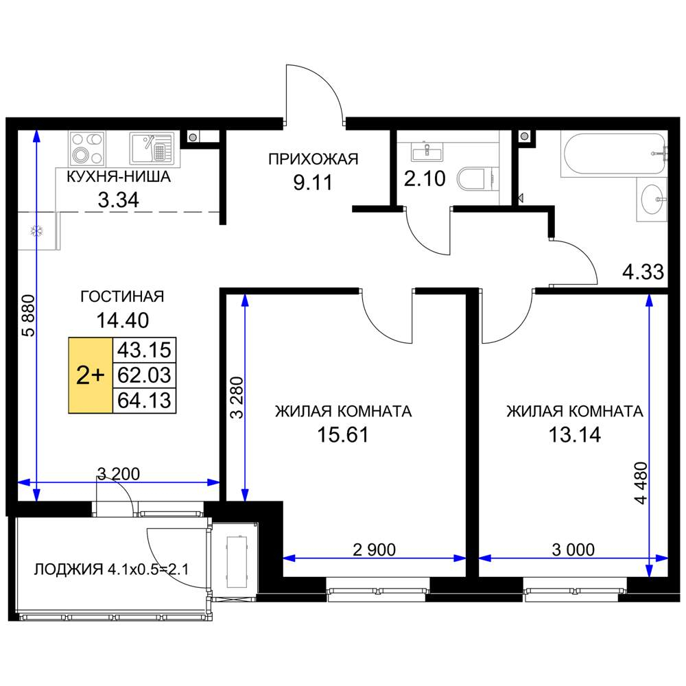 - Жилая площадь 43.15 м²