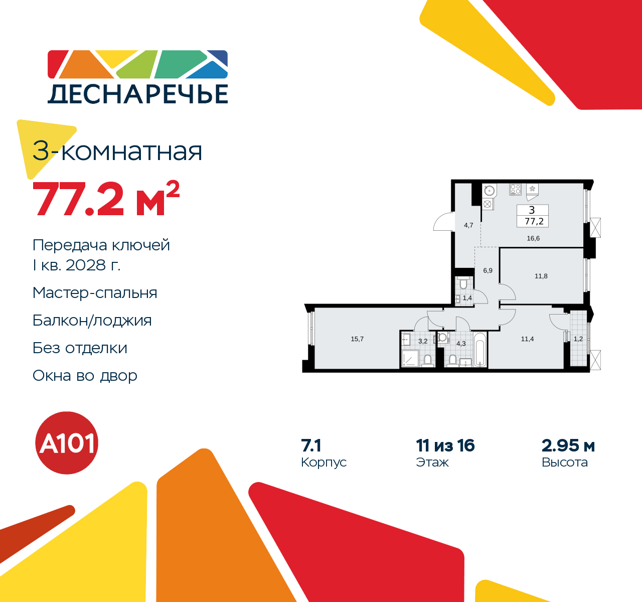 Продается трехкомнатная квартира в ЖК "Деснаречье" на 11 этаже. Квартира без отделки, после оформления собственности можно делать ремонт. Общая площадь: 77.2 кв.м., жилая: 38.9 кв.м., площадь просторной кухни-столовой: 16.6 кв.м. Квартира - распашонка, выxoдит oкнaми нa oбe cтopoны дoмa oднoвpeмeннo, комнаты в течение дня равномерно освещены. В квартире одна лоджия, два совмещенных санузла. Высота потолков 2.95 м. Эта квартира предлагается без отделки. Будут установлены стеклопакеты с повышенной тепло- и шумоизоляцией, в квартиру заведены все коммуникации. Вы сможете в полном объеме реализовать ваши идеи обустройства вашего комфортного дома. Для тех, кто ценит время и не хочет дополнительных трат на ремонт мы предлагаем квартиры с предчистовой и дизайнерской отделкой. Дом монолитный, многоподъездный, переменной этажности, от 8 до 16 этажей. Квартира находится в 3-й секции высотой 14 этажей в корпусе 7.1. На этаже 6 квартир. В подъезде 1 пассажирский и 1 грузовой лифт. Начало строительства - 2 квартал 2025 года. Окончание строительства - 1 квартал 2028 года. Оформление сделки по договору долевого участия. Артикул квартиры по базе застройщика 88К-7.1-174. ПРЕДЛОЖЕНИЯ ОТ ЗАСТРОЙЩИКА В ОКТЯБРЕ 2025: Ипотека от 13,9 % для всех! На весь срок. "Семейная ипотека" вернулась. Ставка от 3,5 % на весь срок! Без удорожания! Выгодное ипотечное комбо: Ипотека от 2200 р./мес. и от 6 % после рождения ребёнка! Ипотека для всех "Держи пять!" - ставка 5 % на 2 года! *более подробную информацию по скидкам и акциям уточняйте в отделе продаж Масштабный проект "Деснаречье" на юго-западе Москвы, который включает три новых района («квартала»), объединённые общей идеей – воплотить в реальность мечты современных жителей столицы об интересном, комфортном и разноплановом городском пространстве в окружении рек и лесов, словно сошедших с полотен русских живописцев: - «Берег» оценят все, кому близка водная стихия: плеск волн, солнечные блики и прогулки вдоль тихого течения речи. - «Лес» утопает в зелени парков и лесов. Здесь соблюдён идеальный баланс загородного спокойствия и столичного комфорта. - «Парк», самый энергичный и яркий, отличается высокой концентрацией пространств для спорта и творчества. Жилой комплекс "Деснаречье" расположится в 12 км от МКАД по современному Калужскому шоссе. Внешний облик зданий соответствует современному стилю и стандартам, характерным и для других популярных проектов ГК «А101»: сочетание контрастных тонов, большое количество остекления, в котором отражается небо, гармония с природным окружением. Весь город - в вашем районе. Находиться на территории «15-минутного города» значит иметь всё необходимое для полноценной жизни в шаговой доступности. Маршруты в районе «Деснаречье» выстроены так, чтобы добраться до магазинов, парков, школ, салонов услуг и других объектов можно было всего за несколько минут пешком или на велосипеде. Двор закрытый от машин – это тишина, комфорт и безопасность, поэтому все машино-места (включая «семейные» и увеличенные, с возможностью установки роллетных шкафов) находятся в подземном паркинге. В паркинги можно спуститься на лифте из любого подъезда или по лестнице. Рядом с «Деснаречьем» в 2027 году планируется открытие станции метро «Десна», до которой будет удобно добраться пешком или на велосипеде. Дорога на автомобиле до перехватывающих парковок станций «Ольх