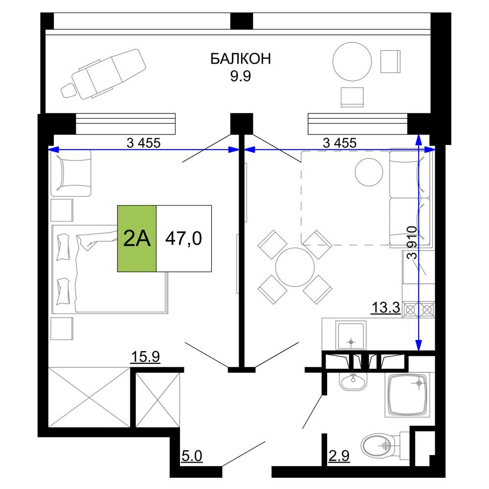 - Общая площадь 47 м²