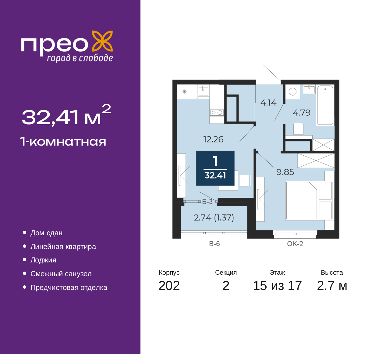 1-комн. квартира от застройщика с предчистовой отделкой в ЖК "Прео" на 15 этаже. Общая площадь: 32.41 кв.м., жилая: 9.85 кв.м., площадь просторной кухни-столовой: 12.23 кв.м. Все окна выходят на одну сторону. В квартире одна лоджия, один совмещенный санузел. Высота потолков 2.7 м. Дом монолитный, двухподъездный, высотой 17 этажей. Квартира находится во 2-й секции в корпусе 202. На этаже 7 квартир. В подъезде 1 пассажирский и 1 грузовой лифт. Строительство завершено, дом сдан в 4 квартале 2024 года. Оформление сделки по договору купли-продажи. Преображенский — один из самых привлекательных районов для жизни! Это полностью самостоятельный жилой район с точки зрения инфраструктуры. Преображенский находится между Московским и Червишевским трактами в квартале улиц Закалужская — Вьюжная — Александра Протозанова. Не нужно ждать, когда появится инфраструктура — переезжайте на всё готовое. Вблизи расположены действующие школа и детский сад. В этом году откроется еще один сад, а в следующем году — школа. По соседству с Преображенским запланировано строительство городского парка «Комарово» площадью 38 гектар. За 10 минут можно доехать на автомобиле до крупных ТРЦ: «Лента», «Кристалл», «Леруа Мерлен», «Метро» и «Ашан». С 2018 года в районе открыт Соседский центр — пространство, созданное для формирования добрососедской среды, совместного досуга, общения и реализации соседских инициатив. Здесь проходят встречи соседей, а также сами жители района организовывают мероприятия. Организатором такого события может стать любой желающий. В квартирах выполнена качественная предчистовая отделка. Гладкие стены с финишным выравниванием по маякам. Ровный потолок для установки натяжного потолка. Установлены пятикамерные окна с двойным стеклопакетом (3 стекла). Дизайнерские холлы с видеонаблюдением, безбарьерным и прозрачным входом – всегда светло и спокойно. На первом этаже есть просторные колясочные, где все жители могут оставлять свои коляски и велосипеды. В Преображенском есть всё, что нужно для активного отдыха и занятий спортом. Мы сделали большое футбольное поле с безопасным покрытием. Также установили хоккейный корт, который оборудован по всем необходимым стандартам. Во дворах можно делать упражнения на специальных площадках с турниками. Весь район мы обустроили велодорожками, которые связаны в единый маршрут. У нас есть сухие фонтаны, бьющие из земли, деревья, веревки, сетки, скалодром, газон, песок и резинка — осталось просто дать своему ребенку право на свободную игру. По-настоящему хорошие дворы — это те, которые дети предпочитают соцсетям и телевизору. Аккредитация в банках: ОАО «Альфа-Банк», «Сбербанк России», ПАО Банк «ВТБ», ПАО «Газпромбанк», ПАО «Банк Уралсиб» и других. (AQID02520780)