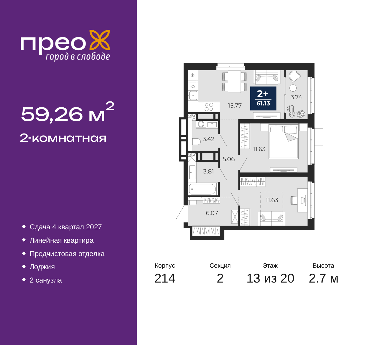 2-комн. квартира с предчистовой отделкой в ЖК "Прео" на 13 этаже. Общая площадь: 59.26 кв.м., жилая: 23.26 кв.м., площадь просторной кухни-столовой: 15.77 кв.м. Комнаты изолированные, все окна выходят на одну сторону. В квартире одна лоджия, один совмещенный и один раздельный санузел. Высота потолков 2.7 м. Дом монолитный, двухподъездный, переменной этажности, от 12 до 20 этажей. Квартира находится во 2-й секции высотой 20 этажей в корпусе 214. На этаже 8 квартир. В подъезде 1 пассажирский и 1 грузовой лифт. Окончание строительства - 4 квартал 2027 года. Оформление сделки по договору долевого участия. Преображенский — один из самых привлекательных районов для жизни! Это полностью самостоятельный жилой район с точки зрения инфраструктуры. Преображенский находится между Московским и Червишевским трактами в квартале улиц Закалужская — Вьюжная — Александра Протозанова. Не нужно ждать, когда появится инфраструктура — переезжайте на всё готовое. Вблизи расположены действующие школа и детский сад. В этом году откроется еще один сад, а в следующем году — школа. По соседству с Преображенским запланировано строительство городского парка «Комарово» площадью 38 гектар. За 10 минут можно доехать на автомобиле до крупных ТРЦ: «Лента», «Кристалл», «Леруа Мерлен», «Метро» и «Ашан». С 2018 года в районе открыт Соседский центр — пространство, созданное для формирования добрососедской среды, совместного досуга, общения и реализации соседских инициатив. Здесь проходят встречи соседей, а также сами жители района организовывают мероприятия. Организатором такого события может стать любой желающий. В квартирах выполнена качественная предчистовая отделка. Гладкие стены с финишным выравниванием по маякам. Ровный потолок для установки натяжного потолка. Установлены пятикамерные окна с двойным стеклопакетом (3 стекла). Дизайнерские холлы с видеонаблюдением, безбарьерным и прозрачным входом – всегда светло и спокойно. На первом этаже есть просторные колясочные, где все жители могут оставлять свои коляски и велосипеды. В Преображенском есть всё, что нужно для активного отдыха и занятий спортом. Мы сделали большое футбольное поле с безопасным покрытием. Также установили хоккейный корт, который оборудован по всем необходимым стандартам. Во дворах можно делать упражнения на специальных площадках с турниками. Весь район мы обустроили велодорожками, которые связаны в единый маршрут. У нас есть сухие фонтаны, бьющие из земли, деревья, веревки, сетки, скалодром, газон, песок и резинка — осталось просто дать своему ребенку право на свободную игру. По-настоящему хорошие дворы — это те, которые дети предпочитают соцсетям и телевизору. Аккредитация в банках: ПАО «Банк Уралсиб», «Сбербанк России», ПАО «Газпромбанк», ОАО «Альфа-Банк», ПАО Банк «ВТБ» и других. (AQID02525568)