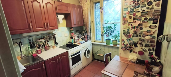3-комнатная квартира с линейной планировкой. Все комнаты изолированные, в дальней от входа комнате есть лоджия. Все окна выходят на противоположную сторону от входа в подъезд. Хорошая звуко- и теплоизоляция(толстые наружные стены толщиной в 30 см). Большие окна с видом на двор.