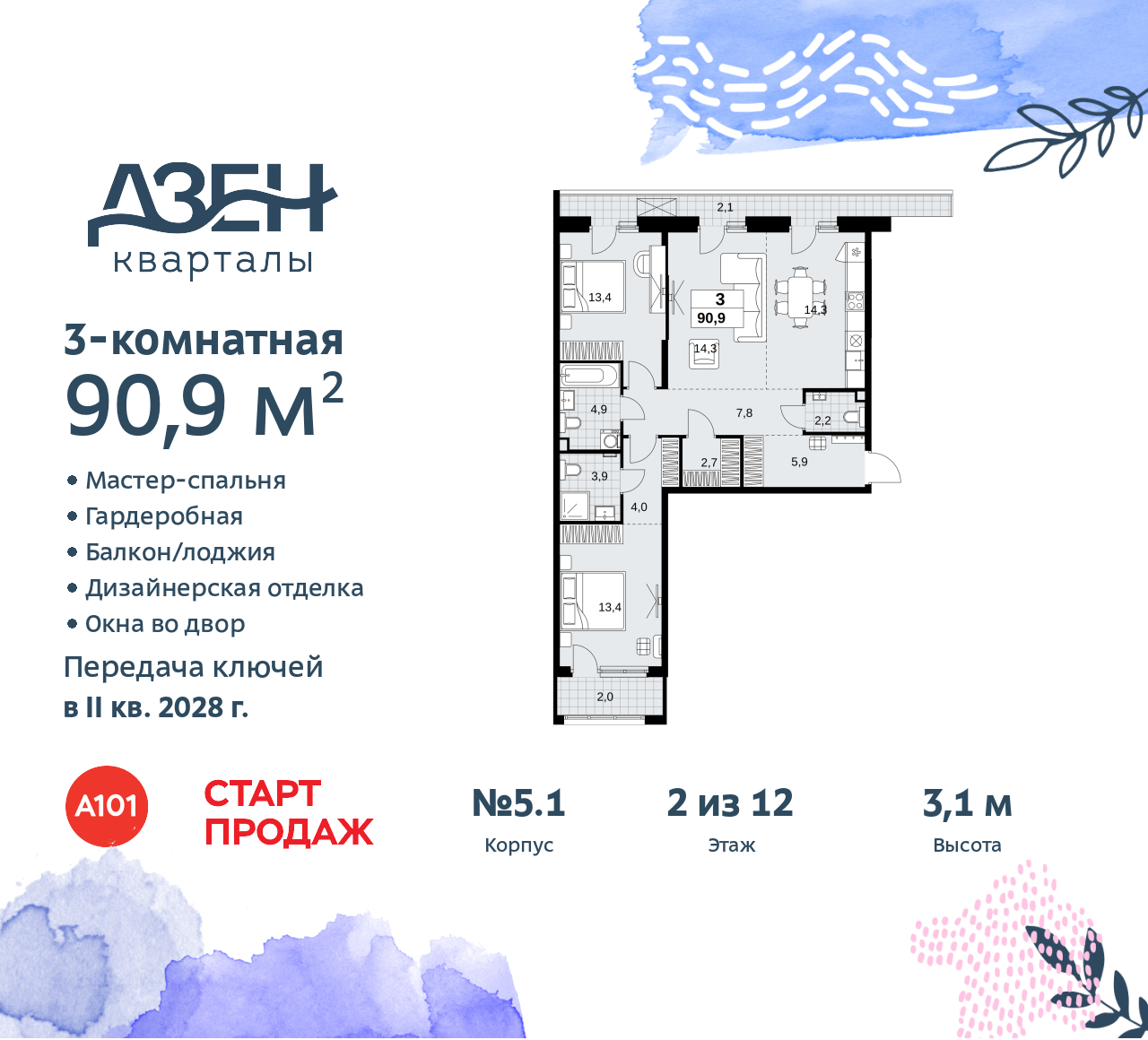 3-комн. квартира бизнес-класса с европланировкой и отделкой в ЖК "Дзен-кварталы" на 2 этаже. Общая площадь: 90.9 кв.м., жилая: 41.1 кв.м., общая площадь гостиной-столовой с кухонной зоной: 28.6 кв.м. Европланировка, кухня и гостиная объединены в одно просторное помещение. Квартира - распашонка, без проходных комнат, окна выходят на paзные стороны дома. В квартире два балкона, два совмещенных санузла. Высота потолков 3.1 м. Имеется ниша под гардероб. Дом монолитный, черырехподъездный, переменной этажности, от 8 до 12 этажей. Квартира находится в 3-й секции высотой 8 этажей в корпусе бизнес-класса 5.1. На этаже 4 квартиры. В подъезде 1 грузовой лифт. Начало строительства - 3 квартал 2025 года. Окончание строительства - 2 квартал 2028 года. Оформление сделки по договору долевого участия. Артикул квартиры по базе застройщика 41К-5.1-83. В шаговой доступности от жилого комплекса находятся станции метро (расстояние по прямой): «Новомосковская (Коммунарка)» (800 м), «Новомосковская» (800 м), «Потапово» (1.1 км), также недалеко от этого корпуса расположены станции метро: «Коммунарка», «Улица Горчакова», «Бульвар адмирала Ушакова», «Ольховая», «Бунинская аллея». ПРЕДЛОЖЕНИЯ ОТ ЗАСТРОЙЩИКА В ОКТЯБРЕ 2025: Ипотека от 13,9 % для всех! На весь срок. "Семейная ипотека" вернулась. Ставка от 3,5 % на весь срок! Без удорожания! Выгодное ипотечное комбо: Ипотека от 2200 р./мес. и от 6 % после рождения ребёнка! Ипотека для всех "Держи пять!" - ставка 5 % на 2 года! *более подробную информацию по скидкам и акциям уточняйте в отделе продаж Новый район «Дзен-кварталы» возводится на юго-западе столицы – вдоль береговой линии живописного Ивановского пруда и реки Варварки. В основе проекта – «сочетание несочетаемого», гармония простого и утончённого, природного и урбанистического – стиль Japandi, объединяющий скандинавскую функциональность и восточную созерцательность. В приятном соседстве с домами нового района живописный Ивановский пруд — его береговая линия проходит по территории «Дзен-кварталов». Здесь будет благоустроена набережная для отдыха жителей нового района — по авторскому проекту Группы компаний «А101». На территории района появятся два детских сада и крупный образовательный комплекс, в состав которого войдут детский сад и школа. Все они будут спроектированы на основе собственной концепции образовательной среды ГК «А101», разработанной экспертами в области педагогики, детский психологии и эргономики учебных пространств. Фасадные решения выполнены в современном архитектурном стиле, основанном на сочетании японского минимализма и скандинавской функциональности. Использованы природные оттенки спокойного японского пейзажа, материалы, имитирующие натуральные поверхности – штукатурка, облицовочная плитка разных размеров и текстур. Подобный стилистический подход делает пространство созерцательными и гармоничным. Для комфортного хранения габаритных и сезонных вещей на уровне подземного этажа спланированы удобные кладовые помещения. Доступ в них осуществляется на лифте. Отличная транспортная доступность. 2 станции метро, "Коммунарка" и "Потапово" в минутной шаговой доступности. Обстановки общественного транспорт, транспортные развязки и удобный выезд на трассу Солнцево – Бутово – Варшавское шоссе. (AQID02501987)