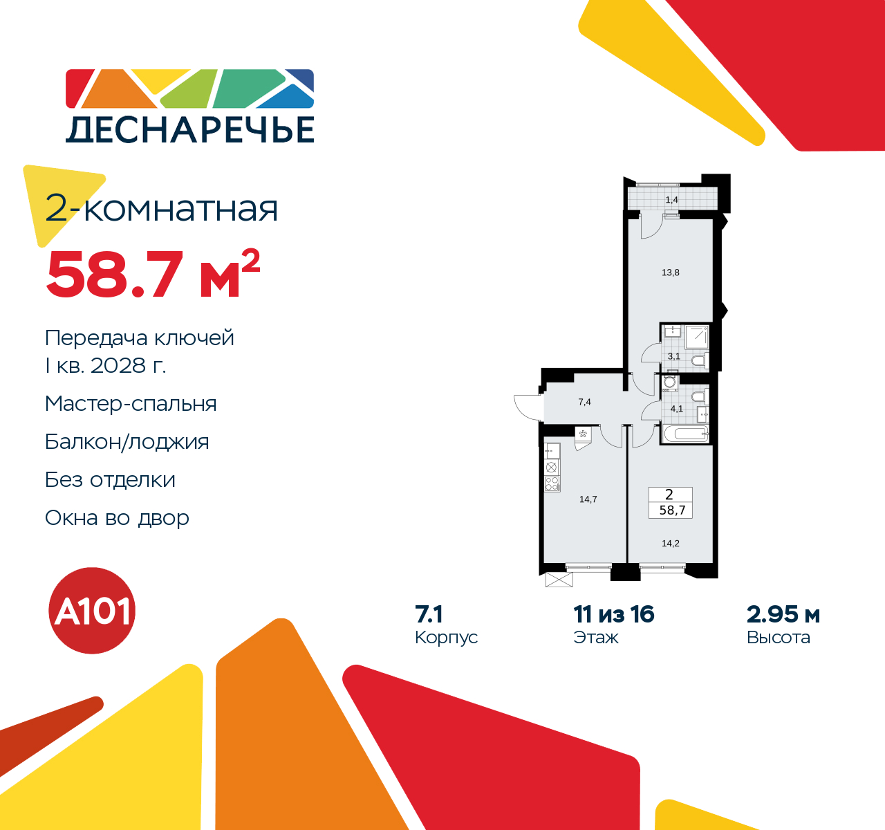 Продается 2-комн. квартира от застройщика в ЖК "Деснаречье" на 11 этаже. Квартира без отделки, после оформления собственности можно делать ремонт. Общая площадь: 58.7 кв.м., жилая: 28 кв.м., площадь просторной кухни-столовой: 14.7 кв.м. Квартира - распашонка, без проходных комнат, окна выходят на paзные стороны дома. В квартире одна лоджия, два совмещенных санузла. Высота потолков 2.95 м. Эта квартира предлагается без отделки. Будут установлены стеклопакеты с повышенной тепло- и шумоизоляцией, в квартиру заведены все коммуникации. Вы сможете в полном объеме реализовать ваши идеи обустройства вашего комфортного дома. Для тех, кто ценит время и не хочет дополнительных трат на ремонт мы предлагаем квартиры с предчистовой и дизайнерской отделкой. Дом монолитный, многоподъездный, переменной этажности, от 8 до 16 этажей. Квартира находится в 1-й секции высотой 14 этажей в корпусе 7.1. На этаже 5 квартир. В подъезде 1 пассажирский и 1 грузовой лифт. Начало строительства - 2 квартал 2025 года. Окончание строительства - 1 квартал 2028 года. Оформление сделки по договору долевого участия. Артикул квартиры по базе застройщика 88К-7.1-50. ПРЕДЛОЖЕНИЯ ОТ ЗАСТРОЙЩИКА В ОКТЯБРЕ 2025: Ипотека от 13,9 % для всех! На весь срок. "Семейная ипотека" вернулась. Ставка от 3,5 % на весь срок! Без удорожания! Выгодное ипотечное комбо: Ипотека от 2200 р./мес. и от 6 % после рождения ребёнка! Ипотека для всех "Держи пять!" - ставка 5 % на 2 года! *более подробную информацию по скидкам и акциям уточняйте в отделе продаж Масштабный проект "Деснаречье" на юго-западе Москвы, который включает три новых района («квартала»), объединённые общей идеей – воплотить в реальность мечты современных жителей столицы об интересном, комфортном и разноплановом городском пространстве в окружении рек и лесов, словно сошедших с полотен русских живописцев: - «Берег» оценят все, кому близка водная стихия: плеск волн, солнечные блики и прогулки вдоль тихого течения речи. - «Лес» утопает в зелени парков и лесов. Здесь соблюдён идеальный баланс загородного спокойствия и столичного комфорта. - «Парк», самый энергичный и яркий, отличается высокой концентрацией пространств для спорта и творчества. Жилой комплекс "Деснаречье" расположится в 12 км от МКАД по современному Калужскому шоссе. Внешний облик зданий соответствует современному стилю и стандартам, характерным и для других популярных проектов ГК «А101»: сочетание контрастных тонов, большое количество остекления, в котором отражается небо, гармония с природным окружением. Весь город - в вашем районе. Находиться на территории «15-минутного города» значит иметь всё необходимое для полноценной жизни в шаговой доступности. Маршруты в районе «Деснаречье» выстроены так, чтобы добраться до магазинов, парков, школ, салонов услуг и других объектов можно было всего за несколько минут пешком или на велосипеде. Двор закрытый от машин – это тишина, комфорт и безопасность, поэтому все машино-места (включая «семейные» и увеличенные, с возможностью установки роллетных шкафов) находятся в подземном паркинге. В паркинги можно спуститься на лифте из любого подъезда или по лестнице. Рядом с «Деснаречьем» в 2027 году планируется открытие станции метро «Десна», до которой будет удобно добраться пешком или на велосипеде. Дорога на автомобиле до перехватывающих парковок станций «Ольховая» и «Прокшино» 