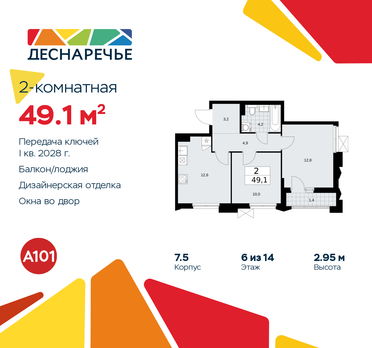 2-комн. квартира от застройщика с отделкой в ЖК "Деснаречье" на 6 этаже. Общая площадь: 49.1 кв.м., жилая: 22.8 кв.м., площадь просторной кухни-столовой: 12.6 кв.м. Угловая квартира, идеально подойдет любителям тишины и панорамных видов. В квартире одна лоджия, один совмещенный санузел. Высота потолков 2.95 м. Эта квартира будет сдана с дизайнеркой отделкой "под ключ". Специально для вас мы разработали несколько решений дизайнерской отделки. В отделке используются только современный высококлассные материалы, на все работы предоставляется гарантия. В таком случае вы оплачиваете отделку в сегодняшних ценах, а эту стоимость вы можете разнести в ипотечных платежах. Дом монолитный, трехподъездный, переменной этажности, от 11 до 17 этажей. Квартира находится в 3-й секции высотой 14 этажей в корпусе 7.5. На этаже 5 квартир. В подъезде 1 пассажирский и 1 грузовой лифт. Начало строительства - 2 квартал 2025 года. Окончание строительства - 1 квартал 2028 года. Оформление сделки по договору долевого участия. Артикул квартиры по базе застройщика 88К-7.5-1173. ПРЕДЛОЖЕНИЯ ОТ ЗАСТРОЙЩИКА В ОКТЯБРЕ 2025: Ипотека от 13,9 % для всех! На весь срок. "Семейная ипотека" вернулась. Ставка от 3,5 % на весь срок! Без удорожания! Выгодное ипотечное комбо: Ипотека от 2200 р./мес. и от 6 % после рождения ребёнка! Ипотека для всех "Держи пять!" - ставка 5 % на 2 года! *более подробную информацию по скидкам и акциям уточняйте в отделе продаж Масштабный проект "Деснаречье" на юго-западе Москвы, который включает три новых района («квартала»), объединённые общей идеей – воплотить в реальность мечты современных жителей столицы об интересном, комфортном и разноплановом городском пространстве в окружении рек и лесов, словно сошедших с полотен русских живописцев: - «Берег» оценят все, кому близка водная стихия: плеск волн, солнечные блики и прогулки вдоль тихого течения речи. - «Лес» утопает в зелени парков и лесов. Здесь соблюдён идеальный баланс загородного спокойствия и столичного комфорта. - «Парк», самый энергичный и яркий, отличается высокой концентрацией пространств для спорта и творчества. Жилой комплекс "Деснаречье" расположится в 12 км от МКАД по современному Калужскому шоссе. Внешний облик зданий соответствует современному стилю и стандартам, характерным и для других популярных проектов ГК «А101»: сочетание контрастных тонов, большое количество остекления, в котором отражается небо, гармония с природным окружением. Весь город - в вашем районе. Находиться на территории «15-минутного города» значит иметь всё необходимое для полноценной жизни в шаговой доступности. Маршруты в районе «Деснаречье» выстроены так, чтобы добраться до магазинов, парков, школ, салонов услуг и других объектов можно было всего за несколько минут пешком или на велосипеде. Двор закрытый от машин – это тишина, комфорт и безопасность, поэтому все машино-места (включая «семейные» и увеличенные, с возможностью установки роллетных шкафов) находятся в подземном паркинге. В паркинги можно спуститься на лифте из любого подъезда или по лестнице. Рядом с «Деснаречьем» в 2027 году планируется открытие станции метро «Десна», до которой будет удобно добраться пешком или на велосипеде. Дорога на автомобиле до перехватывающих парковок станций «Ольховая» и «Прокшино» займёт около 10 минут. В процессе реализации проекта будут появляться новые маршр