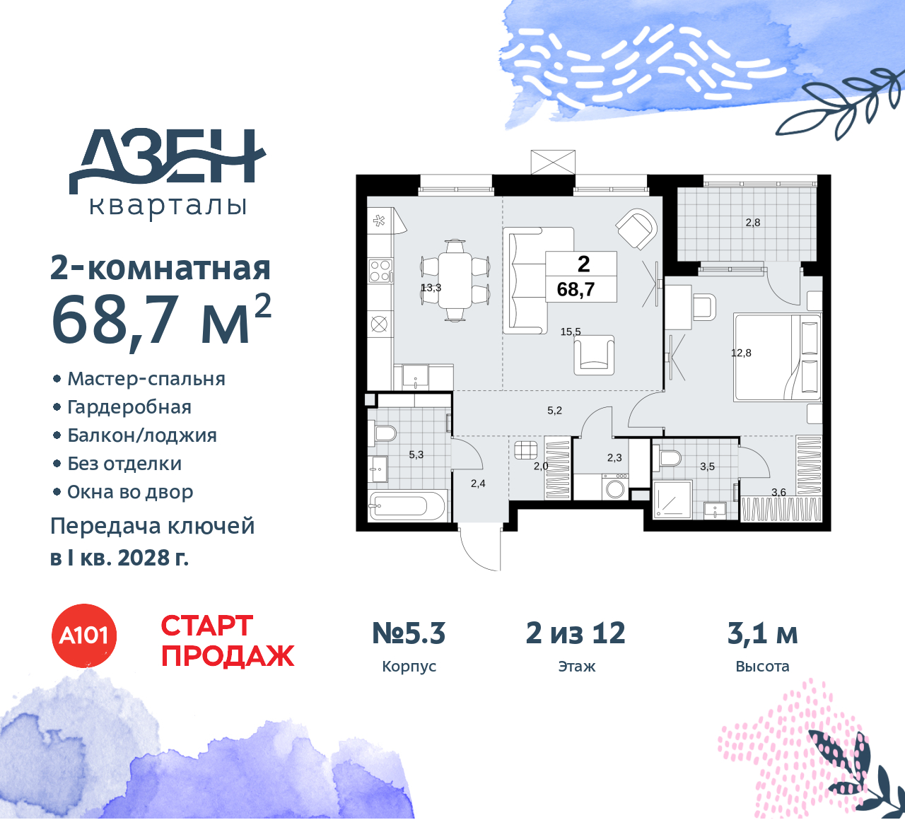 Продается двухкомнатная квартира бизнес-класса с европланировкой в ЖК "Дзен-кварталы" на 2 этаже. Квартира без отделки, новый владелец может сделать ремонт по индивидуальному проекту. Общая площадь: 68.7 кв.м., жилая: 28.3 кв.м., общая площадь гостиной-столовой с кухонной зоной: 28.8 кв.м. Европланировка, зона гостиной комнаты объединена с кухней. Комнаты изолированные, все окна выходят на одну сторону. В квартире одна лоджия, два совмещенных санузла. Высота потолков 3.1 м. Эта квартира предлагается без отделки. Будут установлены стеклопакеты с повышенной тепло- и шумоизоляцией, в квартиру заведены все коммуникации. Вы сможете в полном объеме реализовать ваши идеи обустройства вашего комфортного дома. Имеется ниша под гардероб. Дом монолитный, трехподъездный, переменной этажности, от 8 до 12 этажей. Квартира находится в 1-й секции высотой 8 этажей в корпусе бизнес-класса 5.3. На этаже 3 квартиры. В подъезде 1 грузовой лифт. Начало строительства - 3 квартал 2025 года. Окончание строительства - 1 квартал 2028 года. Оформление сделки по договору долевого участия. Артикул квартиры по базе застройщика 41К-5.3-280. В шаговой доступности от жилого комплекса расположены станции метро (расстояние по прямой): «Новомосковская (Коммунарка)» (800 м), «Новомосковская» (800 м), «Потапово» (1.1 км), также недалеко от этого корпуса расположены станции метро: «Коммунарка», «Улица Горчакова», «Бульвар адмирала Ушакова», «Ольховая», «Бунинская аллея». ПРЕДЛОЖЕНИЯ ОТ ЗАСТРОЙЩИКА В ОКТЯБРЕ 2025: Ипотека от 13,9 % для всех! На весь срок. "Семейная ипотека" вернулась. Ставка от 3,5 % на весь срок! Без удорожания! Выгодное ипотечное комбо: Ипотека от 2200 р./мес. и от 6 % после рождения ребёнка! Ипотека для всех "Держи пять!" - ставка 5 % на 2 года! *более подробную информацию по скидкам и акциям уточняйте в отделе продаж Новый район «Дзен-кварталы» возводится на юго-западе столицы – вдоль береговой линии живописного Ивановского пруда и реки Варварки. В основе проекта – «сочетание несочетаемого», гармония простого и утончённого, природного и урбанистического – стиль Japandi, объединяющий скандинавскую функциональность и восточную созерцательность. В приятном соседстве с домами нового района живописный Ивановский пруд — его береговая линия проходит по территории «Дзен-кварталов». Здесь будет благоустроена набережная для отдыха жителей нового района — по авторскому проекту Группы компаний «А101». На территории района появятся два детских сада и крупный образовательный комплекс, в состав которого войдут детский сад и школа. Все они будут спроектированы на основе собственной концепции образовательной среды ГК «А101», разработанной экспертами в области педагогики, детский психологии и эргономики учебных пространств. Фасадные решения выполнены в современном архитектурном стиле, основанном на сочетании японского минимализма и скандинавской функциональности. Использованы природные оттенки спокойного японского пейзажа, материалы, имитирующие натуральные поверхности – штукатурка, облицовочная плитка разных размеров и текстур. Подобный стилистический подход делает пространство созерцательными и гармоничным. Для комфортного хранения габаритных и сезонных вещей на уровне подземного этажа спланированы удобные кладовые помещения. Доступ в них осуществляется на лифте. Отличная транспортная досту