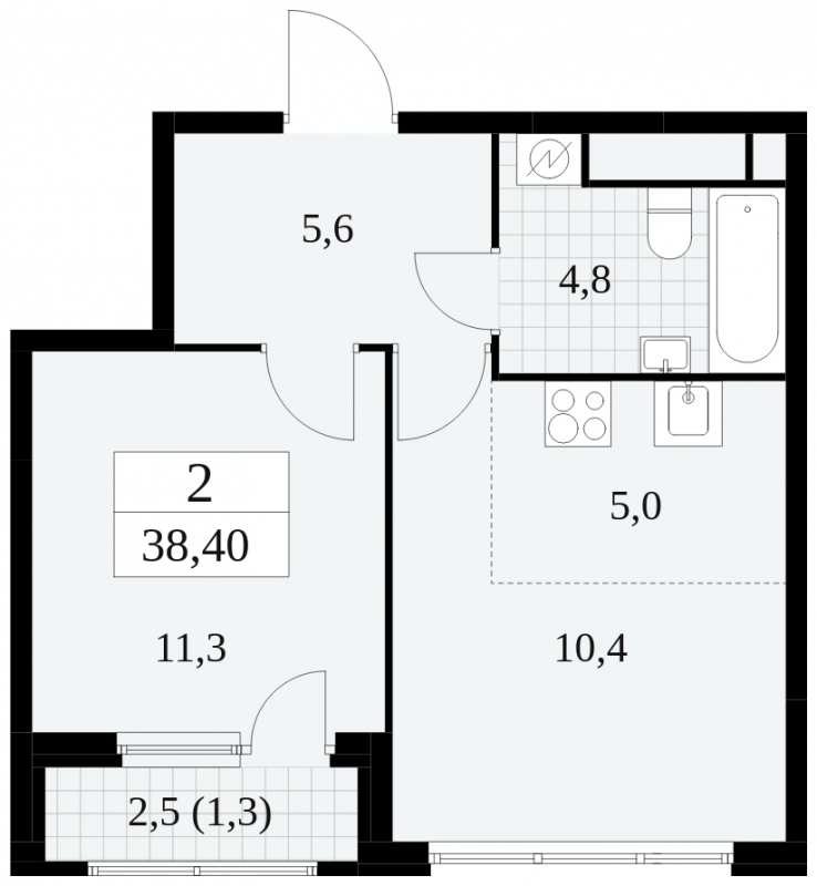 - Общая площадь 38.4 м²