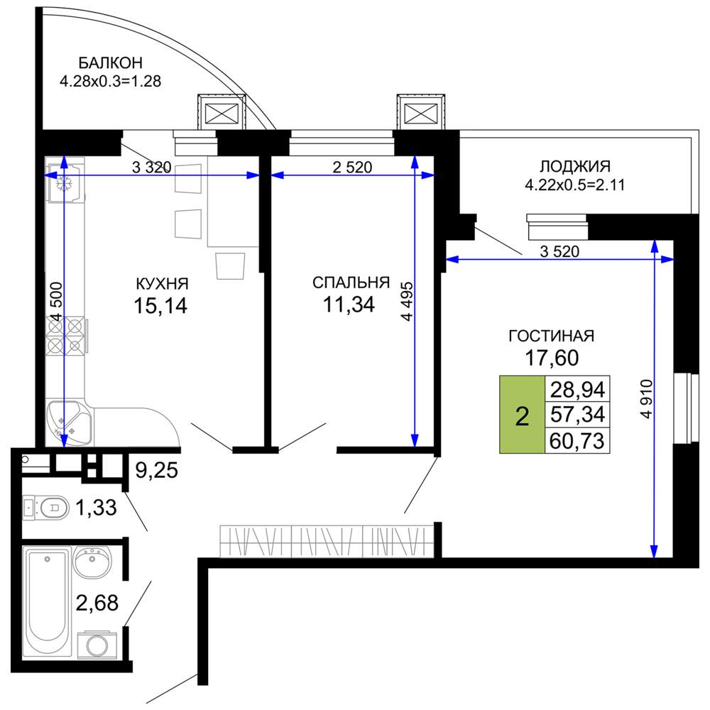 - Общая площадь 60.73 м²
