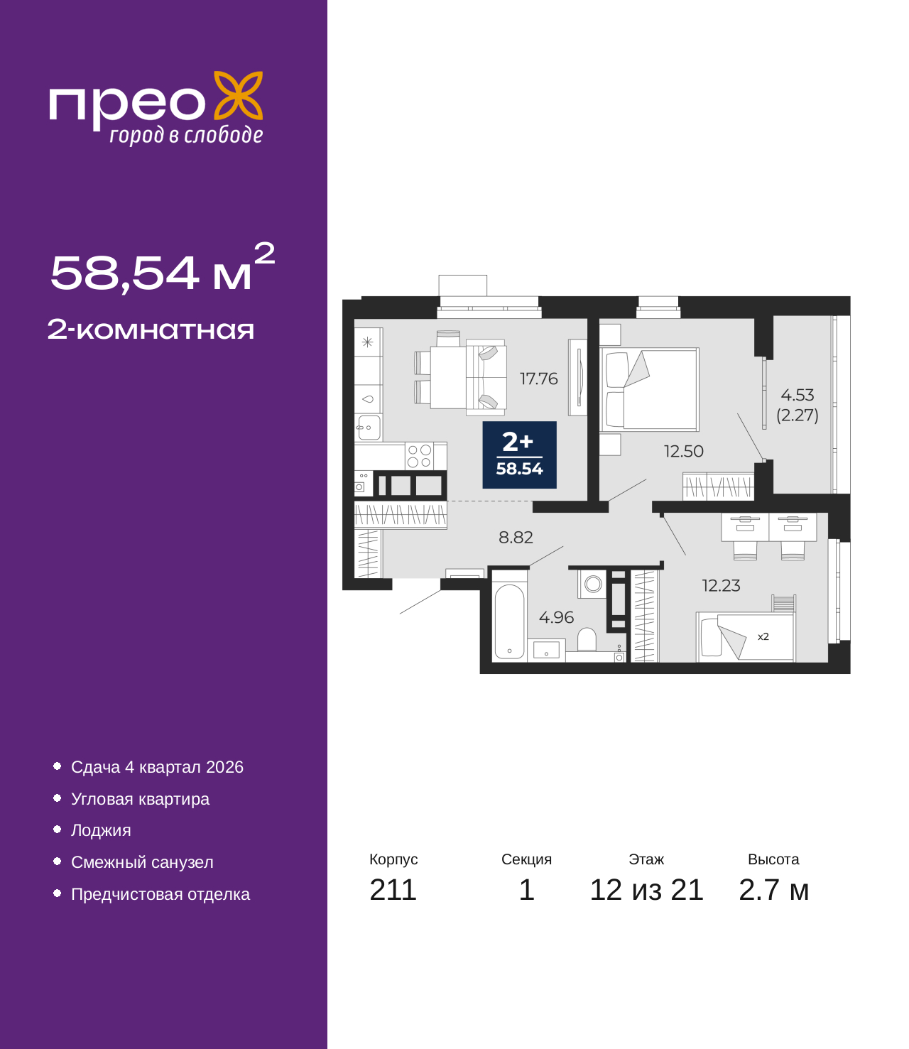 Просторная 2-комн. квартира с предчистовой отделкой в ЖК "Прео" на 12 этаже. Общая площадь: 58.54 кв.м., жилая: 24.73 кв.м., площадь просторной кухни-столовой: 17.76 кв.м. Угловая квартира, окна oбecпeчивaют paвнoмepнoe ocвeщeниe в тeчeниe дня. В квартире одна лоджия, один совмещенный санузел. Высота потолков 2.7 м. Дом монолитный, черырехподъездный, переменной этажности, от 14 до 21 этажей. Квартира находится в 1-й секции высотой 21 этаж в корпусе 211. На этаже 8 квартир. В подъезде 1 пассажирский и 1 грузовой лифт. Окончание строительства - 4 квартал 2026 года. Оформление сделки по договору долевого участия. Преображенский — один из самых привлекательных районов для жизни! Это полностью самостоятельный жилой район с точки зрения инфраструктуры. Преображенский находится между Московским и Червишевским трактами в квартале улиц Закалужская — Вьюжная — Александра Протозанова. Не нужно ждать, когда появится инфраструктура — переезжайте на всё готовое. Вблизи расположены действующие школа и детский сад. В этом году откроется еще один сад, а в следующем году — школа. По соседству с Преображенским запланировано строительство городского парка «Комарово» площадью 38 гектар. За 10 минут можно доехать на автомобиле до крупных ТРЦ: «Лента», «Кристалл», «Леруа Мерлен», «Метро» и «Ашан». С 2018 года в районе открыт Соседский центр — пространство, созданное для формирования добрососедской среды, совместного досуга, общения и реализации соседских инициатив. Здесь проходят встречи соседей, а также сами жители района организовывают мероприятия. Организатором такого события может стать любой желающий. В квартирах выполнена качественная предчистовая отделка. Гладкие стены с финишным выравниванием по маякам. Ровный потолок для установки натяжного потолка. Установлены пятикамерные окна с двойным стеклопакетом (3 стекла). Дизайнерские холлы с видеонаблюдением, безбарьерным и прозрачным входом – всегда светло и спокойно. На первом этаже есть просторные колясочные, где все жители могут оставлять свои коляски и велосипеды. В Преображенском есть всё, что нужно для активного отдыха и занятий спортом. Мы сделали большое футбольное поле с безопасным покрытием. Также установили хоккейный корт, который оборудован по всем необходимым стандартам. Во дворах можно делать упражнения на специальных площадках с турниками. Весь район мы обустроили велодорожками, которые связаны в единый маршрут. У нас есть сухие фонтаны, бьющие из земли, деревья, веревки, сетки, скалодром, газон, песок и резинка — осталось просто дать своему ребенку право на свободную игру. По-настоящему хорошие дворы — это те, которые дети предпочитают соцсетям и телевизору. Аккредитация в банках: «Сбербанк России», ОАО «Альфа-Банк», ПАО Банк «ВТБ», ПАО «Газпромбанк», ПАО «Банк Уралсиб» и других. (AQID02427644)
