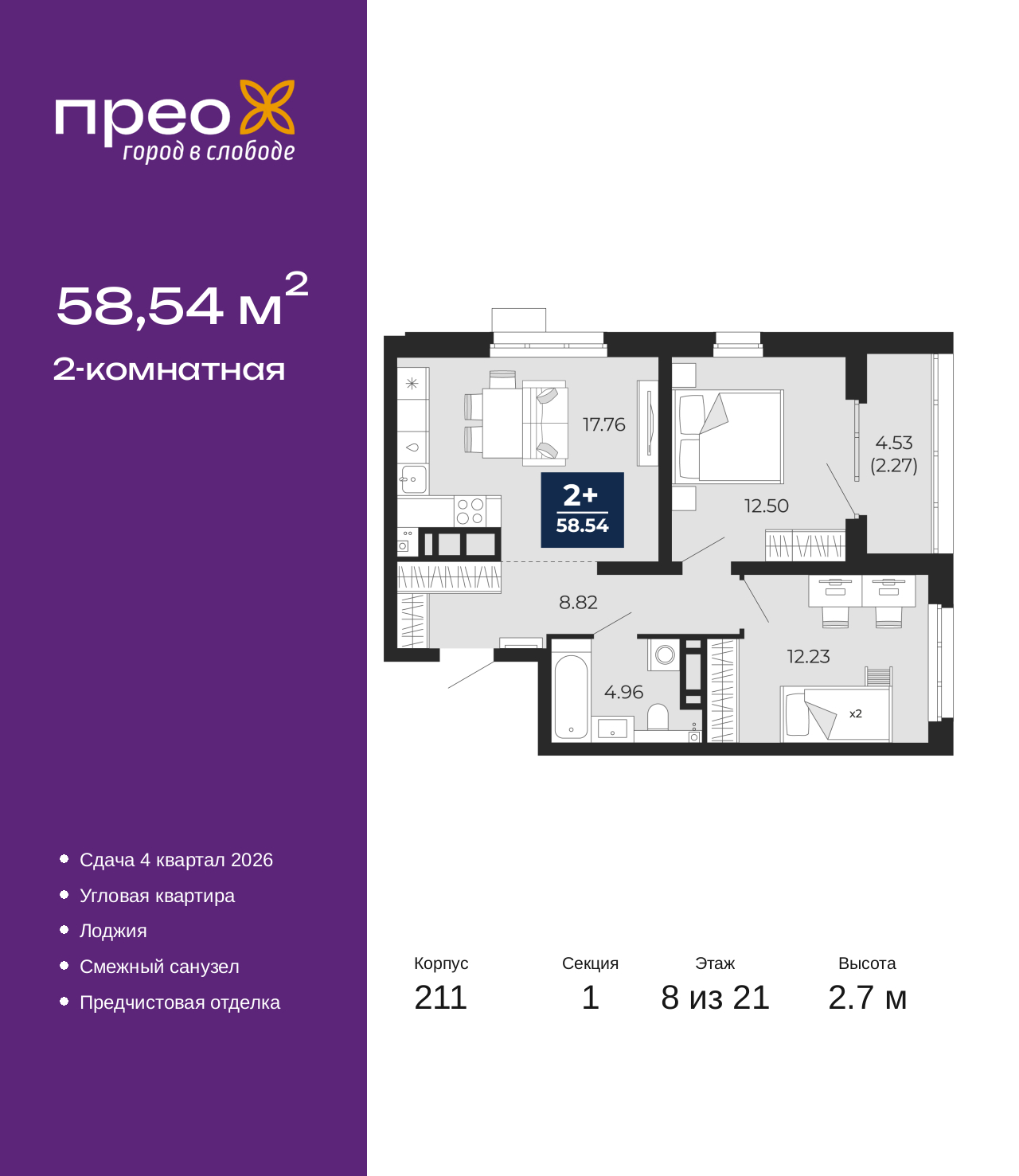 Продается 2-комн. квартира с предчистовой отделкой в ЖК "Прео" на 8 этаже. Общая площадь: 58.54 кв.м., жилая: 24.73 кв.м., площадь просторной кухни-столовой: 17.76 кв.м. Квартира угловая, идеально подойдет любителям тишины и панорамных видов. В квартире одна лоджия, один совмещенный санузел. Высота потолков 2.7 м. Дом монолитный, черырехподъездный, переменной этажности, от 14 до 21 этажей. Квартира находится в 1-й секции высотой 21 этаж в корпусе 211. На этаже 8 квартир. В подъезде 1 пассажирский и 1 грузовой лифт. Окончание строительства - 4 квартал 2026 года. Оформление сделки по договору долевого участия. Преображенский — один из самых привлекательных районов для жизни! Это полностью самостоятельный жилой район с точки зрения инфраструктуры. Преображенский находится между Московским и Червишевским трактами в квартале улиц Закалужская — Вьюжная — Александра Протозанова. Не нужно ждать, когда появится инфраструктура — переезжайте на всё готовое. Вблизи расположены действующие школа и детский сад. В этом году откроется еще один сад, а в следующем году — школа. По соседству с Преображенским запланировано строительство городского парка «Комарово» площадью 38 гектар. За 10 минут можно доехать на автомобиле до крупных ТРЦ: «Лента», «Кристалл», «Леруа Мерлен», «Метро» и «Ашан». С 2018 года в районе открыт Соседский центр — пространство, созданное для формирования добрососедской среды, совместного досуга, общения и реализации соседских инициатив. Здесь проходят встречи соседей, а также сами жители района организовывают мероприятия. Организатором такого события может стать любой желающий. В квартирах выполнена качественная предчистовая отделка. Гладкие стены с финишным выравниванием по маякам. Ровный потолок для установки натяжного потолка. Установлены пятикамерные окна с двойным стеклопакетом (3 стекла). Дизайнерские холлы с видеонаблюдением, безбарьерным и прозрачным входом – всегда светло и спокойно. На первом этаже есть просторные колясочные, где все жители могут оставлять свои коляски и велосипеды. В Преображенском есть всё, что нужно для активного отдыха и занятий спортом. Мы сделали большое футбольное поле с безопасным покрытием. Также установили хоккейный корт, который оборудован по всем необходимым стандартам. Во дворах можно делать упражнения на специальных площадках с турниками. Весь район мы обустроили велодорожками, которые связаны в единый маршрут. У нас есть сухие фонтаны, бьющие из земли, деревья, веревки, сетки, скалодром, газон, песок и резинка — осталось просто дать своему ребенку право на свободную игру. По-настоящему хорошие дворы — это те, которые дети предпочитают соцсетям и телевизору. Аккредитация в банках: ПАО Банк «ВТБ», ПАО «Газпромбанк», «Сбербанк России», ОАО «Альфа-Банк», ПАО «Банк Уралсиб» и других. (AQID02427651)
