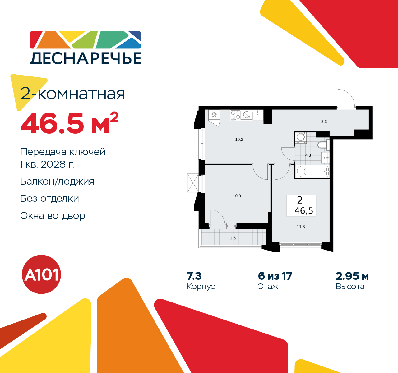 Двухкомнатная квартира от застройщика в ЖК "Деснаречье" на 6 этаже. Квартира без отделки, после выдачи ключей можно делать ремонт. Общая площадь: 46.5 кв.м., жилая: 22.2 кв.м., площадь просторной кухни-столовой: 10.2 кв.м. Квартира угловая, окна oбecпeчивaют paвнoмepнoe ocвeщeниe в тeчeниe дня. В квартире одна лоджия, один совмещенный санузел. Высота потолков 2.95 м. Эта квартира предлагается без отделки. Будут установлены стеклопакеты с повышенной тепло- и шумоизоляцией, в квартиру заведены все коммуникации. Вы сможете в полном объеме реализовать ваши идеи обустройства вашего комфортного дома. Для тех, кто ценит время и не хочет дополнительных трат на ремонт мы предлагаем квартиры с предчистовой и дизайнерской отделкой. Дом монолитный, черырехподъездный, переменной этажности, от 9 до 17 этажей. Квартира находится в 1-й секции высотой 15 этажей в корпусе 7.3. На этаже 5 квартир. В подъезде 1 пассажирский и 1 грузовой лифт. Начало строительства - 2 квартал 2025 года. Окончание строительства - 1 квартал 2028 года. Оформление сделки по договору долевого участия. Артикул квартиры по базе застройщика 88К-7.3-612. ПРЕДЛОЖЕНИЯ ОТ ЗАСТРОЙЩИКА В ОКТЯБРЕ 2025: Ипотека от 13,9 % для всех! На весь срок. "Семейная ипотека" вернулась. Ставка от 3,5 % на весь срок! Без удорожания! Выгодное ипотечное комбо: Ипотека от 2200 р./мес. и от 6 % после рождения ребёнка! Ипотека для всех "Держи пять!" - ставка 5 % на 2 года! *более подробную информацию по скидкам и акциям уточняйте в отделе продаж Масштабный проект "Деснаречье" на юго-западе Москвы, который включает три новых района («квартала»), объединённые общей идеей – воплотить в реальность мечты современных жителей столицы об интересном, комфортном и разноплановом городском пространстве в окружении рек и лесов, словно сошедших с полотен русских живописцев: - «Берег» оценят все, кому близка водная стихия: плеск волн, солнечные блики и прогулки вдоль тихого течения речи. - «Лес» утопает в зелени парков и лесов. Здесь соблюдён идеальный баланс загородного спокойствия и столичного комфорта. - «Парк», самый энергичный и яркий, отличается высокой концентрацией пространств для спорта и творчества. Жилой комплекс "Деснаречье" расположится в 12 км от МКАД по современному Калужскому шоссе. Внешний облик зданий соответствует современному стилю и стандартам, характерным и для других популярных проектов ГК «А101»: сочетание контрастных тонов, большое количество остекления, в котором отражается небо, гармония с природным окружением. Весь город - в вашем районе. Находиться на территории «15-минутного города» значит иметь всё необходимое для полноценной жизни в шаговой доступности. Маршруты в районе «Деснаречье» выстроены так, чтобы добраться до магазинов, парков, школ, салонов услуг и других объектов можно было всего за несколько минут пешком или на велосипеде. Двор закрытый от машин – это тишина, комфорт и безопасность, поэтому все машино-места (включая «семейные» и увеличенные, с возможностью установки роллетных шкафов) находятся в подземном паркинге. В паркинги можно спуститься на лифте из любого подъезда или по лестнице. Рядом с «Деснаречьем» в 2027 году планируется открытие станции метро «Десна», до которой будет удобно добраться пешком или на велосипеде. Дорога на автомобиле до перехватывающих парковок станций «Ольховая» и «Прокшино» займёт около 10 минут. В про
