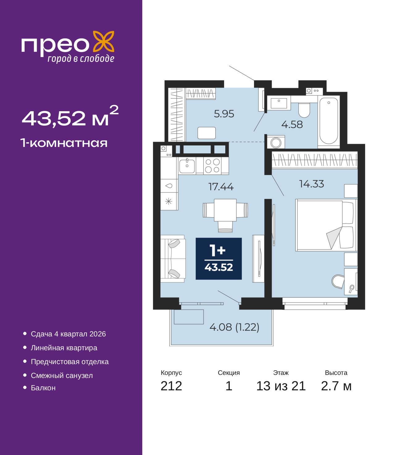 Продается однокомнатная квартира от застройщика с предчистовой отделкой в ЖК "Прео" на 13 этаже. Общая площадь: 43.52 кв.м., жилая: 14.33 кв.м., площадь просторной кухни-столовой: 17.44 кв.м. Все окна выходят на одну сторону. В квартире один балкон, один совмещенный санузел. Высота потолков 2.7 м. Квартира находится в корпусе 212. Дом монолитный, одноподъездный, высотой 21 этаж. На этаже 8 квартир. В подъезде 2 пассажирских и 1 грузовой лифт. Окончание строительства - 4 квартал 2026 года. Оформление сделки по договору долевого участия. Преображенский — один из самых привлекательных районов для жизни! Это полностью самостоятельный жилой район с точки зрения инфраструктуры. Преображенский находится между Московским и Червишевским трактами в квартале улиц Закалужская — Вьюжная — Александра Протозанова. Не нужно ждать, когда появится инфраструктура — переезжайте на всё готовое. Вблизи расположены действующие школа и детский сад. В этом году откроется еще один сад, а в следующем году — школа. По соседству с Преображенским запланировано строительство городского парка «Комарово» площадью 38 гектар. За 10 минут можно доехать на автомобиле до крупных ТРЦ: «Лента», «Кристалл», «Леруа Мерлен», «Метро» и «Ашан». С 2018 года в районе открыт Соседский центр — пространство, созданное для формирования добрососедской среды, совместного досуга, общения и реализации соседских инициатив. Здесь проходят встречи соседей, а также сами жители района организовывают мероприятия. Организатором такого события может стать любой желающий. В квартирах выполнена качественная предчистовая отделка. Гладкие стены с финишным выравниванием по маякам. Ровный потолок для установки натяжного потолка. Установлены пятикамерные окна с двойным стеклопакетом (3 стекла). Дизайнерские холлы с видеонаблюдением, безбарьерным и прозрачным входом – всегда светло и спокойно. На первом этаже есть просторные колясочные, где все жители могут оставлять свои коляски и велосипеды. В Преображенском есть всё, что нужно для активного отдыха и занятий спортом. Мы сделали большое футбольное поле с безопасным покрытием. Также установили хоккейный корт, который оборудован по всем необходимым стандартам. Во дворах можно делать упражнения на специальных площадках с турниками. Весь район мы обустроили велодорожками, которые связаны в единый маршрут. У нас есть сухие фонтаны, бьющие из земли, деревья, веревки, сетки, скалодром, газон, песок и резинка — осталось просто дать своему ребенку право на свободную игру. По-настоящему хорошие дворы — это те, которые дети предпочитают соцсетям и телевизору. Аккредитация в банках: ПАО «Газпромбанк», «Сбербанк России», ПАО «Банк Уралсиб», ОАО «Альфа-Банк», ПАО Банк «ВТБ» и других. (AQID02514878)