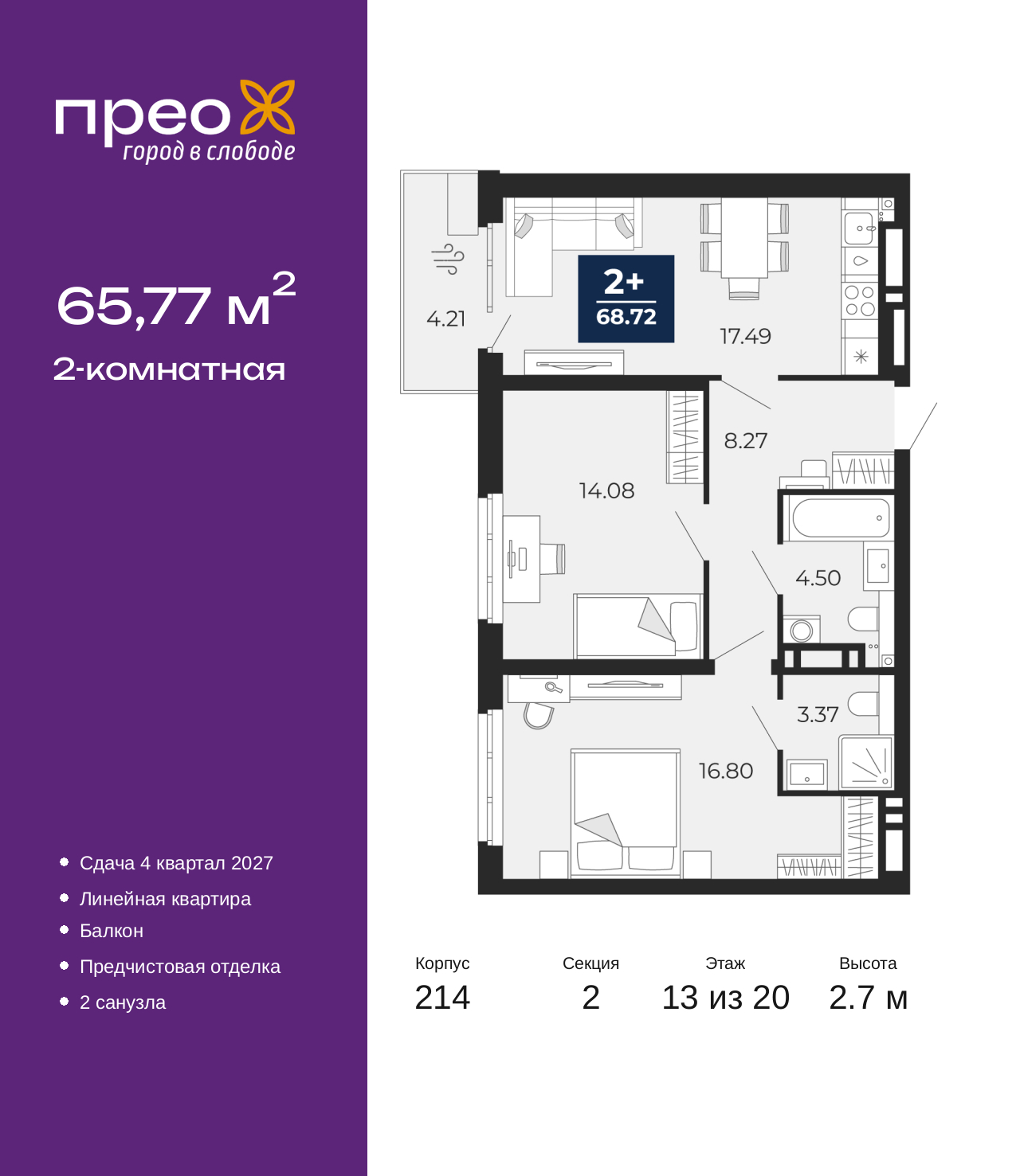 Продается 2-комн. квартира с предчистовой отделкой в ЖК "Прео" на 13 этаже. Общая площадь: 65.77 кв.м., жилая: 30.88 кв.м., площадь просторной кухни-столовой: 17.49 кв.м. Комнаты изолированные, все окна выходят на одну сторону. В квартире один балкон, два совмещенных санузла. Высота потолков 2.7 м. Дом монолитный, двухподъездный, переменной этажности, от 12 до 20 этажей. Квартира находится во 2-й секции высотой 20 этажей в корпусе 214. На этаже 8 квартир. В подъезде 1 пассажирский и 1 грузовой лифт. Окончание строительства - 4 квартал 2027 года. Оформление сделки по договору долевого участия. Преображенский — один из самых привлекательных районов для жизни! Это полностью самостоятельный жилой район с точки зрения инфраструктуры. Преображенский находится между Московским и Червишевским трактами в квартале улиц Закалужская — Вьюжная — Александра Протозанова. Не нужно ждать, когда появится инфраструктура — переезжайте на всё готовое. Вблизи расположены действующие школа и детский сад. В этом году откроется еще один сад, а в следующем году — школа. По соседству с Преображенским запланировано строительство городского парка «Комарово» площадью 38 гектар. За 10 минут можно доехать на автомобиле до крупных ТРЦ: «Лента», «Кристалл», «Леруа Мерлен», «Метро» и «Ашан». С 2018 года в районе открыт Соседский центр — пространство, созданное для формирования добрососедской среды, совместного досуга, общения и реализации соседских инициатив. Здесь проходят встречи соседей, а также сами жители района организовывают мероприятия. Организатором такого события может стать любой желающий. В квартирах выполнена качественная предчистовая отделка. Гладкие стены с финишным выравниванием по маякам. Ровный потолок для установки натяжного потолка. Установлены пятикамерные окна с двойным стеклопакетом (3 стекла). Дизайнерские холлы с видеонаблюдением, безбарьерным и прозрачным входом – всегда светло и спокойно. На первом этаже есть просторные колясочные, где все жители могут оставлять свои коляски и велосипеды. В Преображенском есть всё, что нужно для активного отдыха и занятий спортом. Мы сделали большое футбольное поле с безопасным покрытием. Также установили хоккейный корт, который оборудован по всем необходимым стандартам. Во дворах можно делать упражнения на специальных площадках с турниками. Весь район мы обустроили велодорожками, которые связаны в единый маршрут. У нас есть сухие фонтаны, бьющие из земли, деревья, веревки, сетки, скалодром, газон, песок и резинка — осталось просто дать своему ребенку право на свободную игру. По-настоящему хорошие дворы — это те, которые дети предпочитают соцсетям и телевизору. Аккредитация в банках: «Сбербанк России», ОАО «Альфа-Банк», ПАО «Газпромбанк», ПАО «Банк Уралсиб», ПАО Банк «ВТБ» и других. (AQID02525616)