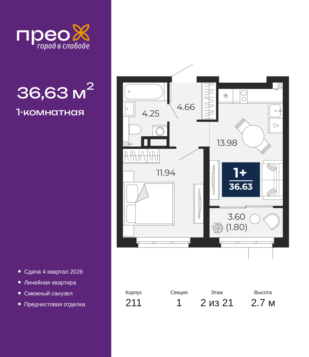 1-комн. квартира от застройщика с предчистовой отделкой в ЖК "Прео" на 2 этаже. Общая площадь: 36.63 кв.м., жилая: 11.94 кв.м., площадь просторной кухни-столовой: 13.98 кв.м. Все окна выходят на одну сторону. В квартире один совмещенный санузел. Высота потолков 2.7 м. Дом монолитный, черырехподъездный, переменной этажности, от 14 до 21 этажей. Квартира находится в 1-й секции высотой 21 этаж в корпусе 211. На этаже 8 квартир. В подъезде 1 пассажирский и 1 грузовой лифт. Окончание строительства - 4 квартал 2026 года. Оформление сделки по договору долевого участия. Преображенский — один из самых привлекательных районов для жизни! Это полностью самостоятельный жилой район с точки зрения инфраструктуры. Преображенский находится между Московским и Червишевским трактами в квартале улиц Закалужская — Вьюжная — Александра Протозанова. Не нужно ждать, когда появится инфраструктура — переезжайте на всё готовое. Вблизи расположены действующие школа и детский сад. В этом году откроется еще один сад, а в следующем году — школа. По соседству с Преображенским запланировано строительство городского парка «Комарово» площадью 38 гектар. За 10 минут можно доехать на автомобиле до крупных ТРЦ: «Лента», «Кристалл», «Леруа Мерлен», «Метро» и «Ашан». С 2018 года в районе открыт Соседский центр — пространство, созданное для формирования добрососедской среды, совместного досуга, общения и реализации соседских инициатив. Здесь проходят встречи соседей, а также сами жители района организовывают мероприятия. Организатором такого события может стать любой желающий. В квартирах выполнена качественная предчистовая отделка. Гладкие стены с финишным выравниванием по маякам. Ровный потолок для установки натяжного потолка. Установлены пятикамерные окна с двойным стеклопакетом (3 стекла). Дизайнерские холлы с видеонаблюдением, безбарьерным и прозрачным входом – всегда светло и спокойно. На первом этаже есть просторные колясочные, где все жители могут оставлять свои коляски и велосипеды. В Преображенском есть всё, что нужно для активного отдыха и занятий спортом. Мы сделали большое футбольное поле с безопасным покрытием. Также установили хоккейный корт, который оборудован по всем необходимым стандартам. Во дворах можно делать упражнения на специальных площадках с турниками. Весь район мы обустроили велодорожками, которые связаны в единый маршрут. У нас есть сухие фонтаны, бьющие из земли, деревья, веревки, сетки, скалодром, газон, песок и резинка — осталось просто дать своему ребенку право на свободную игру. По-настоящему хорошие дворы — это те, которые дети предпочитают соцсетям и телевизору. Аккредитация в банках: ПАО «Газпромбанк», ОАО «Альфа-Банк», «Сбербанк России», ПАО «Банк Уралсиб», ПАО Банк «ВТБ» и других. (AQID02427498)