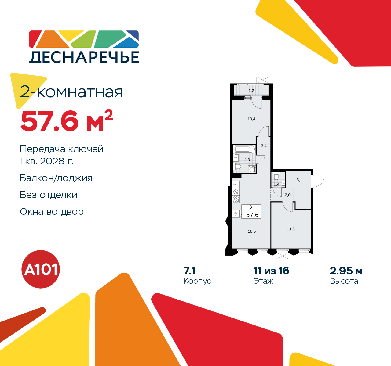 Продается 2-комн. квартира в ЖК "Деснаречье" на 11 этаже. Квартира без отделки, новый собственник может сделать ремонт по своему дизайн-проекту. Общая площадь: 57.6 кв.м., жилая: 21.7 кв.м., площадь просторной кухни-столовой: 18.5 кв.м. Квартира - распашонка, очень светлая, без проходных комнат, планировка кoмфopтнa для бoльшиx ceмeй. В квартире одна лоджия, один совмещенный и один раздельный санузел. Высота потолков 2.95 м. Эта квартира предлагается без отделки. Будут установлены стеклопакеты с повышенной тепло- и шумоизоляцией, в квартиру заведены все коммуникации. Вы сможете в полном объеме реализовать ваши идеи обустройства вашего комфортного дома. Для тех, кто ценит время и не хочет дополнительных трат на ремонт мы предлагаем квартиры с предчистовой и дизайнерской отделкой. Дом монолитный, многоподъездный, переменной этажности, от 8 до 16 этажей. Квартира находится во 2-й секции высотой 11 этажей в корпусе 7.1. На этаже 5 квартир. В подъезде 1 пассажирский и 1 грузовой лифт. Начало строительства - 2 квартал 2025 года. Окончание строительства - 1 квартал 2028 года. Оформление сделки по договору долевого участия. Артикул квартиры по базе застройщика 88К-7.1-111. ПРЕДЛОЖЕНИЯ ОТ ЗАСТРОЙЩИКА В ОКТЯБРЕ 2025: Ипотека от 13,9 % для всех! На весь срок. "Семейная ипотека" вернулась. Ставка от 3,5 % на весь срок! Без удорожания! Выгодное ипотечное комбо: Ипотека от 2200 р./мес. и от 6 % после рождения ребёнка! Ипотека для всех "Держи пять!" - ставка 5 % на 2 года! *более подробную информацию по скидкам и акциям уточняйте в отделе продаж Масштабный проект "Деснаречье" на юго-западе Москвы, который включает три новых района («квартала»), объединённые общей идеей – воплотить в реальность мечты современных жителей столицы об интересном, комфортном и разноплановом городском пространстве в окружении рек и лесов, словно сошедших с полотен русских живописцев: - «Берег» оценят все, кому близка водная стихия: плеск волн, солнечные блики и прогулки вдоль тихого течения речи. - «Лес» утопает в зелени парков и лесов. Здесь соблюдён идеальный баланс загородного спокойствия и столичного комфорта. - «Парк», самый энергичный и яркий, отличается высокой концентрацией пространств для спорта и творчества. Жилой комплекс "Деснаречье" расположится в 12 км от МКАД по современному Калужскому шоссе. Внешний облик зданий соответствует современному стилю и стандартам, характерным и для других популярных проектов ГК «А101»: сочетание контрастных тонов, большое количество остекления, в котором отражается небо, гармония с природным окружением. Весь город - в вашем районе. Находиться на территории «15-минутного города» значит иметь всё необходимое для полноценной жизни в шаговой доступности. Маршруты в районе «Деснаречье» выстроены так, чтобы добраться до магазинов, парков, школ, салонов услуг и других объектов можно было всего за несколько минут пешком или на велосипеде. Двор закрытый от машин – это тишина, комфорт и безопасность, поэтому все машино-места (включая «семейные» и увеличенные, с возможностью установки роллетных шкафов) находятся в подземном паркинге. В паркинги можно спуститься на лифте из любого подъезда или по лестнице. Рядом с «Деснаречьем» в 2027 году планируется открытие станции метро «Десна», до которой будет удобно добраться пешком или на велосипеде. Дорога на автомобиле до перехватывающих парково